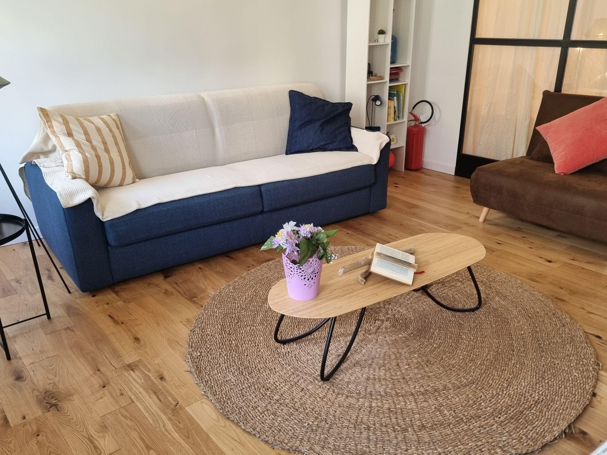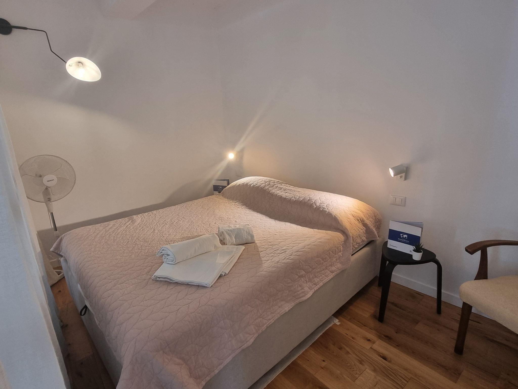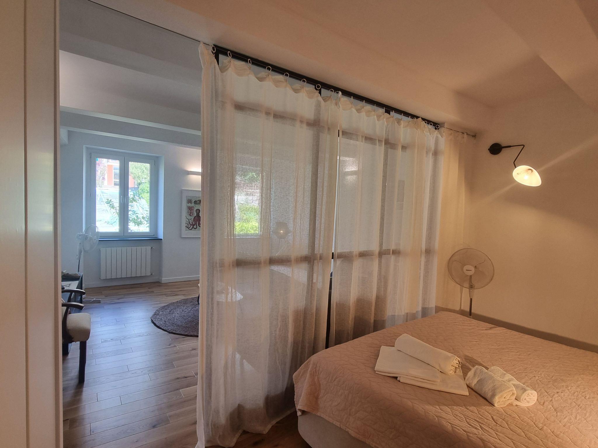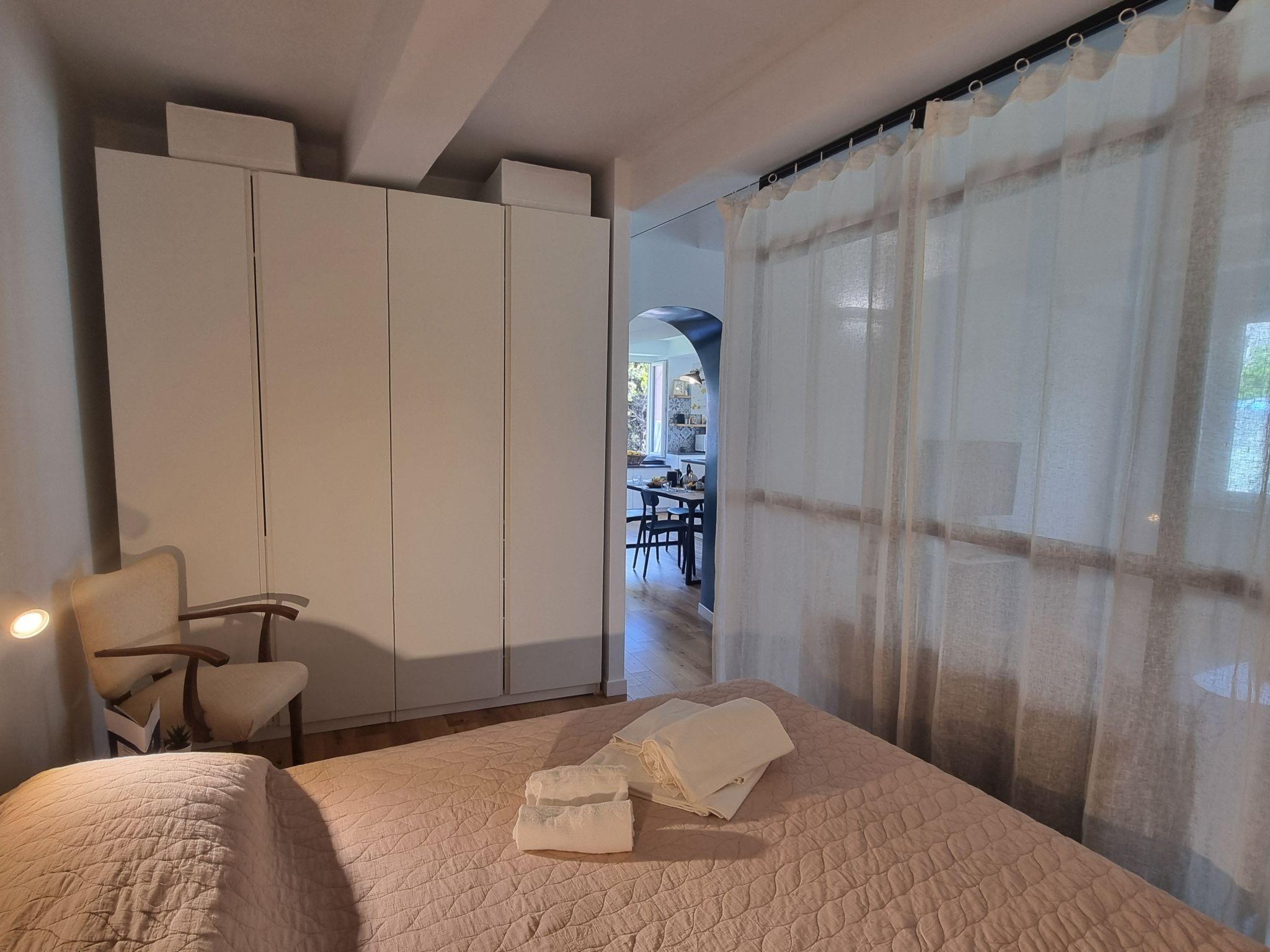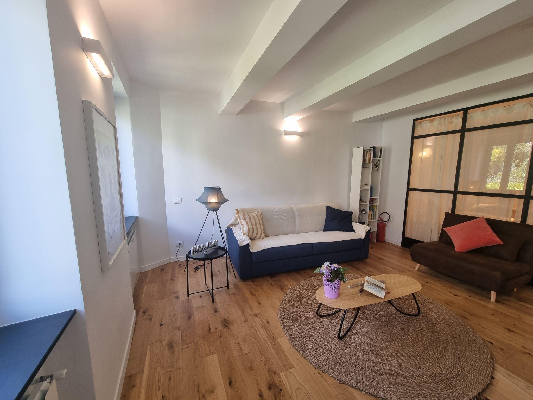 The flat's spaces are well distributed and designed to guarantee comfort: the kitchen is functional and overlooks a small balcony, ideal for an open-air breakfast. The dining area with its large table is perfect for convivial moments. The living room has a comfortable double sofa bed and is separated from the sleeping area by an elegant wood and glass panel with a curtain that creates an intimate and relaxing atmosphere. Wi-Fi and air conditioning are available to ensure a comfortable stay.