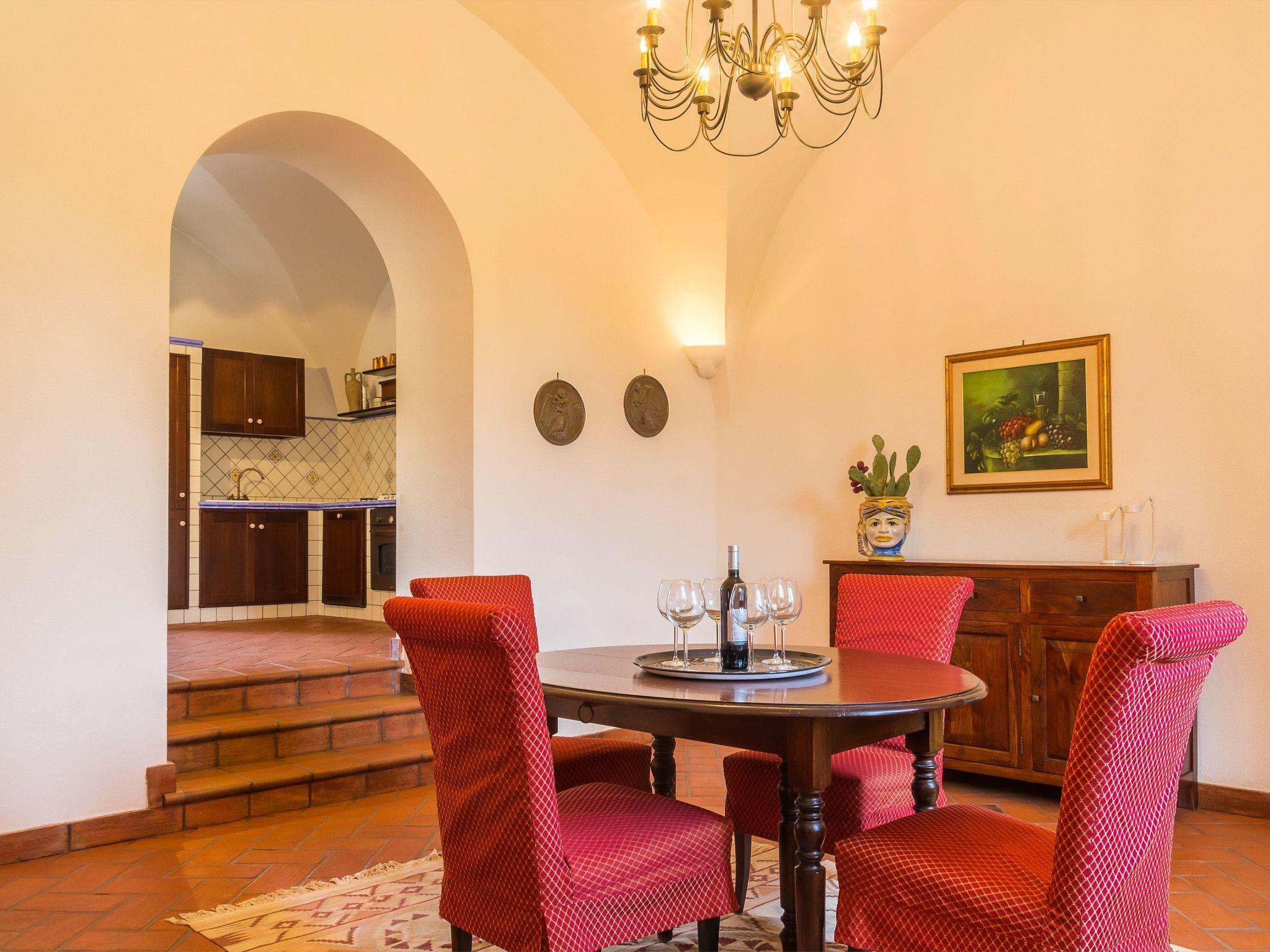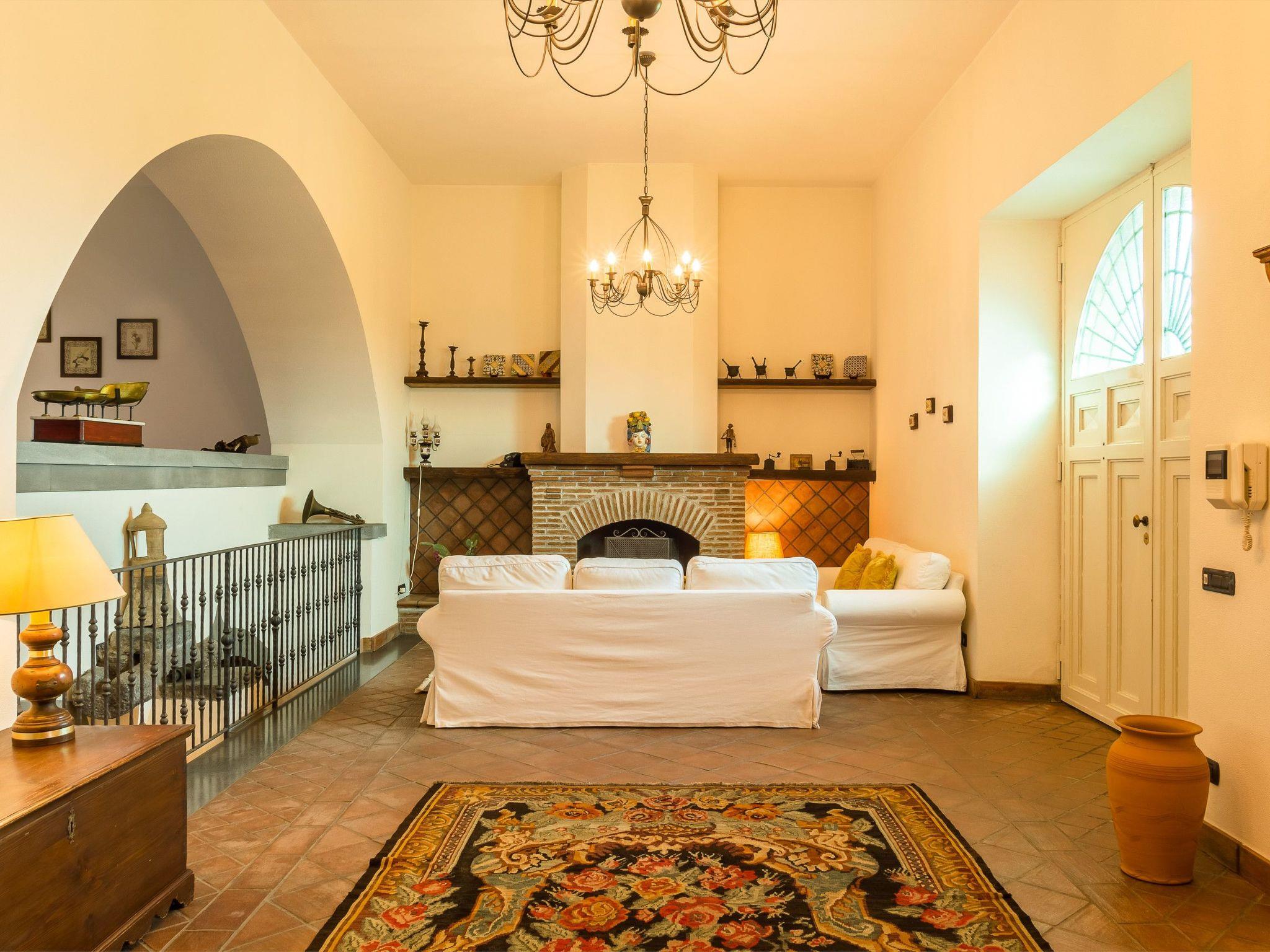 The house, with its own entrance, offers guests on the ground floor a large living room on two levels built in the old millstone with a characteristic fireplace, a reading and relaxation area in the area below the millstone, a dining area, a large and well-equipped kitchen with fireplace and a bathroom with shower, On the upper floor there are three bedrooms one double bedroom with king-size bed enjoying a view of the sea and citrus garden, the second double bedroom with a view of the Etna volcano and the enchanting swimming pool with garden, a third bedroom, with a view of the sea and citrus garden, equipped with two single beds that can be converted into a double bed if necessary, a bathroom on the floor with bathtub. The air-conditioned bedrooms are served by balconies and a large terrace.