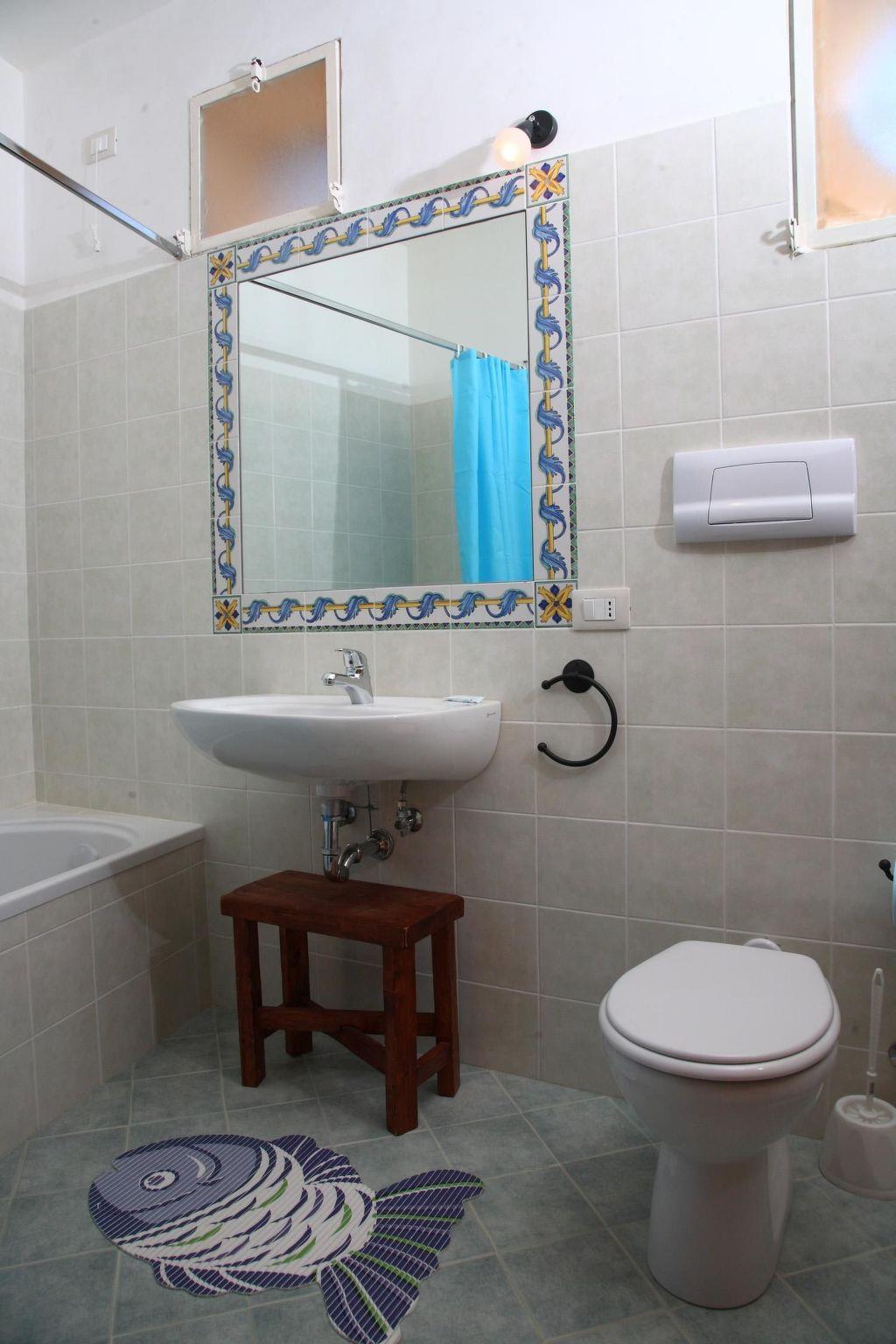 Two-storey flat for 5 persons + baby on two floors with internal stone staircase, carefully furnished of 75 sq m: 45 sq m on the ground floor with large living/dining room with double sofa-bed, separated by a curtain, with walk-in wardrobe, ante-bathroom, bathroom. The kitchenette is fully equipped; 30 sq m on the first floor with double bedroom (with the possibility of detaching the two beds) + single bed, walk-in wardrobe, bathroom. Large covered terrace 13 sq m habitable, with table and chairs. Splendid sea view and Aeolian Islands