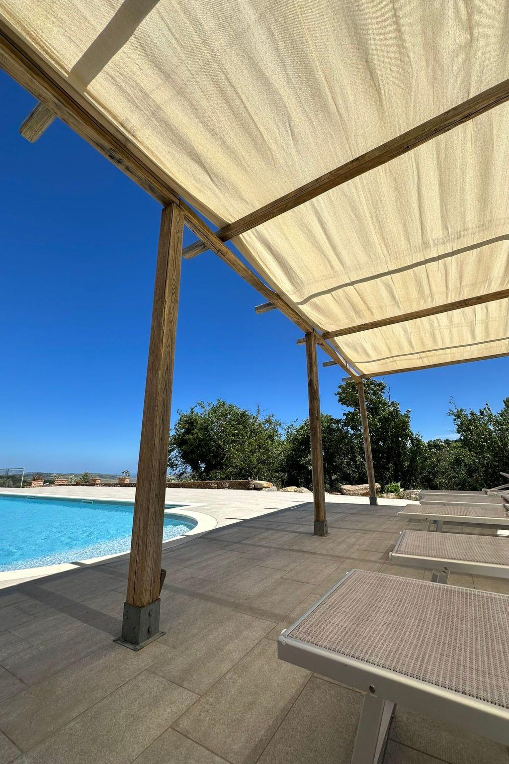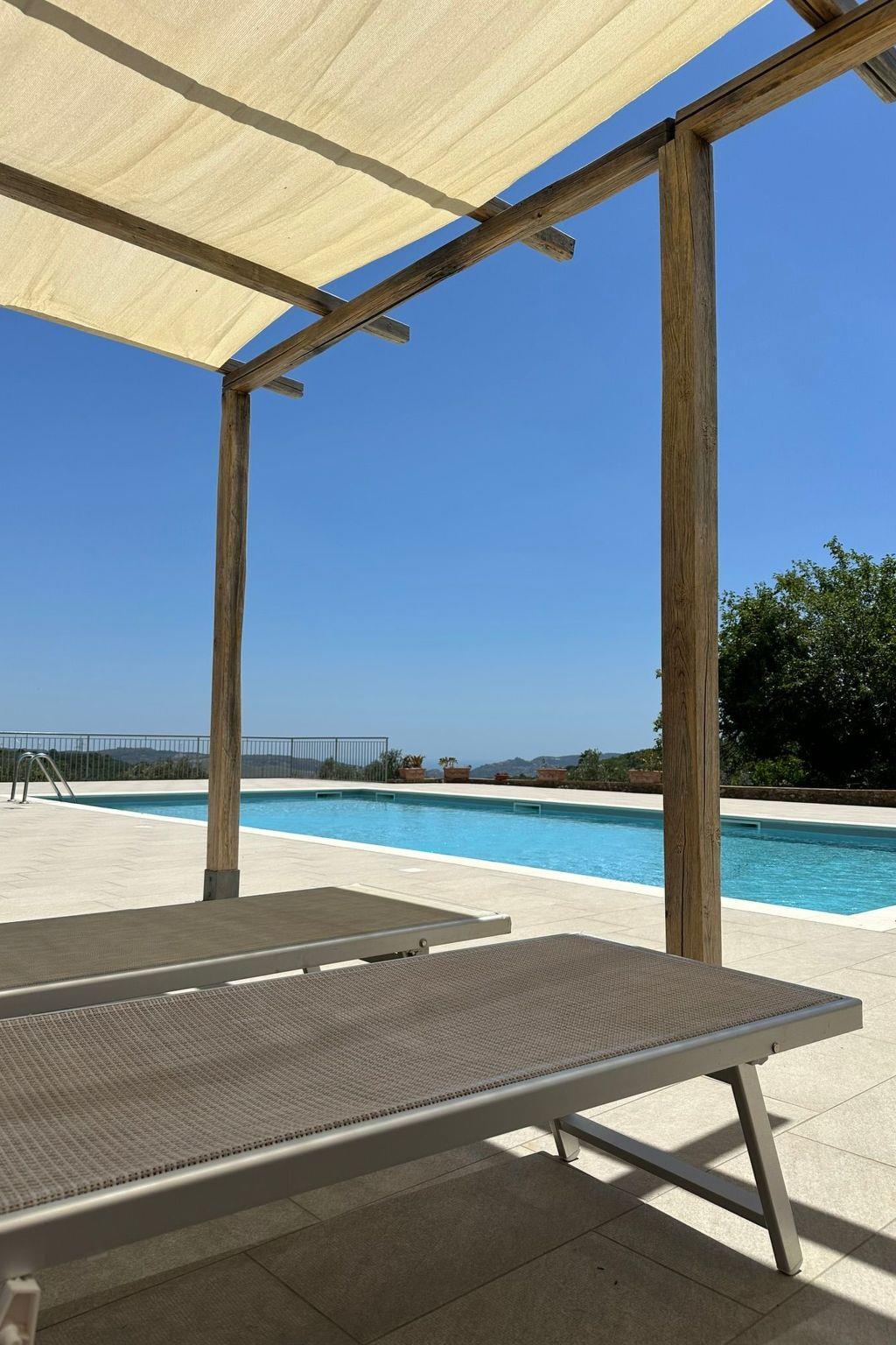 Outside, you can take full advantage of the Mediterranean climate - the terrace is the perfect place to enjoy the fresh air over a cosy meal. The garden and the communal pool area are true oases of relaxation. Imagine taking a dip in the spacious swimming pool, relaxing on the sun loungers under the pergola or strolling through the olive grove.