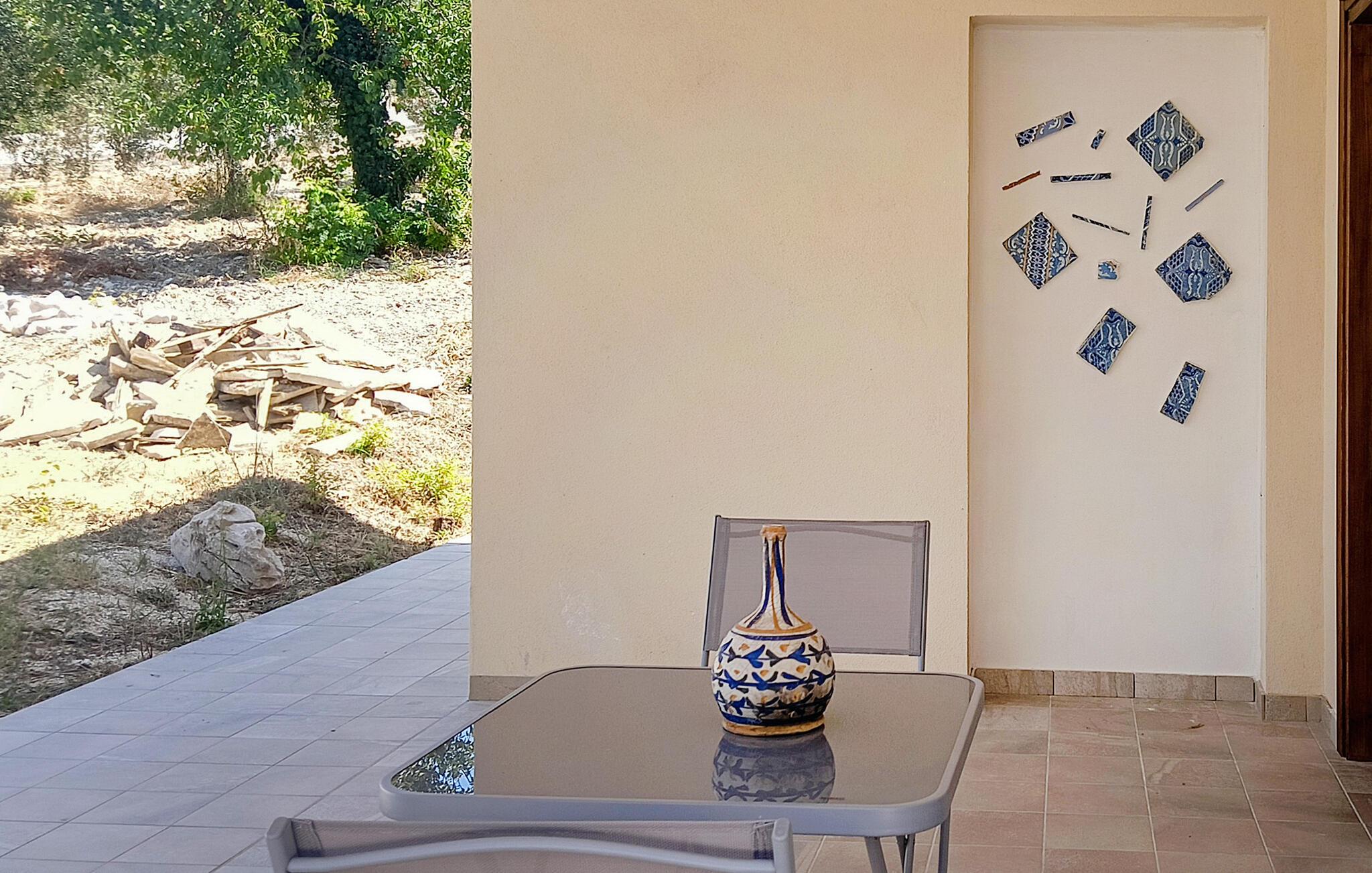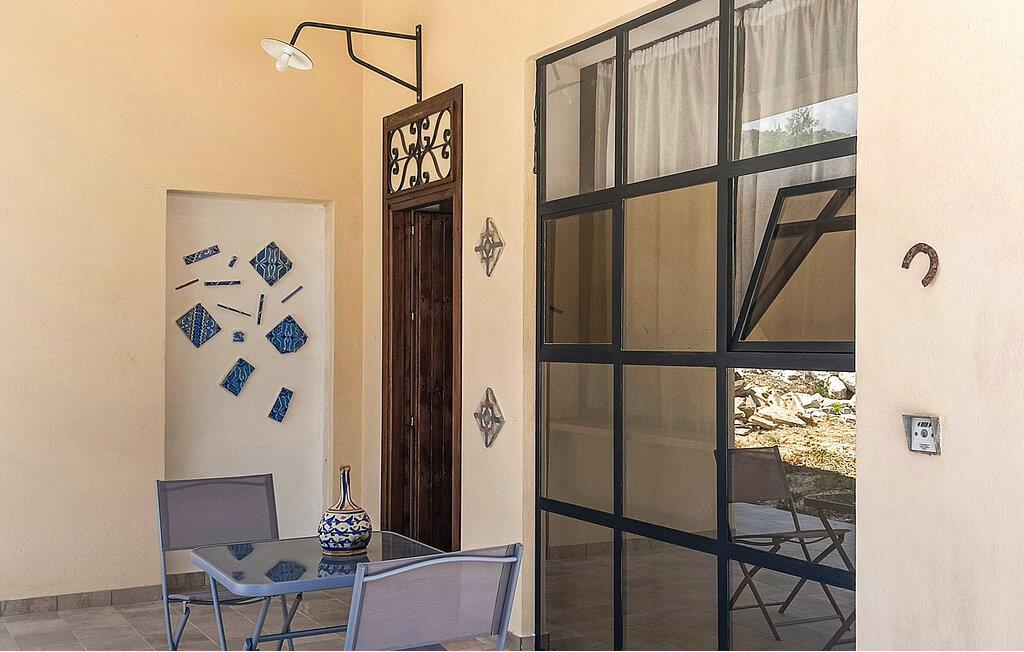 Træd ud på den overdækkede terrasse, og lad jer inspirere af de fredelige omgivelser. Tag plads ved det lille terrassebord og start dagen med en kop kaffe under åben himmel. Nyd udsigten til den grønne have, flankeret af oliventræer og bløde skråninger.