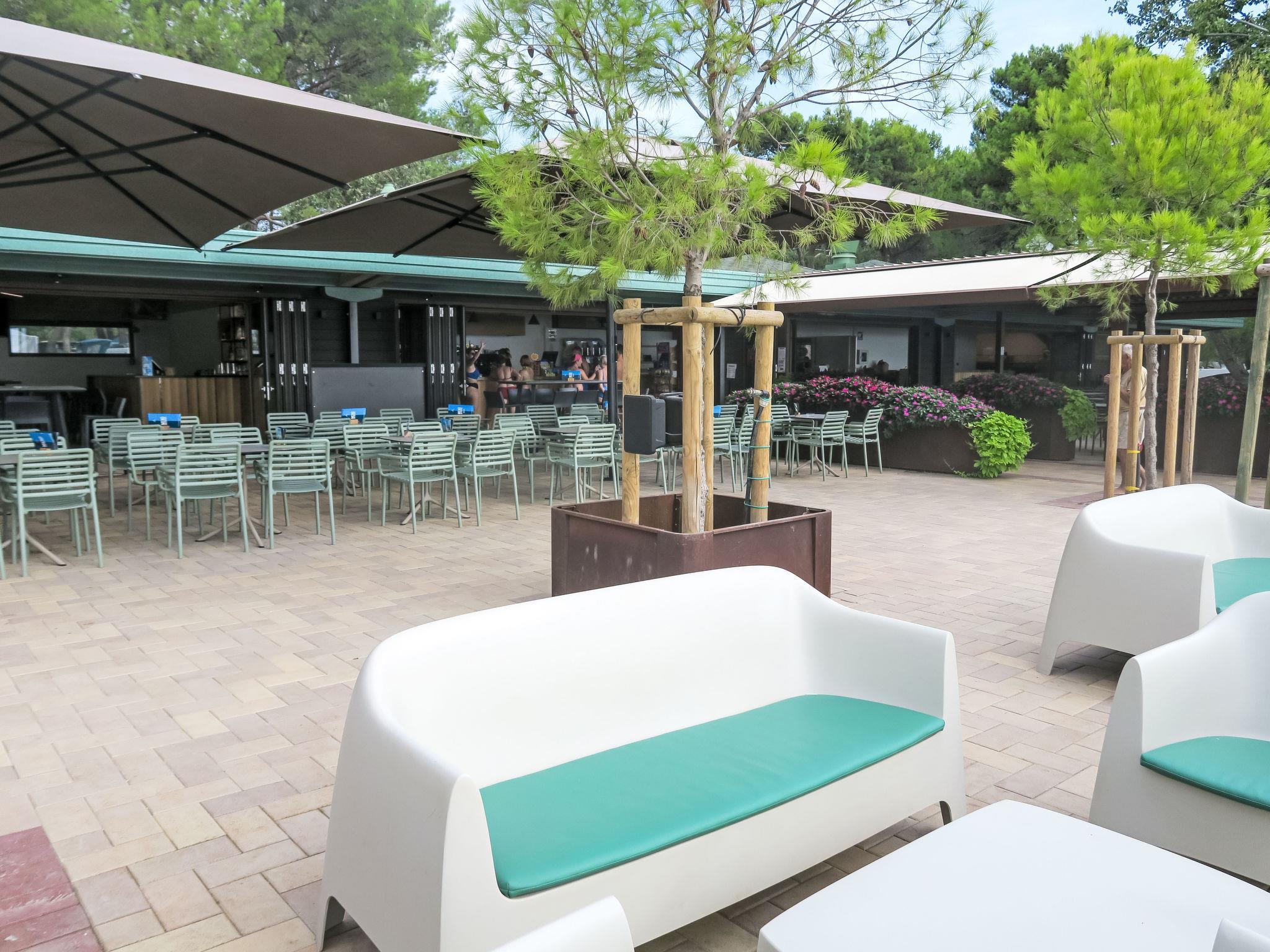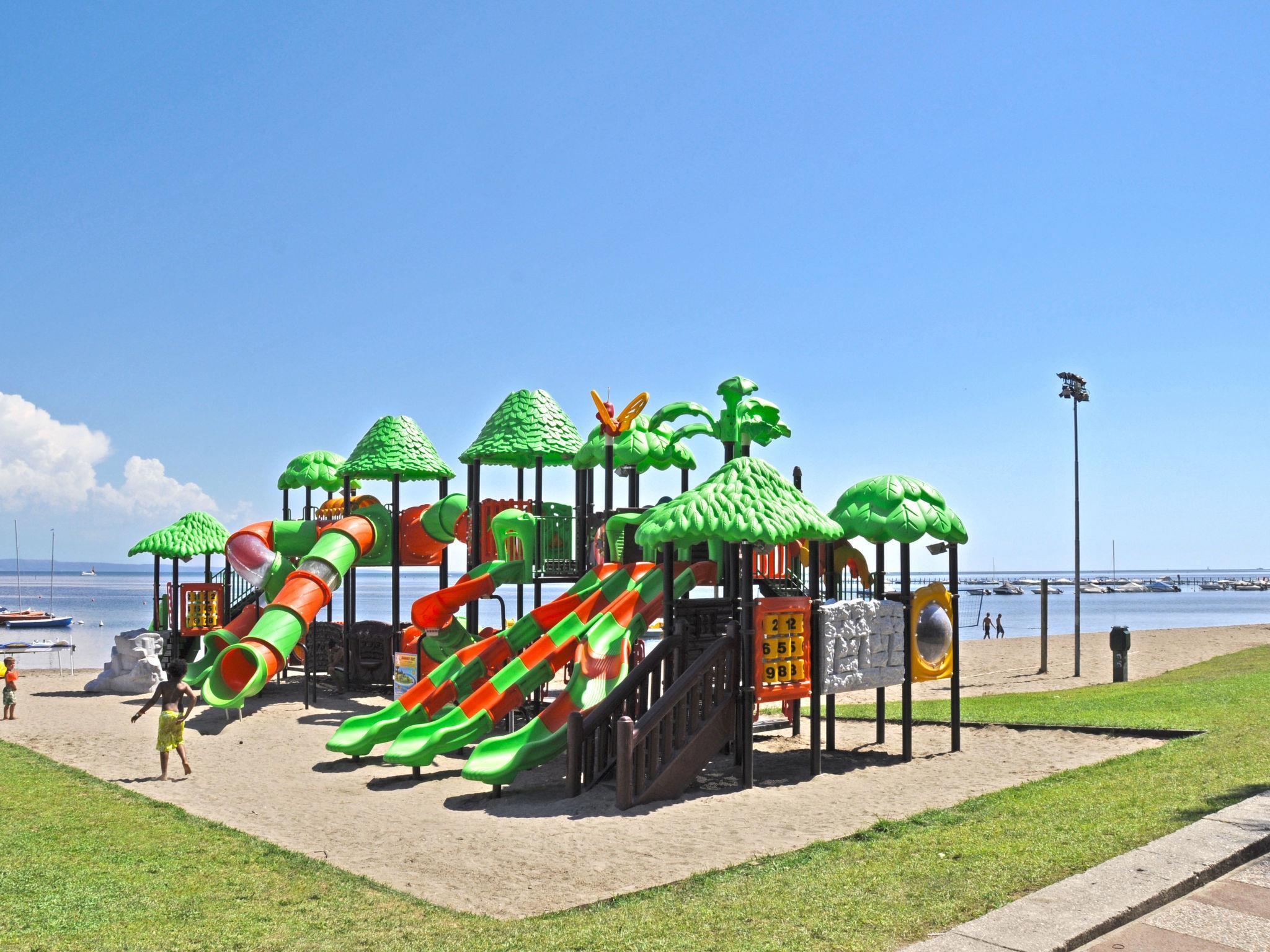 Grado: Very large, child friendly holiday village "Camping Europa 4*". 5 km from the centre of Grado, 50 km from the centre of Trieste, 130 km from the centre of Venezia, 20 m from the sea, direct access to the beach. For shared use: property 22 ha (fenced) with plants and trees, swimming pool (1'500 m2, seasonal availability: 23.Apr. - 27.Sep.). WC in the pool area, children's pool, slide, outdoor shower, tennis (1 x hard court), floodlit (extra), table tennis, beach volleyball, children's playground. In the complex: restaurant, bar, bistro, internet access, WiFi, shopping facilities, kiosk, washing machine, tumble dryer (for shared use, extra). Bus stop 500 m, railway station "Airport Station Trieste" 20 km. Nearby attractions: Castello di Duino 25 km, Riserva Naturale della Foce dell'Isonzo 14 km, Aquileia 16 km, Castello Miramare 40 km, Redipuglia 20 km, Collio 35 km. Please note: entertainment. Suitable for families. The electronic watch (included in the rental price) is the resort's exclusive means of payment and can be loaded online or in cash/by credit card during checkout hours. Beach service included (1 umbrella + 2 sunbeds per unit, for the whole season). Animation (whole season).