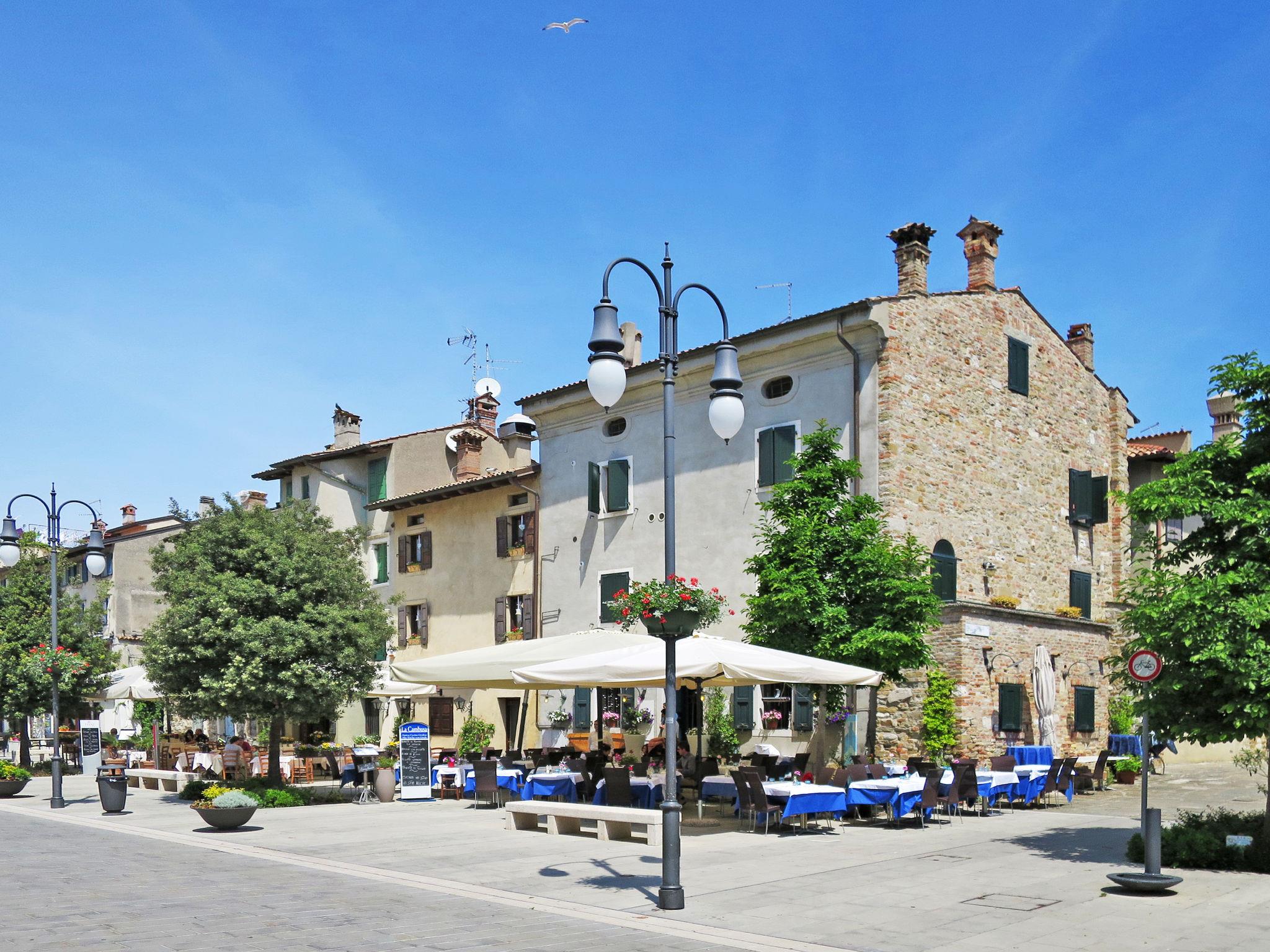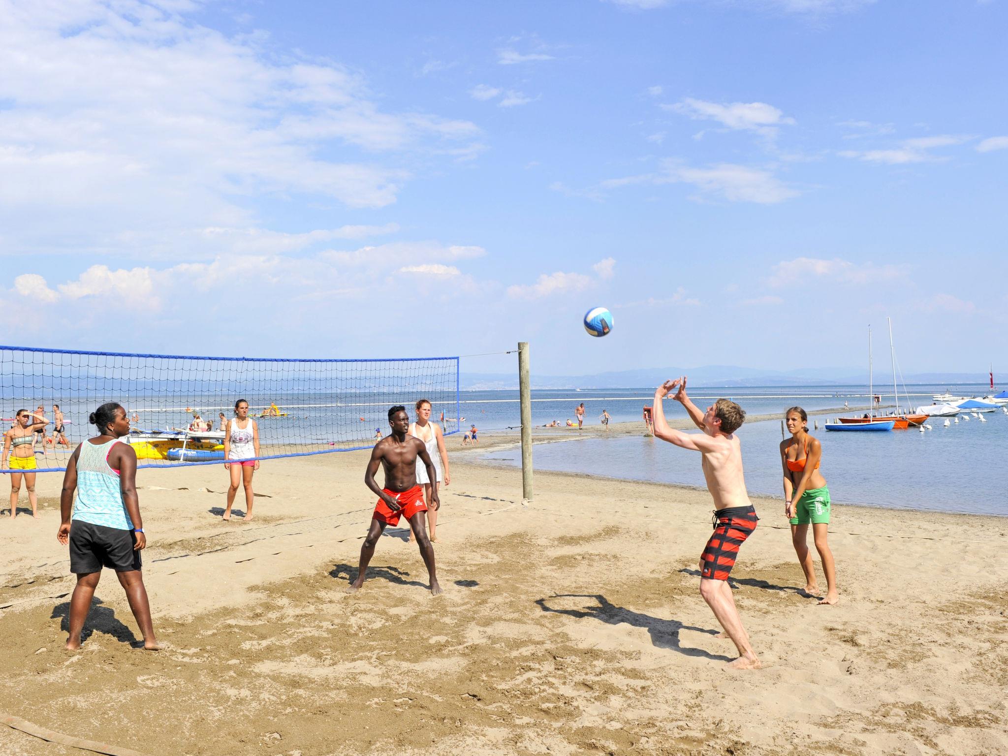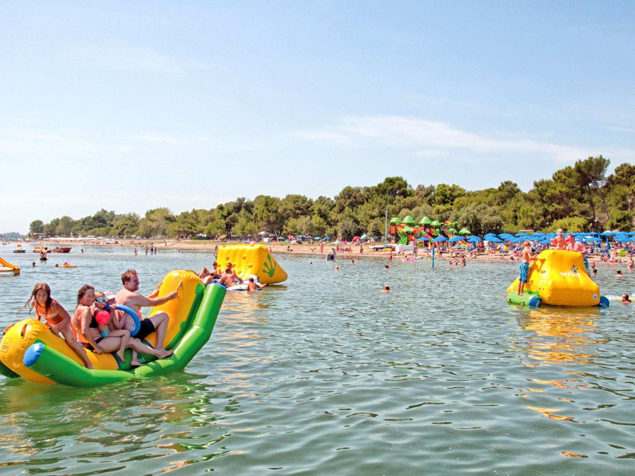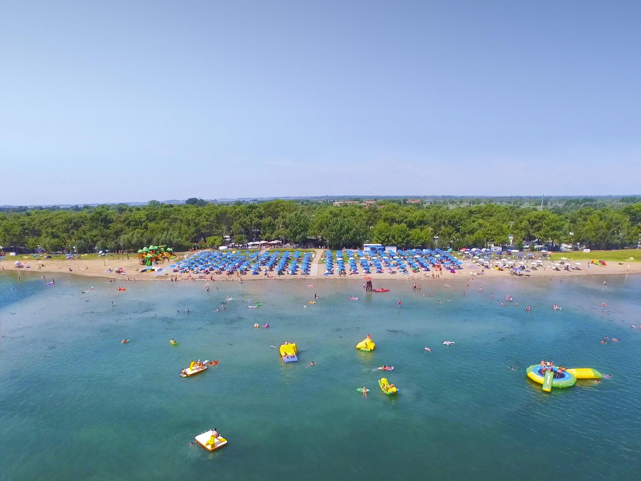 Grado: Very large, child friendly holiday village "Camping Europa 4*". 5 km from the centre of Grado, 50 km from the centre of Trieste, 130 km from the centre of Venezia, 20 m from the sea, direct access to the beach. For shared use: property 22 ha (fenced) with plants and trees, swimming pool (1'500 m2, seasonal availability: 23.Apr. - 27.Sep.). WC in the pool area, children's pool, slide, outdoor shower, tennis (1 x hard court), floodlit (extra), table tennis, beach volleyball, children's playground. In the complex: restaurant, bar, bistro, internet access, WiFi, shopping facilities, kiosk, washing machine, tumble dryer (for shared use, extra). Bus stop 500 m, railway station "Airport Station Trieste" 20 km. Nearby attractions: Castello di Duino 25 km, Riserva Naturale della Foce dell'Isonzo 14 km, Aquileia 16 km, Castello Miramare 40 km, Redipuglia 20 km, Collio 35 km. Please note: entertainment. Suitable for families. The electronic watch (included in the rental price) is the resort's exclusive means of payment and can be loaded online or in cash/by credit card during checkout hours. Beach service included (1 umbrella + 2 sunbeds per unit, for the whole season). Animation (whole season).
