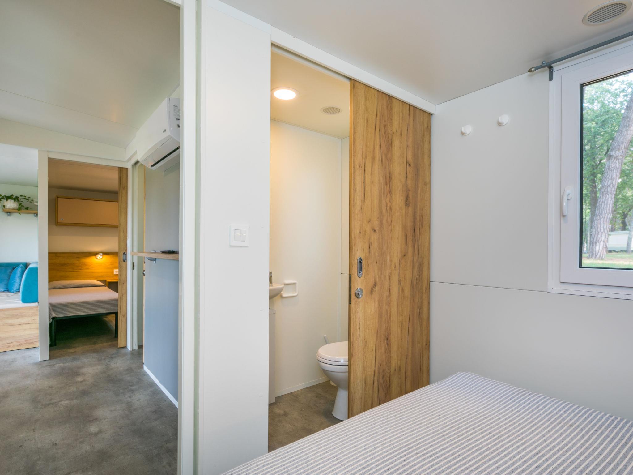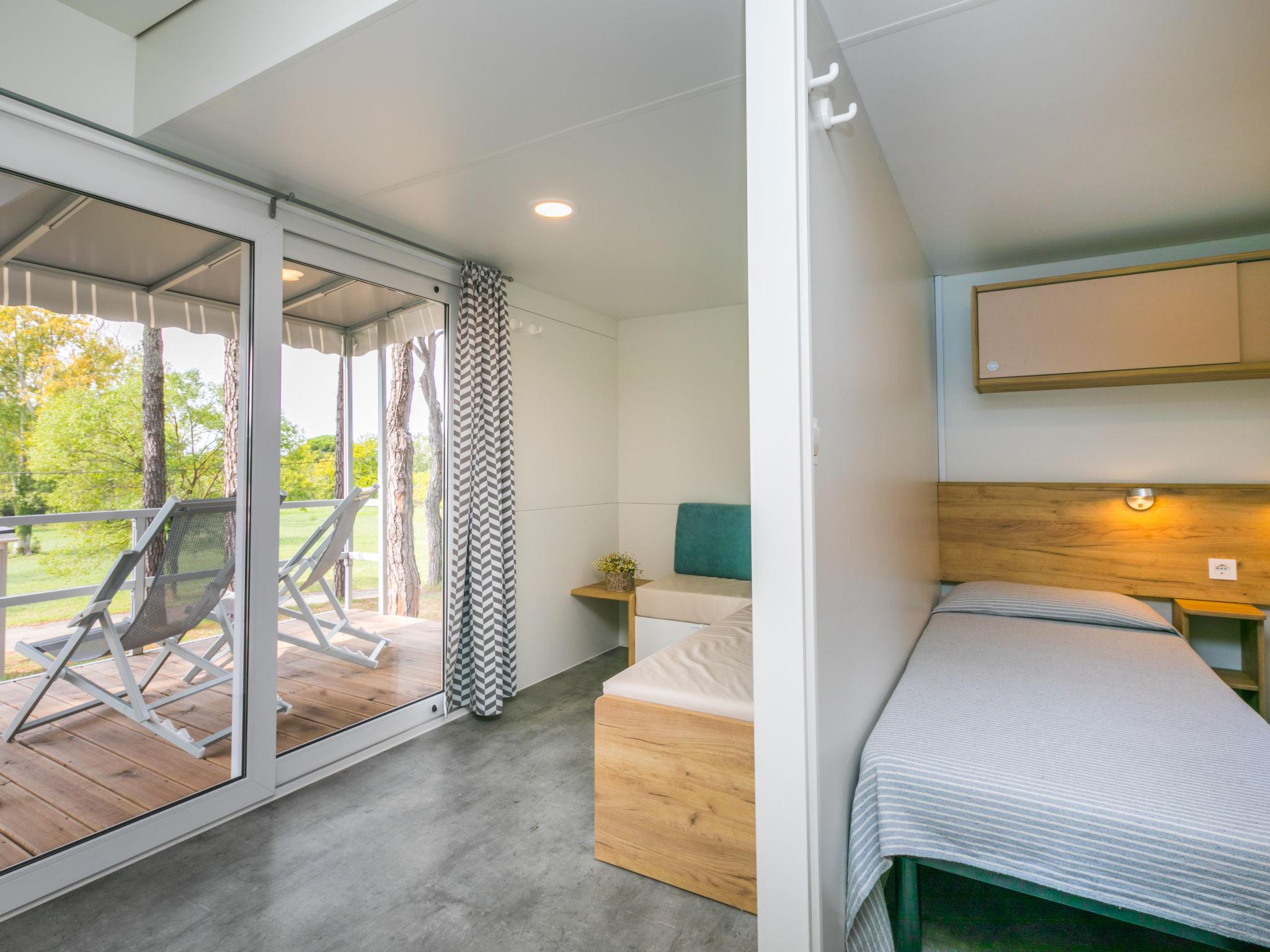 "Adria Home (GDO203)", 3-room mobile home 32 m2. Practical furnishings: living/sleeping room with 1 double sofabed, dining table, satellite TV, air conditioning and forced-air heating. Exit to the terrace. 1 room with 1 french bed (160 cm), separate WC. 1 room with 2 beds (80 cm). Kitchenette (4 gas rings, freezer). Shower/WC. Terrace 20 m2, roofed. Terrace furniture, deck chairs (2). Facilities: mosquito net, children's high chair, baby cot for up to 2 year olds (extra). Parking (1 car). beach ca. 400-500 m. IT030004B2VIBQ2W3N