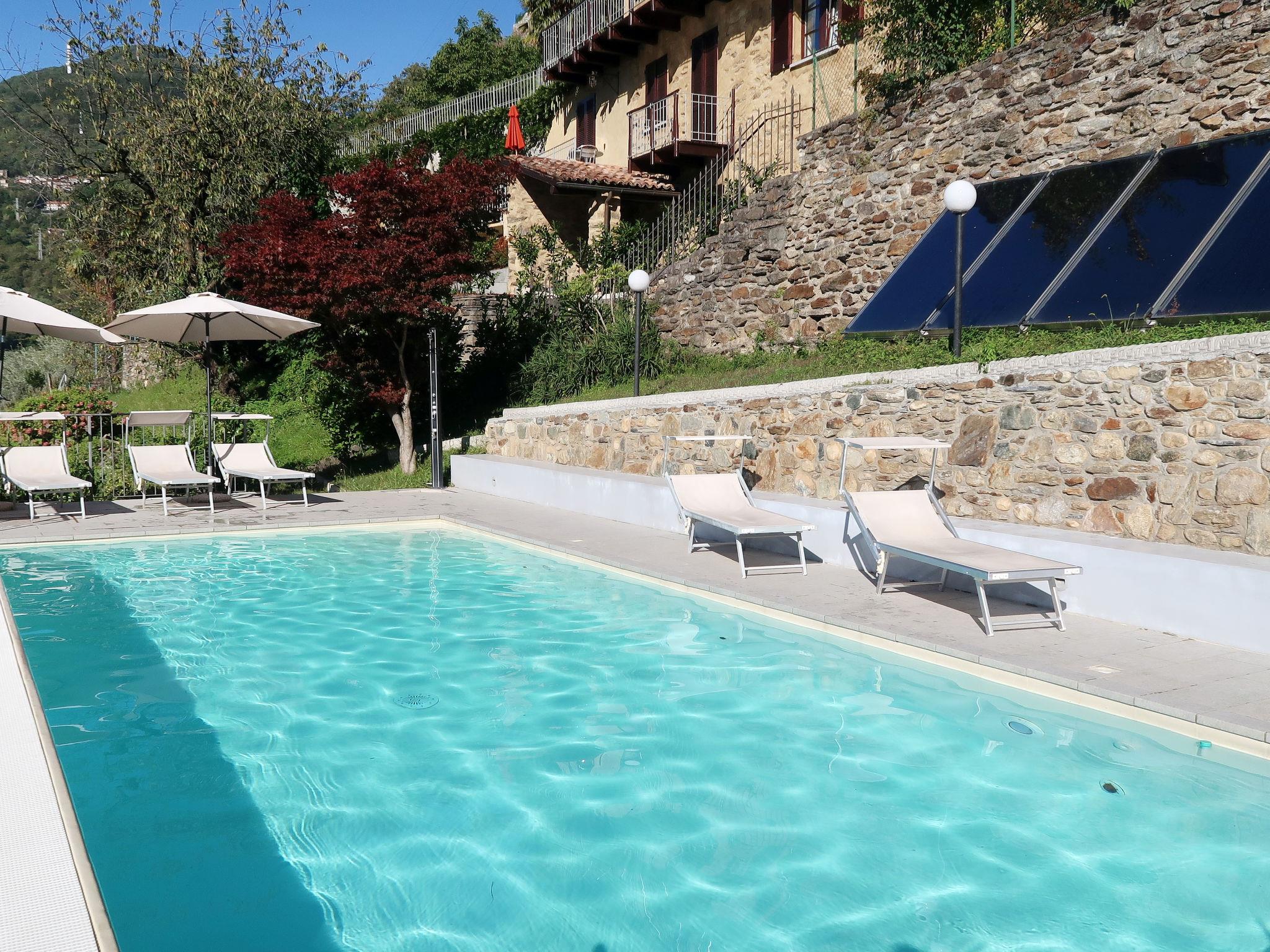 3-family house "Viola". 3 apartments in the property. Above Gravedona 350 m from the centre of Gravedona, 48 km from the centre of Como, 52 km from the centre of Lecco, on a slope, in the residential district, 350 m from the lake, located by a road. For shared use: property (fenced), terraced garden with lawn and trees, lawn for sunbathing, swimming pool (10 x 4 m, depth 140 cm, seasonal availability: 01.May. - 01.Oct.). Outdoor shower, barbecue, pool maintenance by the owner/gardener. Stepped path to the house. Shop 350 m, supermarket 1 km, bus stop "Gravedona" 250 m, railway station "Como" 48 km, pebble beach 2.2 km, outdoor swimming pool 2.2 km. Marina 350 m, golf course (18 hole) 27 km. Please note: the owner lives in the same residence.