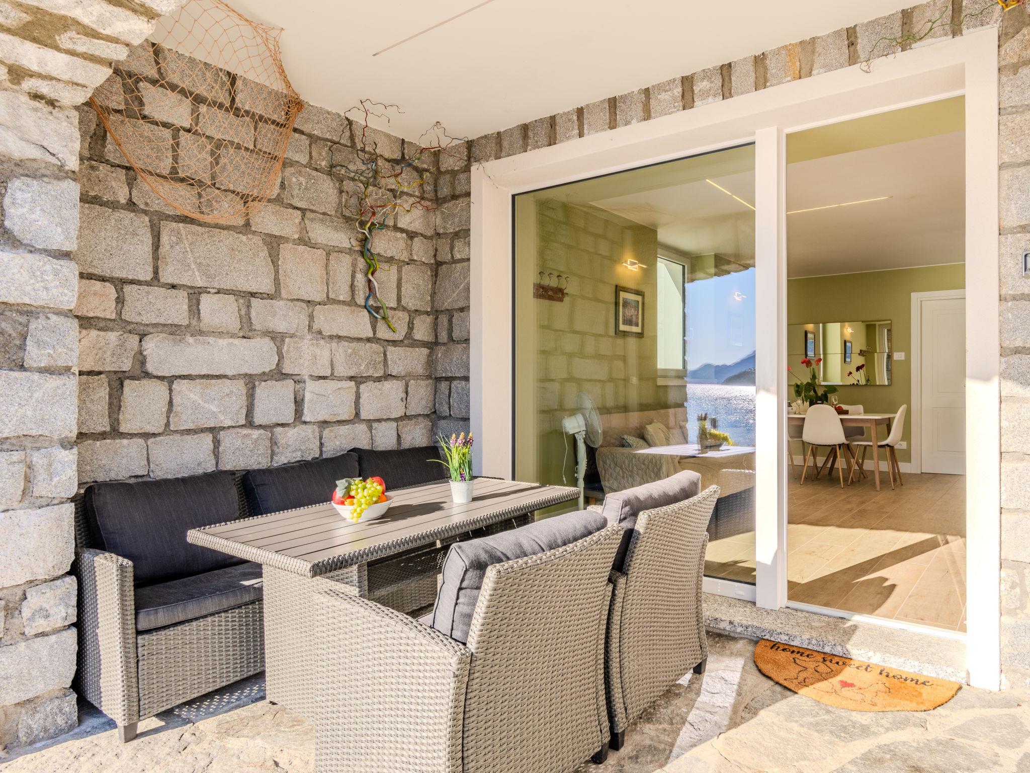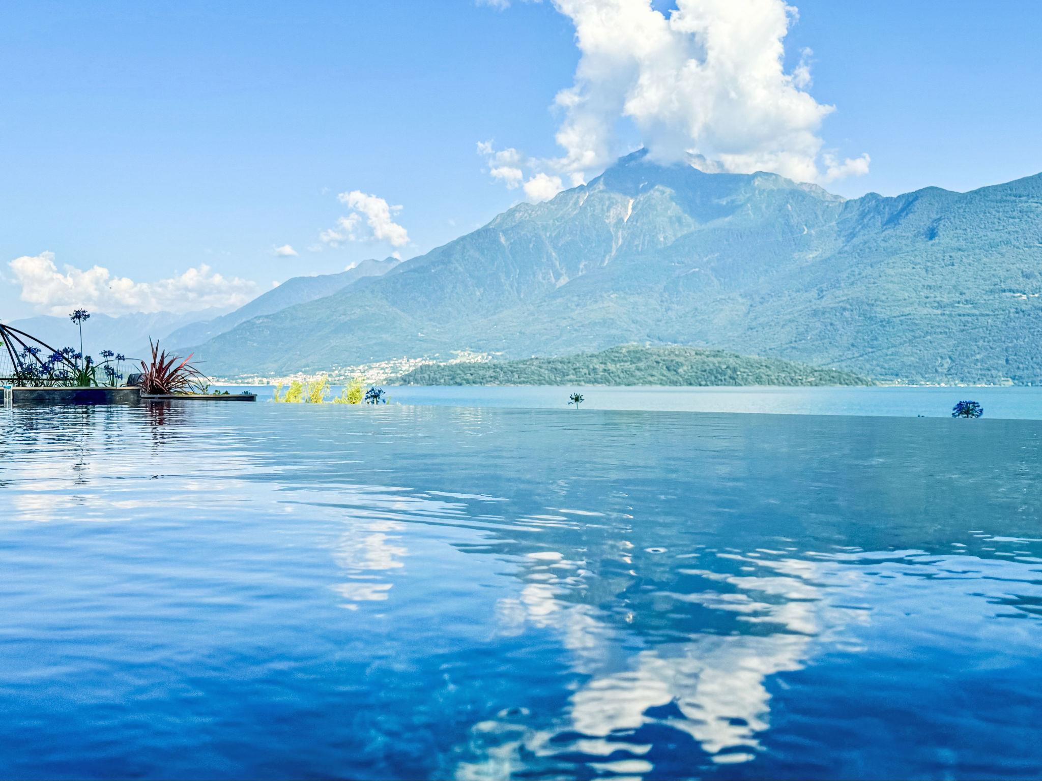 "Riflesso del lago", 3-room apartment 80 m2, on the ground floor. Fully renovated in 2024, comfortable and beautiful furnishings: living/sleeping room with 1 double sofabed and dining table. Exit to the terrace, to the swimming pool. 1 double bedroom with 1 double bed (160 cm, length 195 cm). 1 room with 2 beds (90 cm, length 195 cm). Open kitchen (oven, dishwasher, 4 induction hot plates, toaster, kettle, microwave, freezer). Shower/bidet/WC. Air-conditioning, underfloor heating. Heating available only from 15.10. to 30.04. Natural stone floors. Large terrace roofed. Terrace furniture, deck chairs (4). Marvellous panoramic view of the lake and the mountains. Facilities: washing machine, iron, children's high chair, hair dryer. Internet (WiFi, free). Parking. E-charging station. Please note: non-smokers only. Private entrance, smoke alarm, fire extinguisher. IT013249C2WAD68GIU