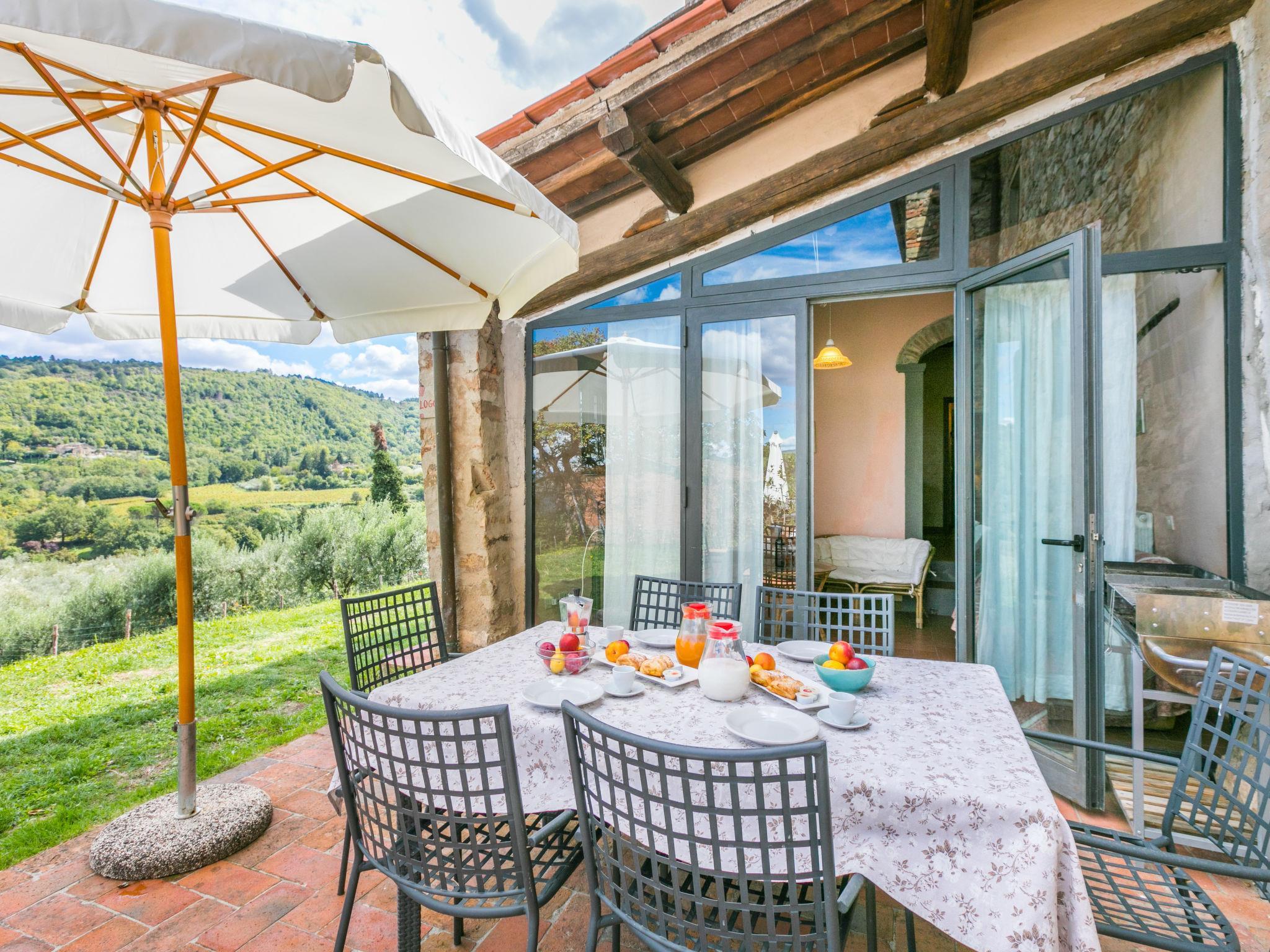 Large, rustic on a vinyard country house "Fattoria l'Ottavo", 400 m a.s.l., from the 18th century, renovated, surrounded by meadows and vineyards. 3 houses in the residence. 9 apartments in the residence. In the district of Lucolena in Chianti 12 km from the centre of Greve in Chianti, 13 m from the centre of Figline Valdarno, in a secluded, sunny, elevated position, in the countryside. For shared use: property 40 ha, natural garden, meadow, swimming pool fenced (8 x 4 m, seasonal availability: 01.May. - 15.Oct. pool opening hours: 08:00-20:00). Outdoor shower, terrace, garden furniture, barbecue, pool maintenance by the owner/gardener. In the house: reception, restaurant, breakfast room, WiFi, washing machine (for shared use). Linen change weekly. Breakfast possible on request (extra). 200 m long narrow motor access to the grounds. Parking on the premises. Shop 700 m, grocery 700 m, supermarket 12 km, shopping centre 13 km, restaurant 1 km, bar 700 m, bakery 700 m, bicycle rental 12 km, bus stop "Lucolena" 700 m, railway station "Figline Valdarno" 13 km, sandy beach "Calambrone" 110 km, indoor swimming pool 13 km, lake Trasimeno 114 km. Golf course (18 hole) 20 km, tennis 12 km, riding stable 2 km, walking paths from the house 100 m. Nearby attractions: Firenze 37 km, Siena 50 km, Arezzo 54 km, San Gimignano 65 km. Please note: car recommended. Reception open 10:00-17:00 hrs. Suitable for families, baby equipment (included). Suitable for events. Local sale of farm products. Please note: the owner lives on the same property. All houses/apartments are individually designed/furnished.
