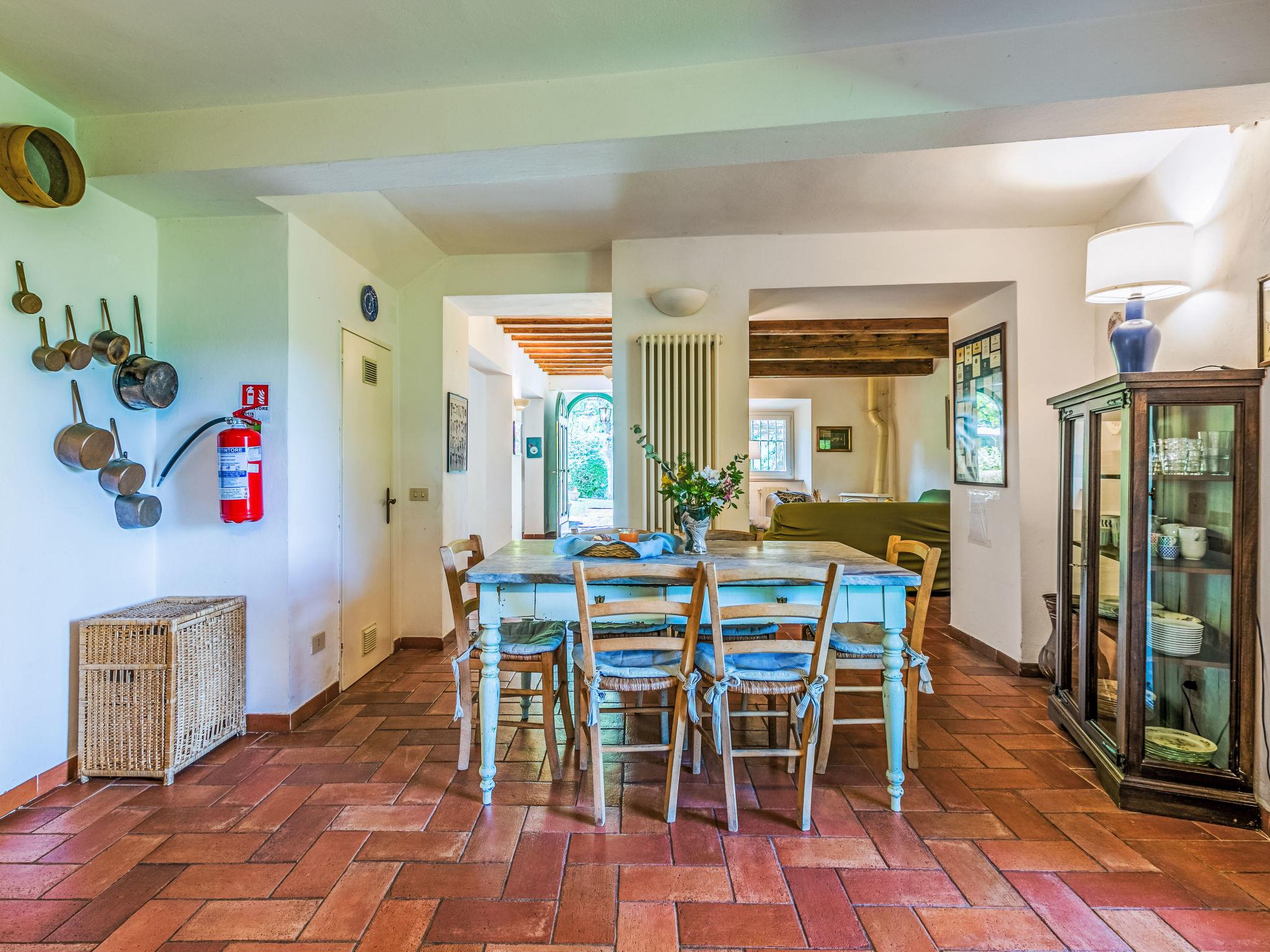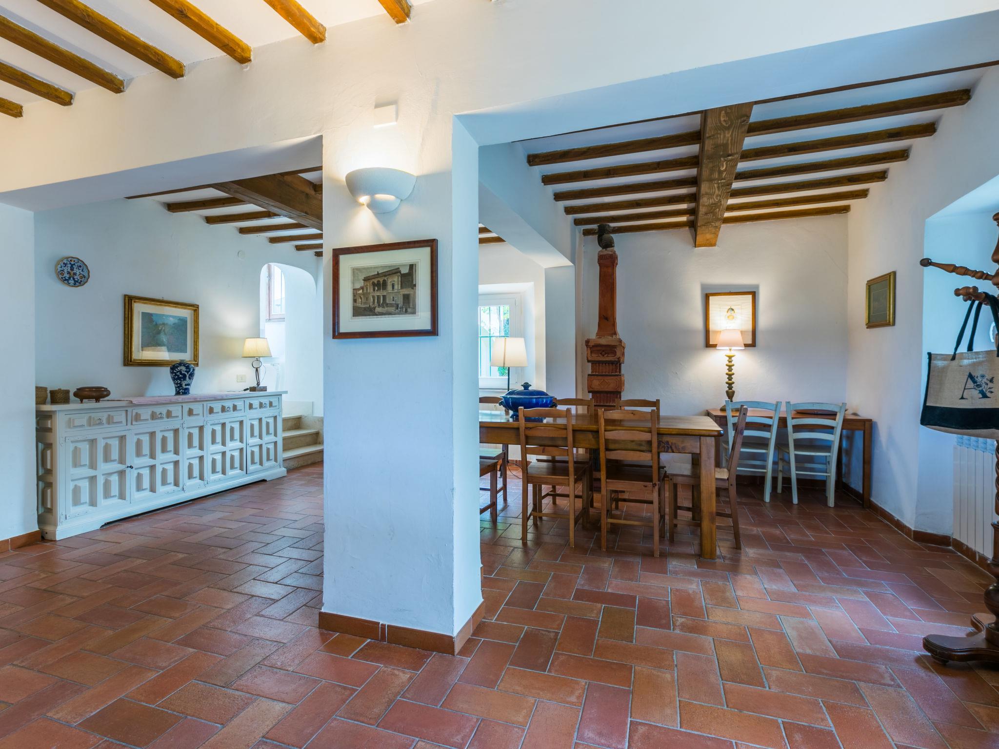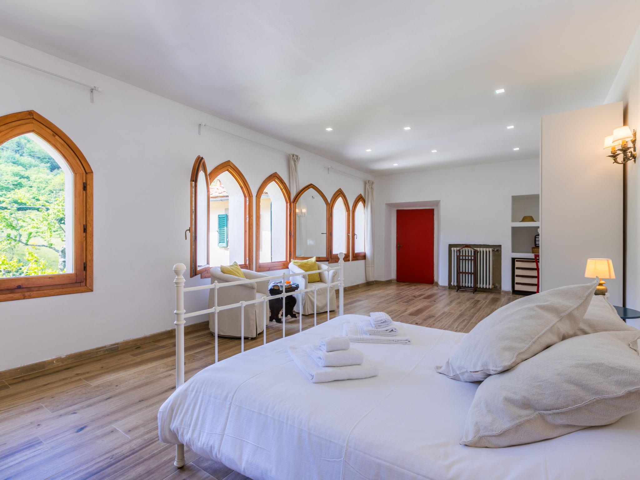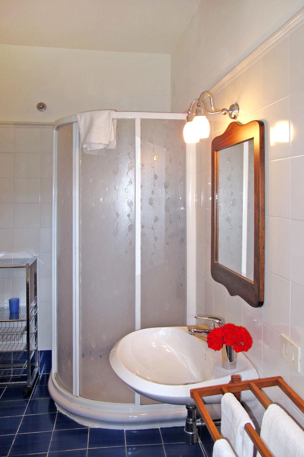 "Villa Castagnoli", 7-room villa 250 m2 on 2 levels. Comfortable and wooden furniture furnishings: living/dining room with open-hearth fireplace, dining table and satellite TV (flat screen). Exit to the garden. Open kitchen (oven, dishwasher, 5 gas rings, freezer, electric coffee machine) with open-hearth fireplace. Sep. WC. Upper floor: 3 rooms, each room with 1 french bed (160 cm). 2 rooms, each room with 2 beds (80 cm). Bath/WC, 2 showers/WC. Gas heating. Parquet floors. Terrace roofed. View of the valley and the garden. Facilities: washing machine, iron, baby cot for up to 2 year olds. Internet (WiFi, free). Parking (4 cars) at the house. Please note: non-smokers only. Maximum 1 pet/ dog allowed. No mandatory extra charges to be paid on-site except for local tax. IT048021B49F5V68X8