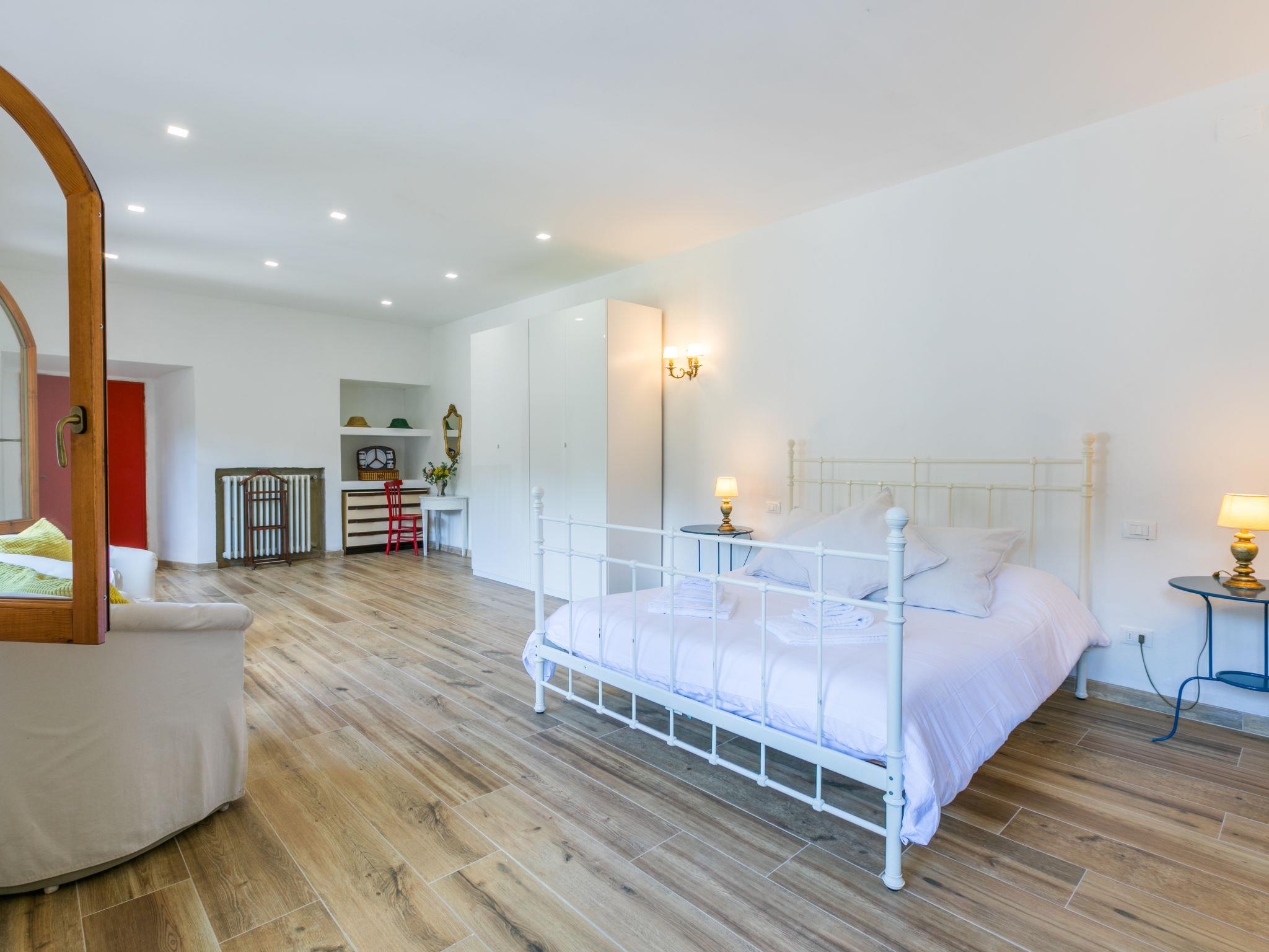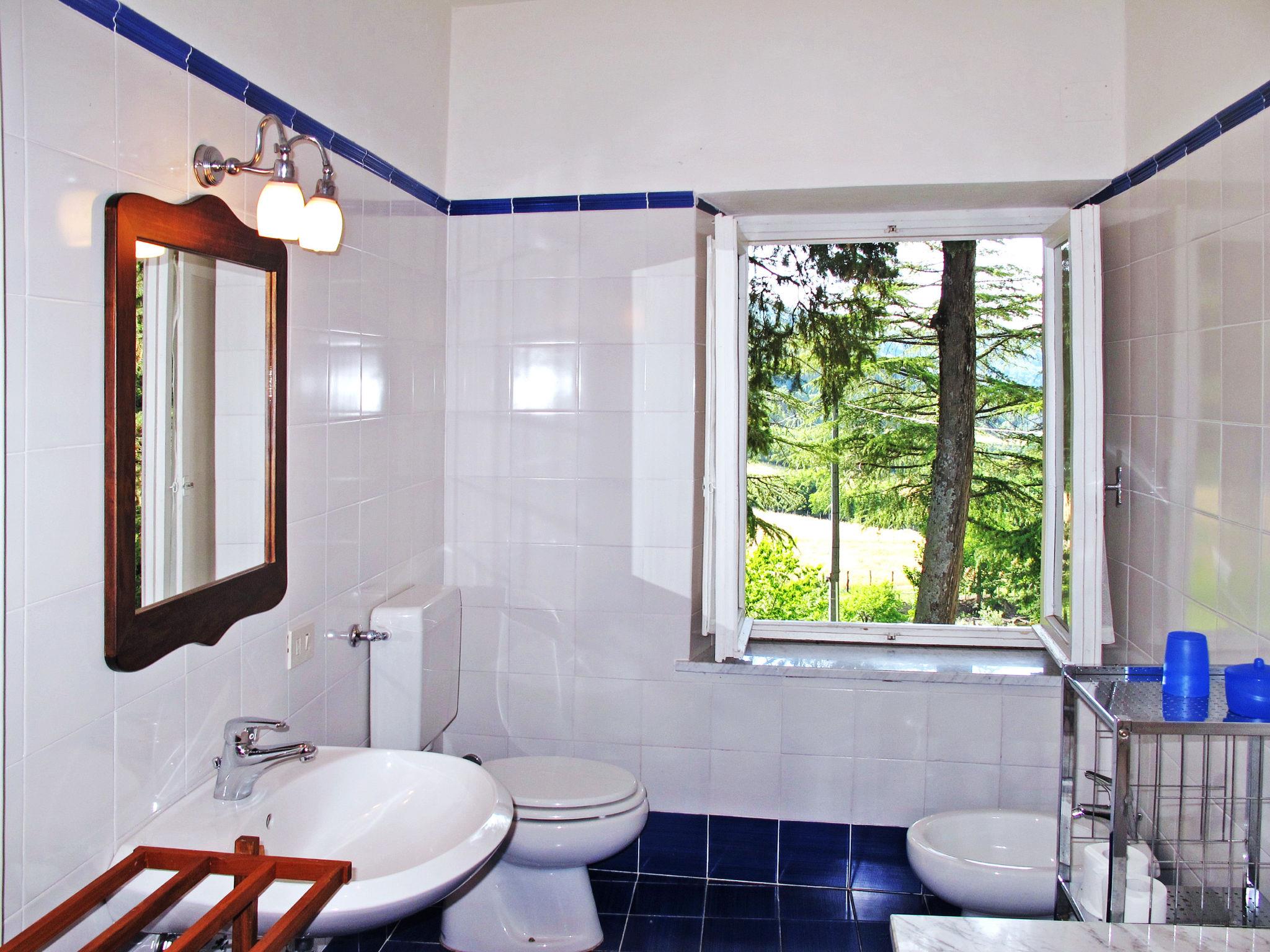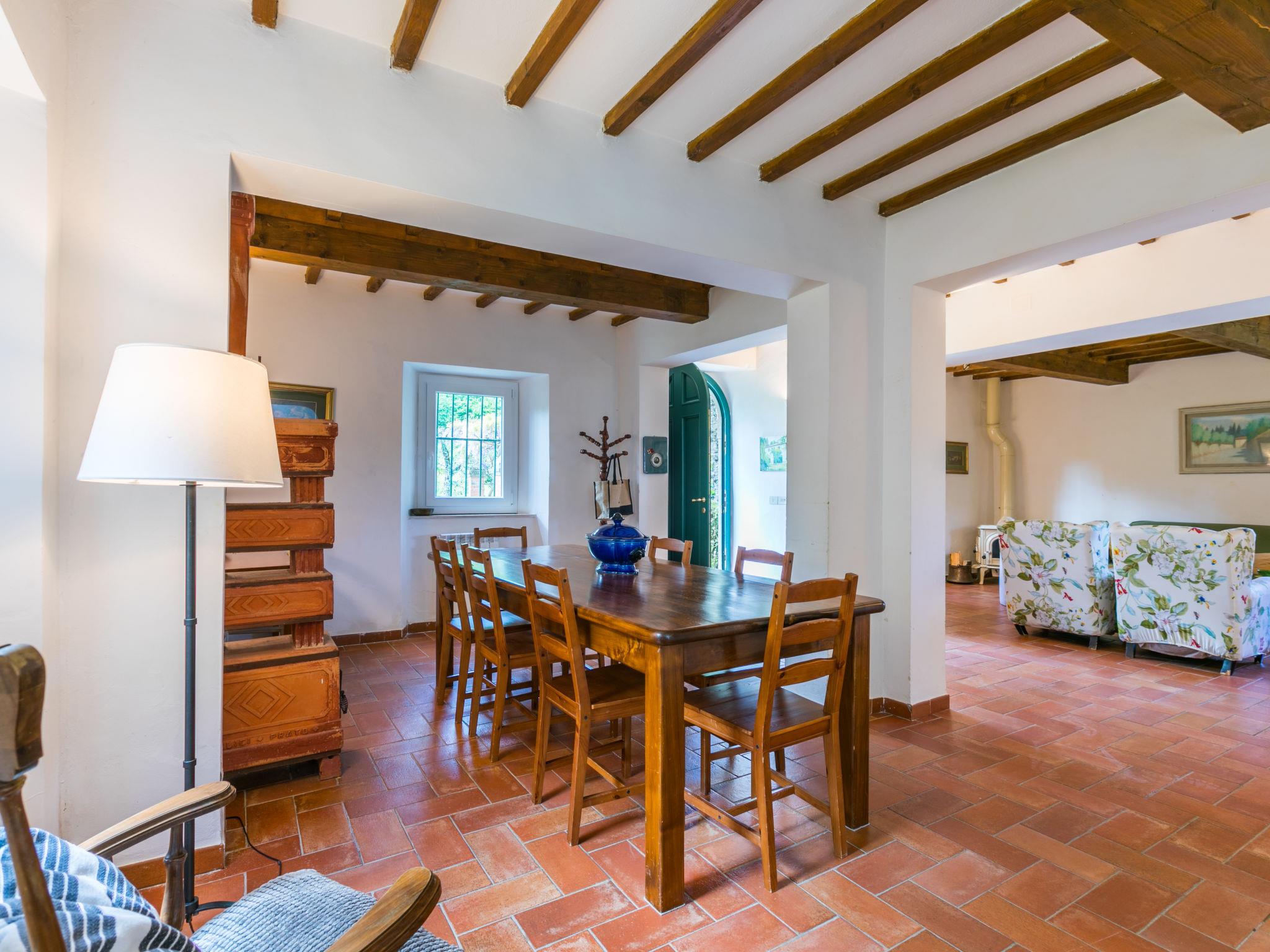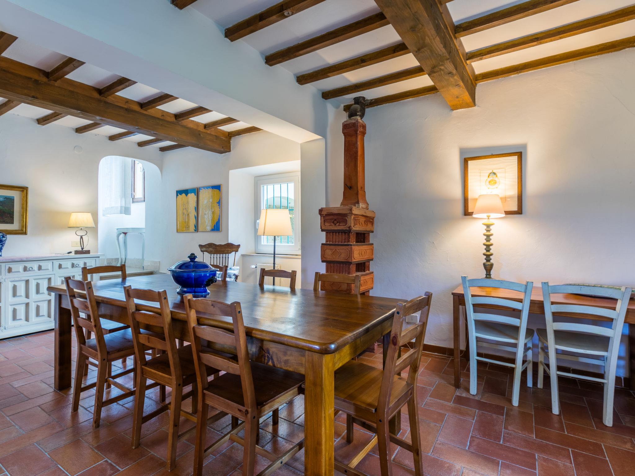 "Villa Castagnoli", 7-room villa 250 m2 on 2 levels. Comfortable and wooden furniture furnishings: living/dining room with open-hearth fireplace, dining table and satellite TV (flat screen). Exit to the garden. Open kitchen (oven, dishwasher, 5 gas rings, freezer, electric coffee machine) with open-hearth fireplace. Sep. WC. Upper floor: 3 rooms, each room with 1 french bed (160 cm). 2 rooms, each room with 2 beds (80 cm). Bath/WC, 2 showers/WC. Gas heating. Parquet floors. Terrace roofed. View of the valley and the garden. Facilities: washing machine, iron, baby cot for up to 2 year olds. Internet (WiFi, free). Parking (4 cars) at the house. Please note: non-smokers only. Maximum 1 pet/ dog allowed. No mandatory extra charges to be paid on-site except for local tax. IT048021B49F5V68X8