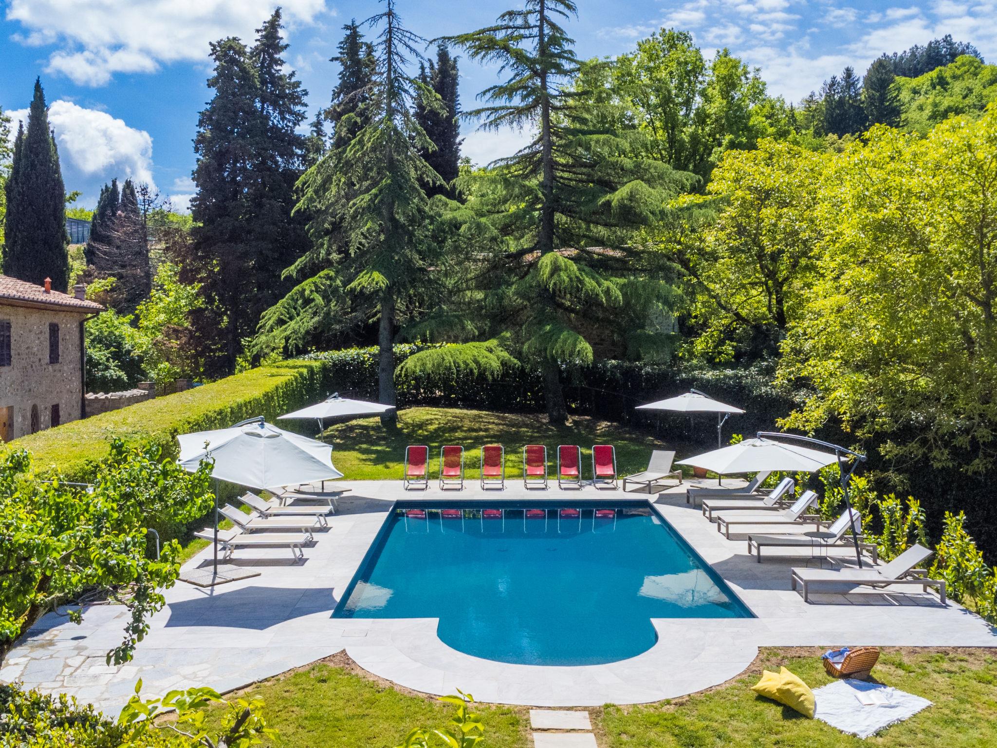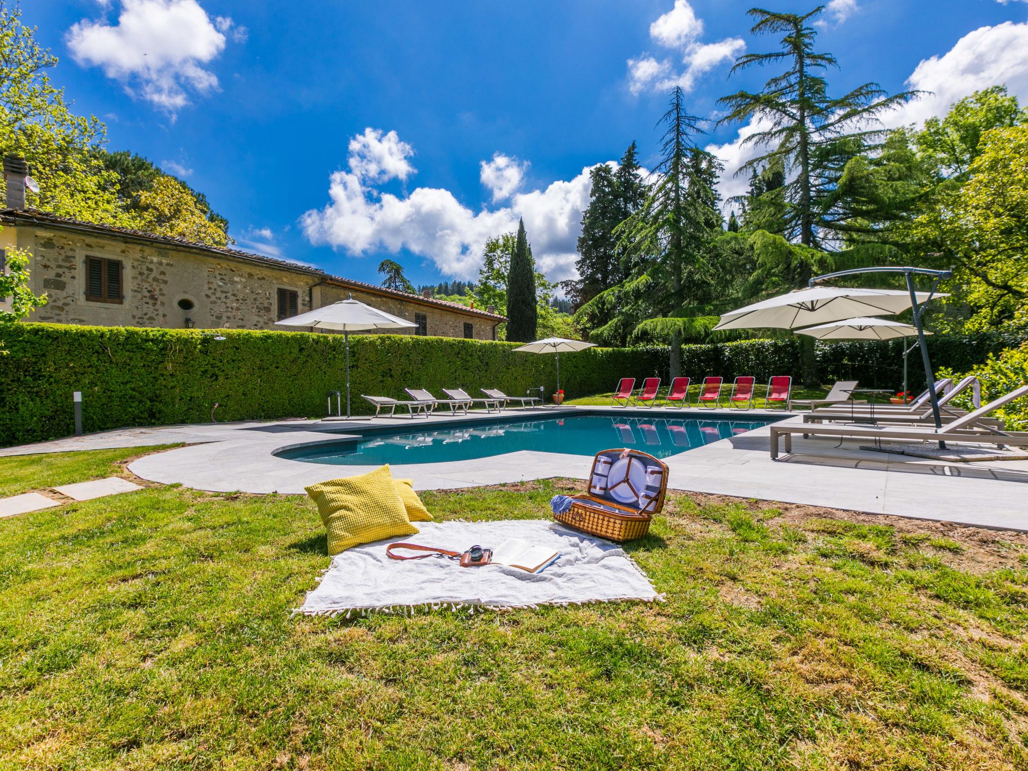 Manor house "Castagnoli", 650 m a.s.l., surrounded by fields and vineyards. 12 km from the centre of Greve in Chianti, 2 km from the centre of Lucolena, in a secluded position, in the countryside. Private: property 40 ha, park, beautiful, well-kept garden (not fenced) with flowers and trees, lawn for sunbathing, swimming pool (10 x 5 m, depth 100 - 200 cm, seasonal availability: 10.May. - 10.Oct.). Outdoor shower, terrace, barbecue, pool maintenance by the owner/gardener. 500 m long bumpy motor access (via unmade road). Parking on the premises. Shop 2 km, supermarket 10 km, bus stop 3 km, sandy beach "Marina di Cecina" 85 km. Golf course (18 hole) 20 km, walking paths from the house 50 m. Nearby attractions: Siena 30 km, Volterra 44 km, Firenze 50 km, Arezzo 75 km. Please note: car recommended. Baby equipment (included). Groups of teenagers on request only.
