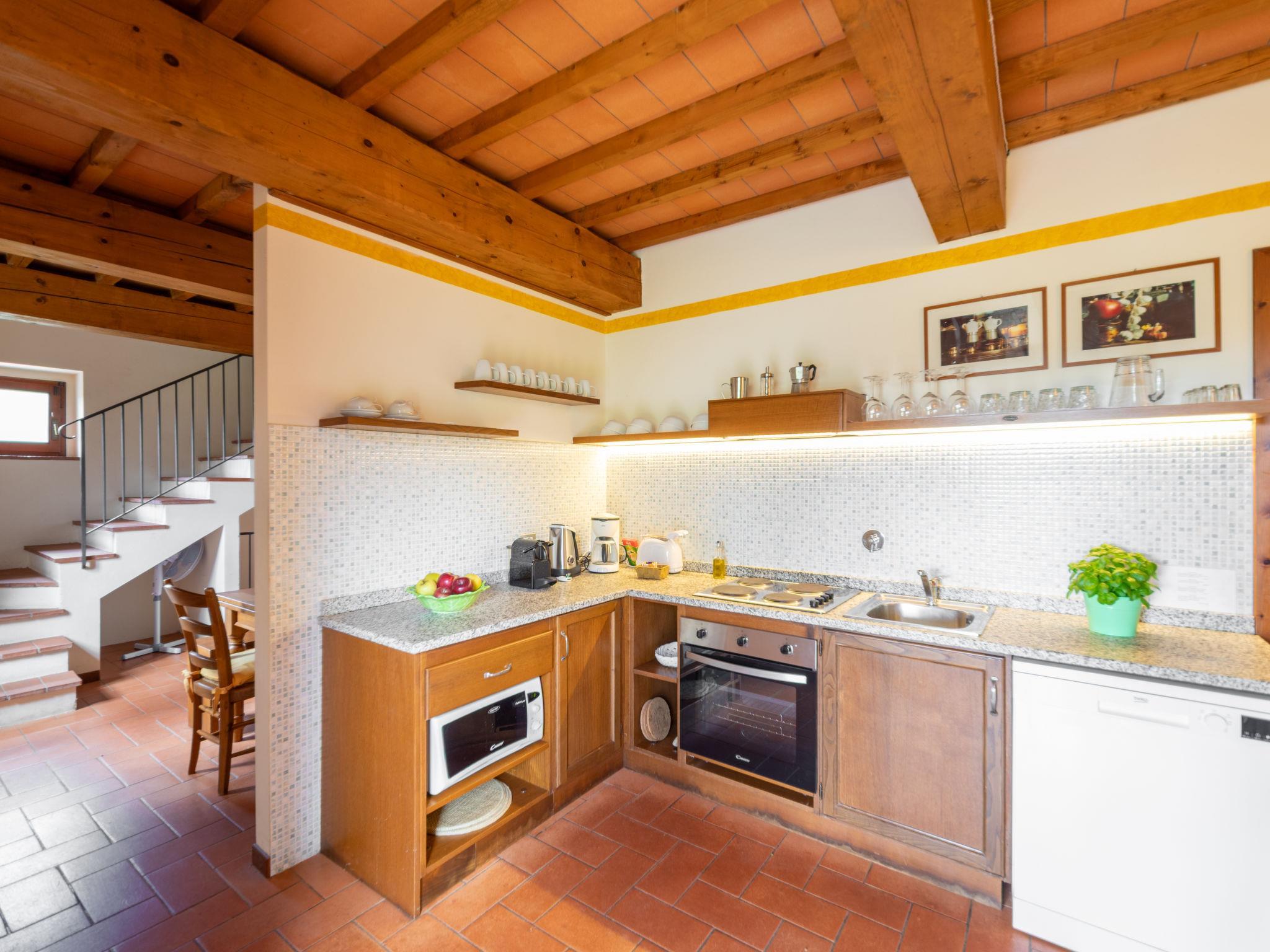 "La Corte", 4-room house 116 m2 on 2 levels, on the ground floor. Comfortable and tasteful furnishings: living/dining room 30 m2 with 1 double sofabed (130 cm, length 190 cm), satellite TV (flat screen). Kitchen 12 m2 (4 hot plates, oven, dishwasher, toaster, kettle, microwave, electric coffee machine, Capsules for coffee machine (Nespresso) extra). Exit to the garden. Shower/bidet/WC. Upper floor: 1 room with 1 french bed (140 cm, length 200 cm), fan. 1 double bedroom with 1 double bed (160 cm, length 200 cm), fan. 1 double bedroom with 1 double bed (180 cm, length 200 cm), fan. Shower/bidet/WC. Garden. Terrace furniture, barbecue (portable), conservatory. Facilities: washing machine, safe, mosquito net, children's high chair, baby cot for up to 2 year olds (extra). Internet (WiFi, free). Please note: suitable for families. Maximum 1 pet/ dog allowed. Smoke alarm, fire extinguisher. The rooms are equipped with ceiling fans. Mosquito nets are only available in the bedrooms. Access to the courtyard from the living/dining room. On the lower floor (18 steps): technical room not accessible. IT048021B4CFNRLCV2