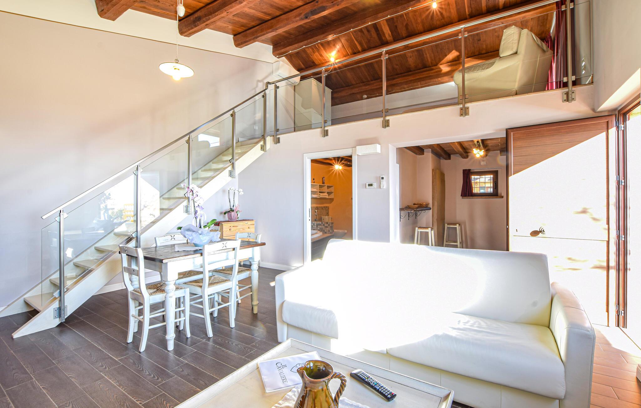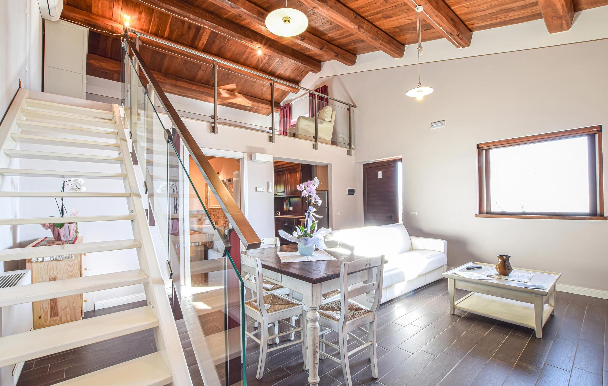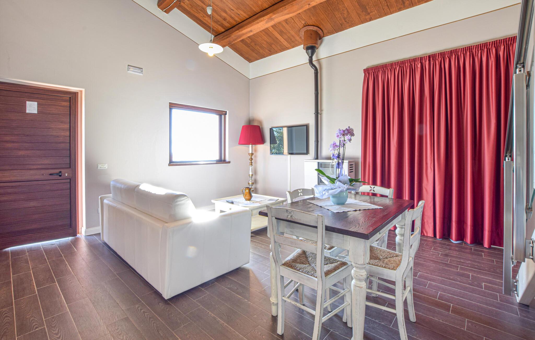 Dette charmerende feriehus har et lyst og komfortabelt interiør, hvor hele familien kan sætte hverdagen på pause. Tilbered lækre måltider, planlæg jeres aktiviteter sammen, og brug det fælles fitnesscenter til jeres daglige træning. Om aftenen kan I streame en spændende film eller nyde et brætspil.