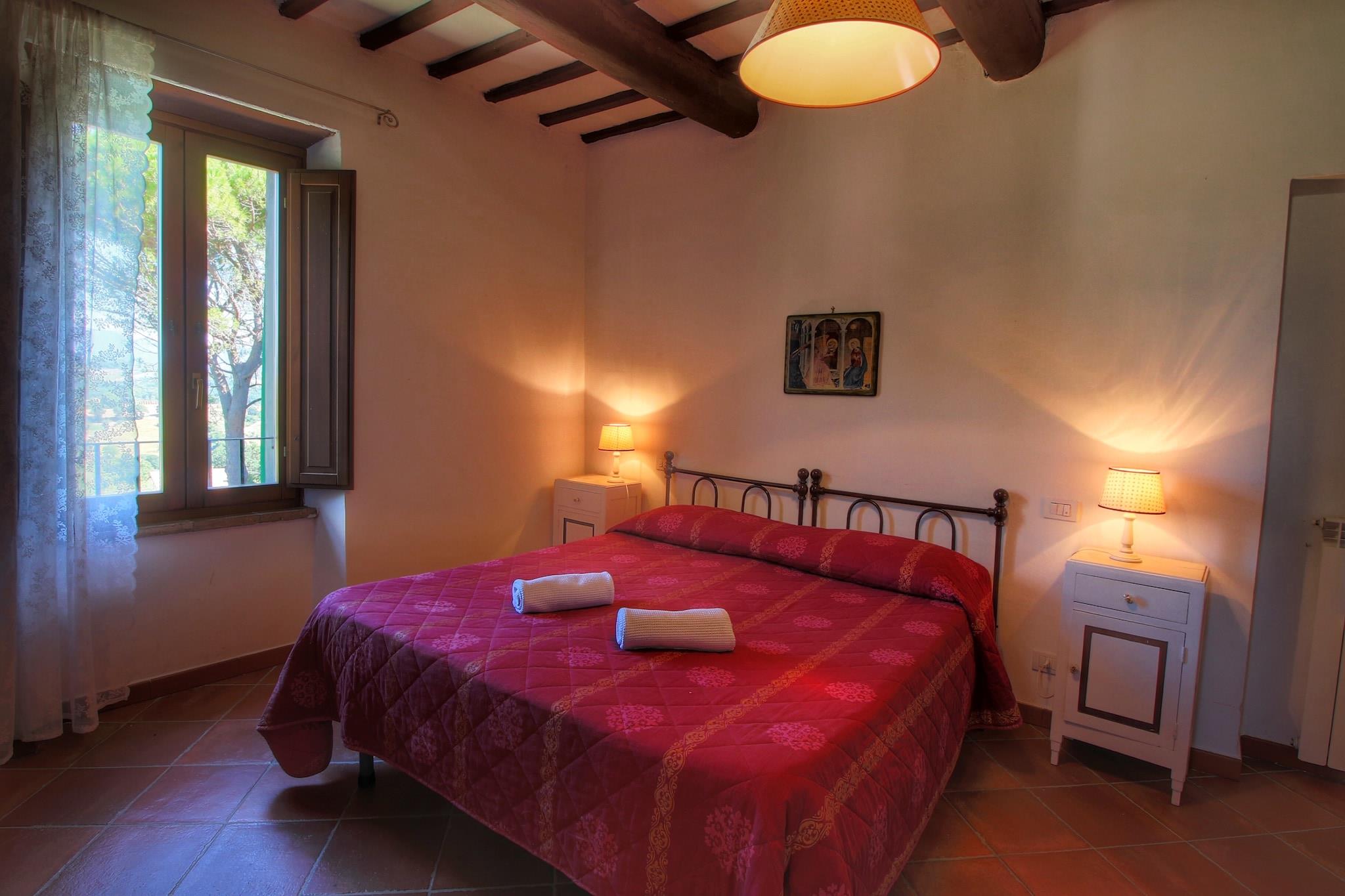 Beliggende i den naturskønne by Gualdo Cattaneo, rummer dette indbydende bondehus fem gæster, der søger både ro og spænding. Kæledyrsvenligt og udstyret med gratis Wi-Fi garanterer det et hyggeligt og bekvemt ophold. Kun 5 km herfra tilbyder Trasimenosøen roligt vand og smukke omgivelser, der er ideelle til sejlads og vandreture. Historieinteresserede kan besøge det middelalderlige Castello di San Terenziano eller den panoramiske fæstning Rocca Sonora. Vinelskere vil sætte pris på smagsprøver på Cantina Cesarini Sartori, en berømt lokal vingård. Den rummelige første sal har en varm opholdsstue med en dobbelt sovesofa, satellit-tv, spiseplads og pejs. Det store køkken inkluderer kogeplader, elkedel, komfur, emhætte, espressomaskine, grillovn og køleskab med fryser til nem madlavning. Det største soveværelse har en komfortabel dobbeltseng, mens det andet soveværelse indeholder tre enkeltsenge. To badeværelser har brusere, håndvaske, toiletter og bidet. Ekstraudstyr inkluderer en privat terrasse, fælles vaskemaskine, central gasvarme og et betalt boblebad. Gæsterne kan slappe af i den indhegnede have med liggestole, grillfaciliteter og nyde den fælles pool (åben juni-september). Fritidsfaciliteterne omfatter bordtennis, bordfodbold og cykler til at udforske området. Gualdo Cattaneo er omgivet af en fantastisk udsigt og kombinerer naturlig skønhed med rig gastronomi. Nærliggende spisesteder som Ristorante Pizzeria Il Mulino, Serpillo, Ottavi Mare og andre serverer autentiske italienske retter. Dette hjem er en fremragende base for at udforske Umbriens kulturarv og køkken.