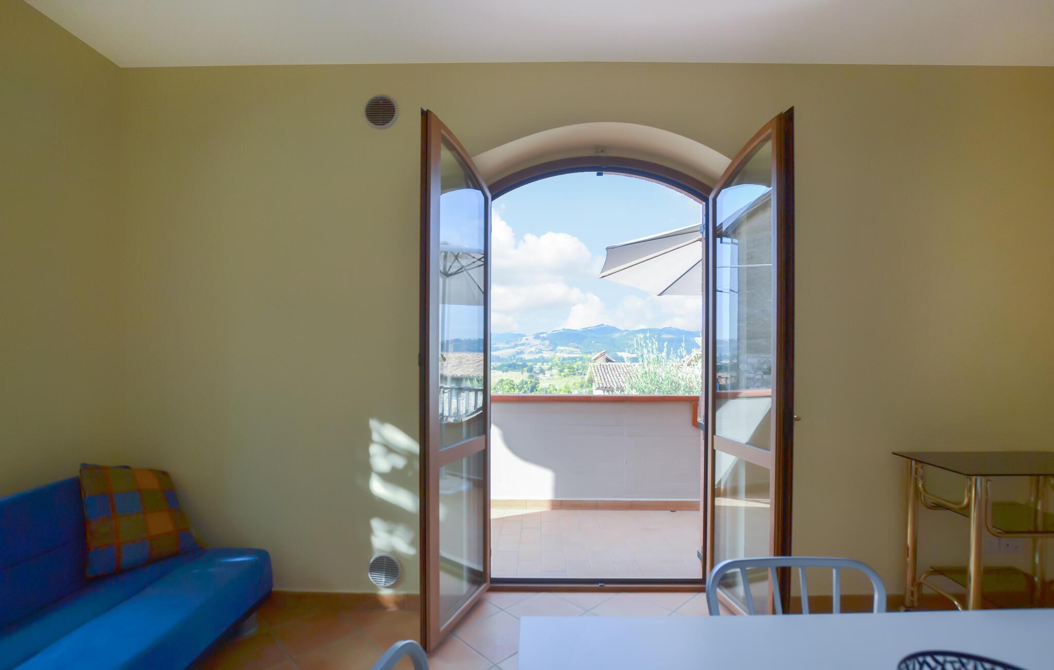 Tilbring jeres ferie i denne lyse og indbydende ferielejlighed i Gubbio, som ligger i et charmerende hus med en anden ferielejlighed. Her kan I nyde en harmonisk blanding af moderne komfort og traditionel italiensk atmosfære. Store vinduer oversvømmer rummene med naturligt lys og skaber en venlig atmosfære for jer. Det stilfulde interiør og de varme farver inviterer jer til at slappe af og lægge hverdagens stress bag jer. Det veludstyrede køkken er perfekt til at lave mad sammen og nyde hyggelige aftener.