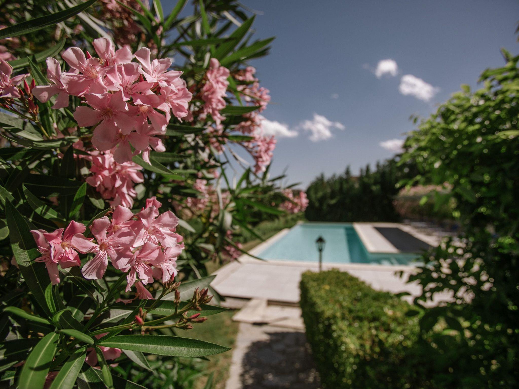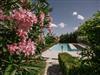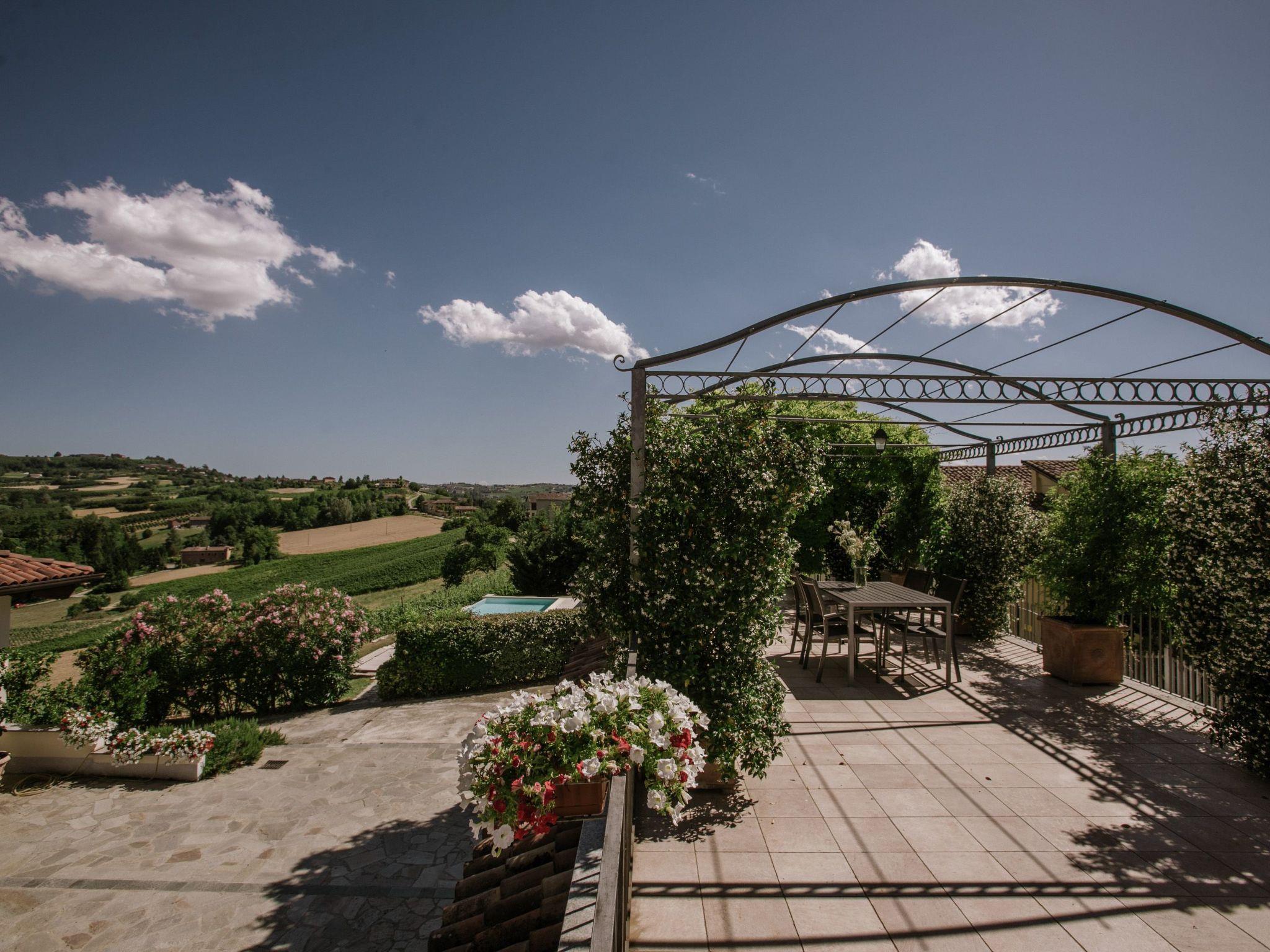 A glass door leads from the living room to the beautiful, spacious terrace, covered by a gazebo decorated with climbing roses and jasmine. The view of the valley and the swimming pool is breathtaking.