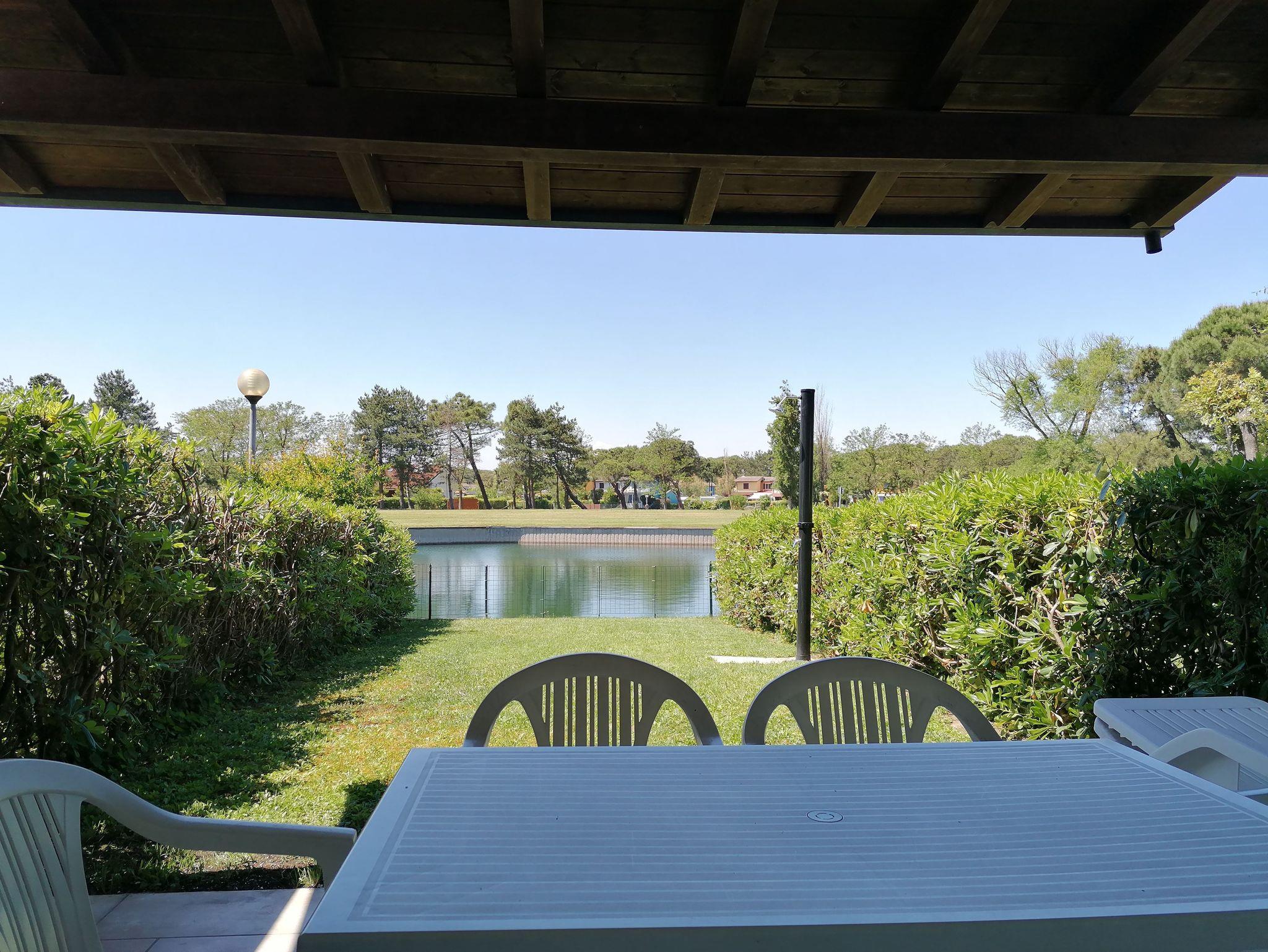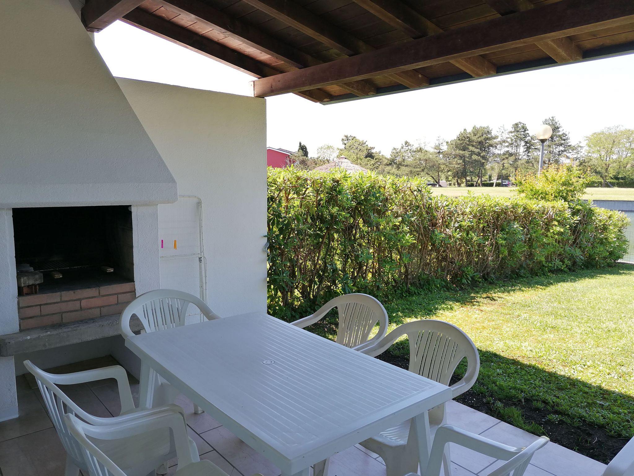 Ein gepflegter, halb geschlossener Garten mit Außenmöbel, Außendusche und Außengrill