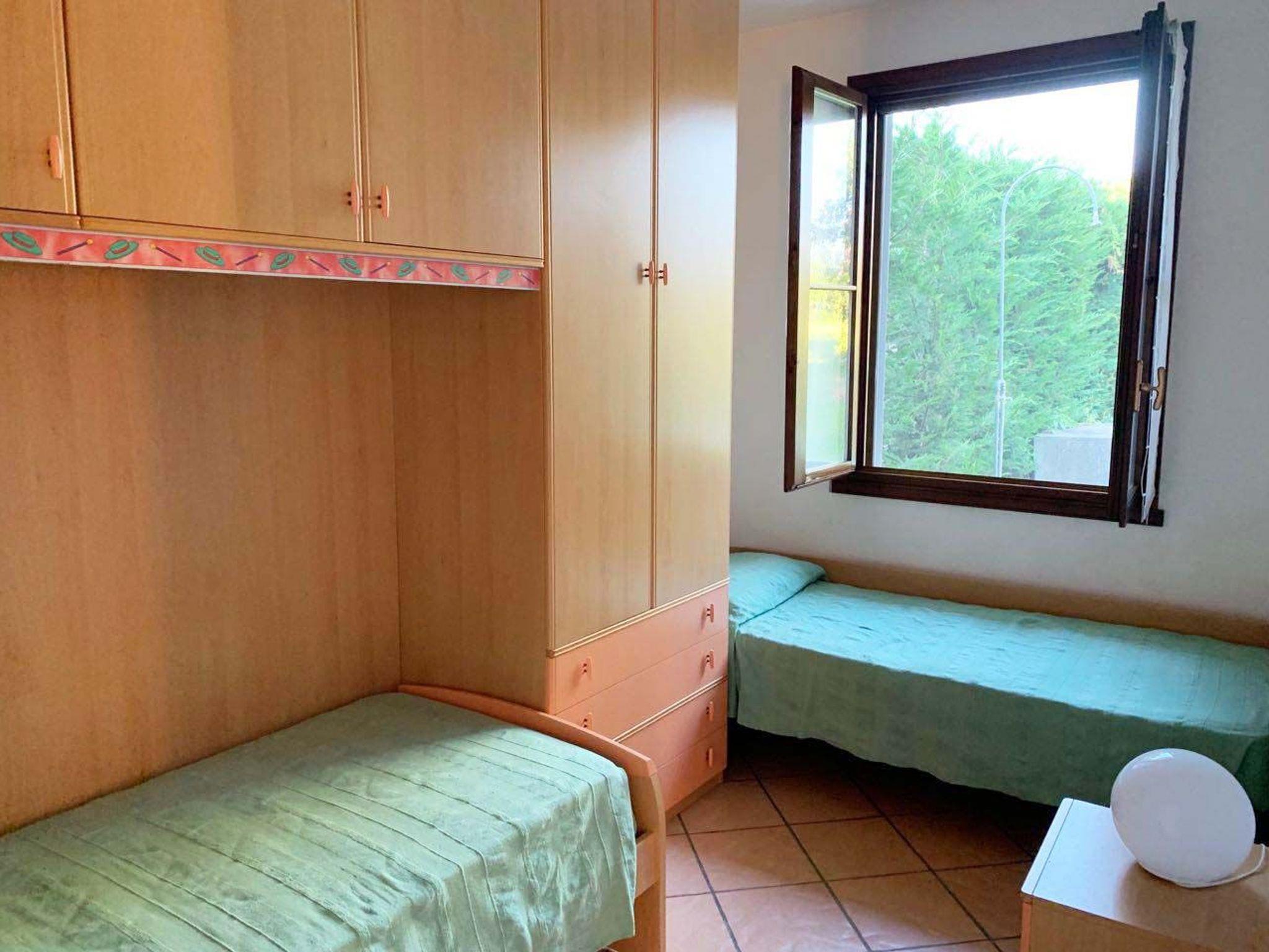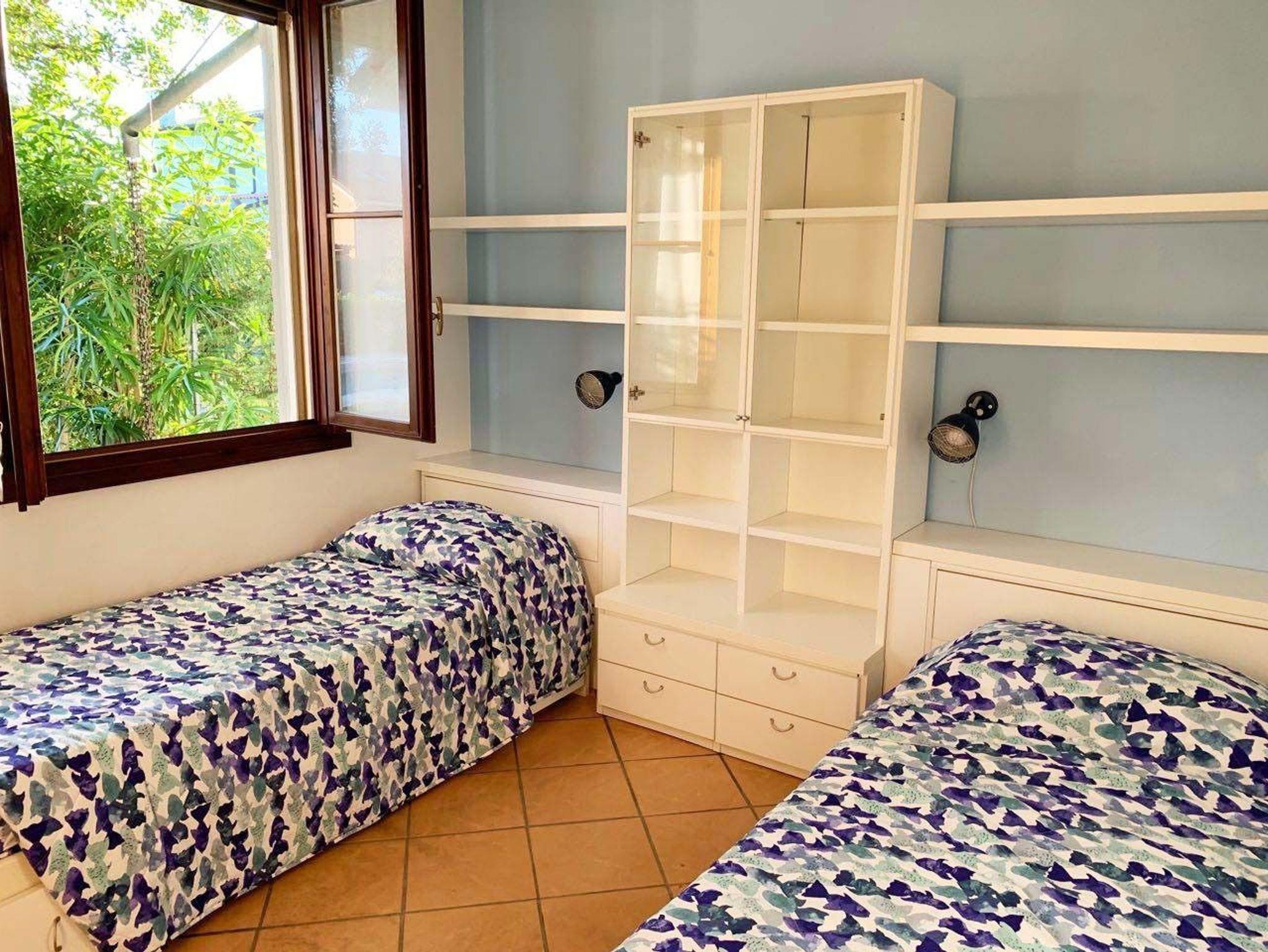 • Ein zweites Schlafzimmer mit zwei Einzelbetten, großen Schränken und Ventilator