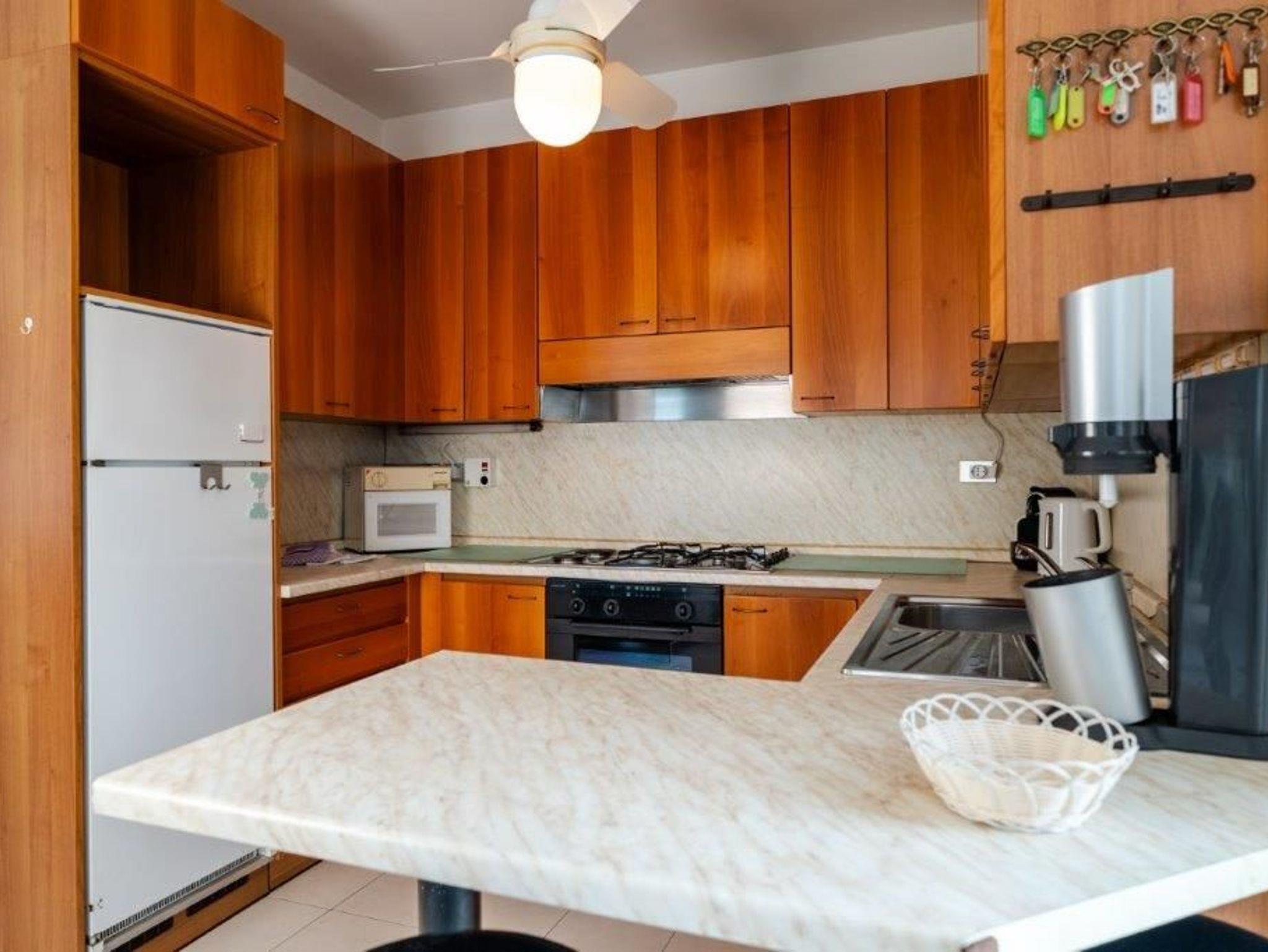 • Küche mit einer kleinen Theke, gut ausgestattet mit Backofen, Mikrowelle, Kaffeemaschine, Spülmaschine und einem Kühlschrank mit Gefrierfach