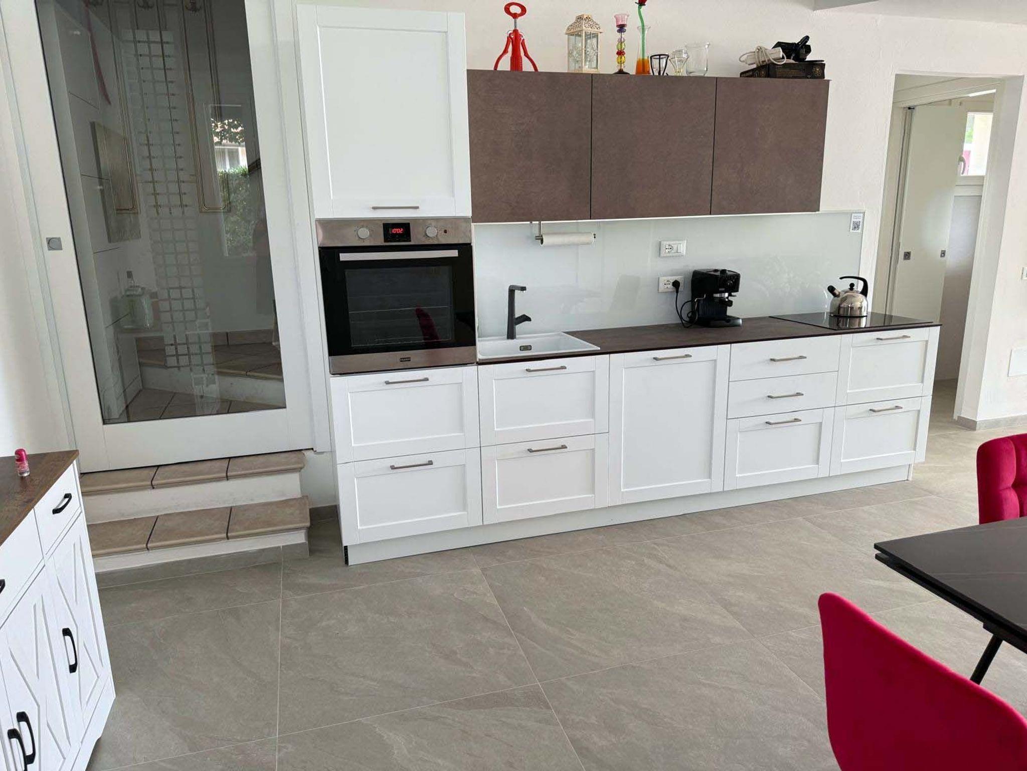 • Gut ausgestatte Küche mit Spülmaschine, Kühlschrank mit extra Gefrierteil, Induktionsherd und Backofen, Wasserkocher, Filterkaffeemaschine sowie Espressomaschine. Toaster, Mixer und Pürierstab