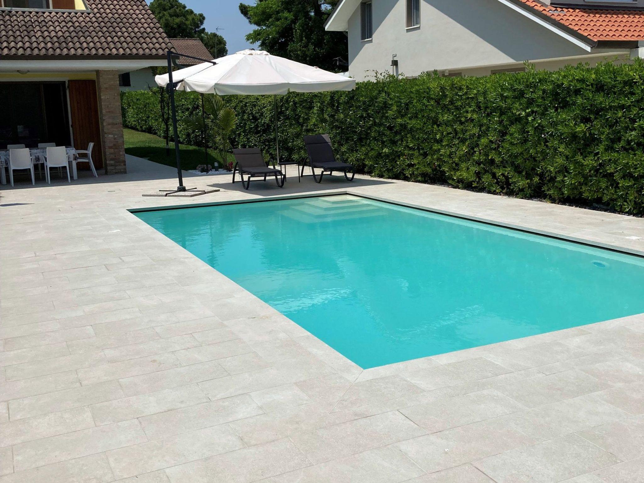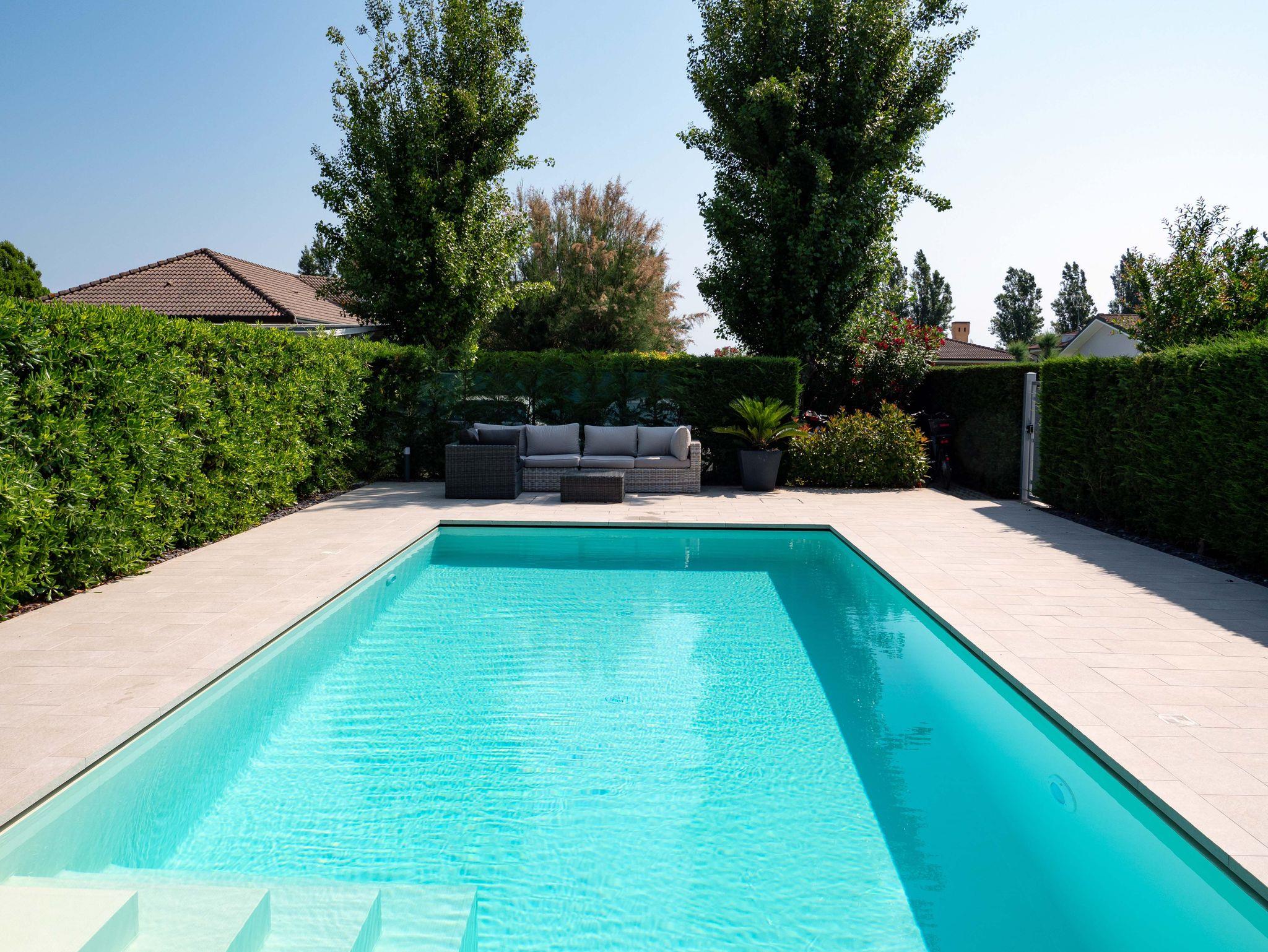 Ein gepflegter, uneinsehbarer, geschlossener Garten mit großer überdachter Terrasse, sehr schön angelegtem Pool mit Treppe mit den Maßen 8 auf 4m, Gartenmöbel, Sonnenliegen und Außengrill