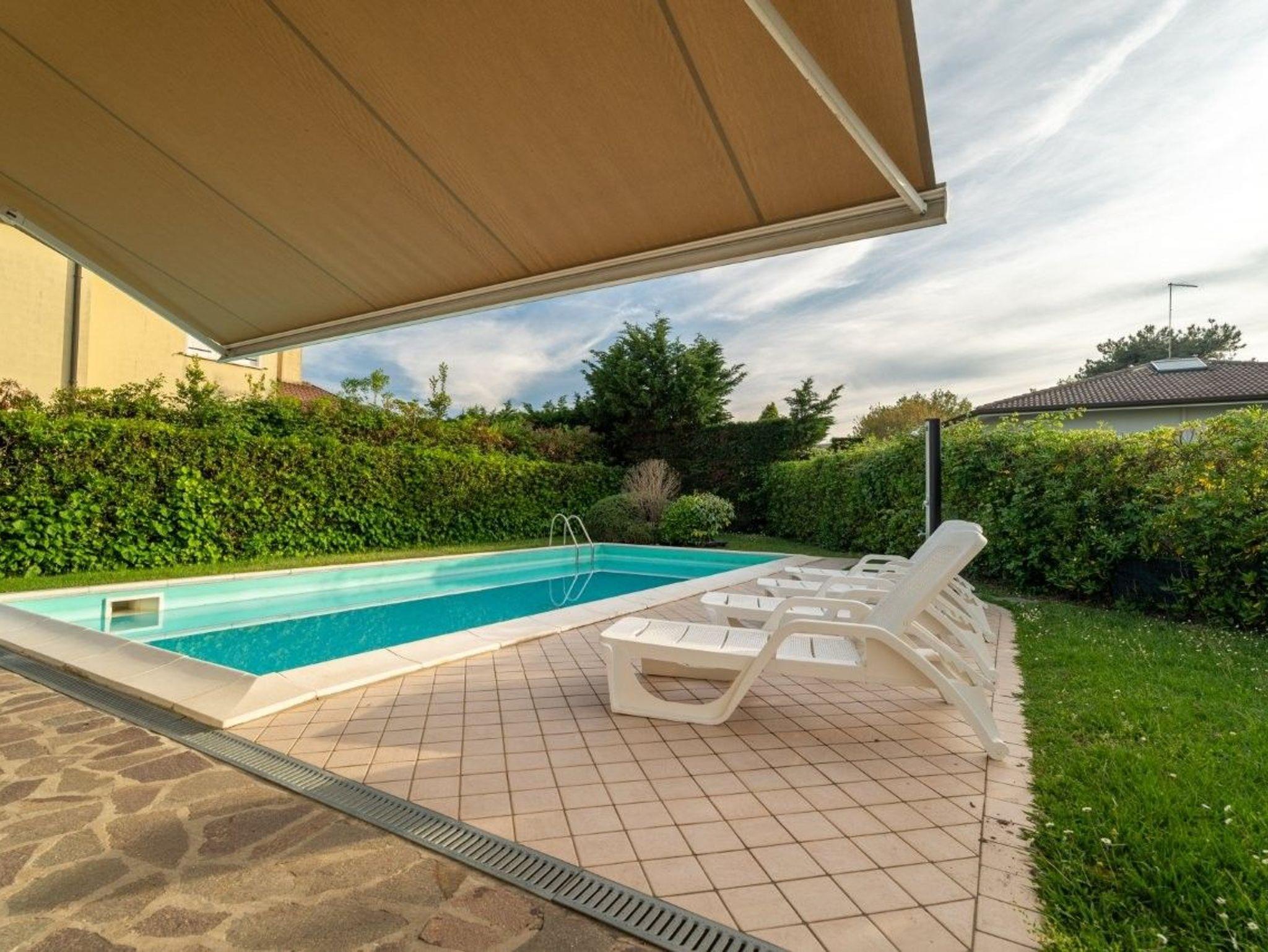Geschlossener Garten mit Pool mit Zugang über eine Treppe, Gartenmöbel, Außengrill und Außendusche