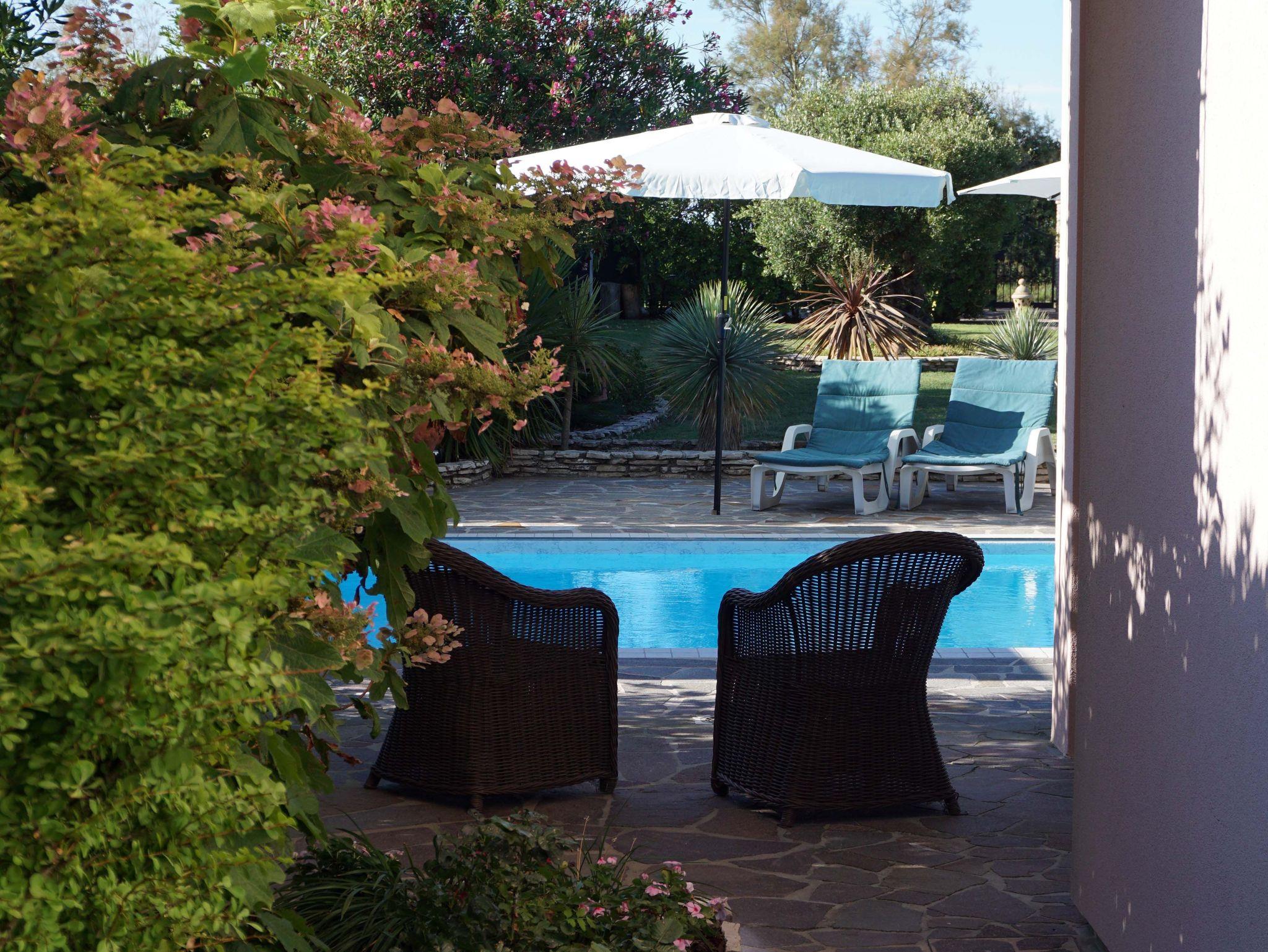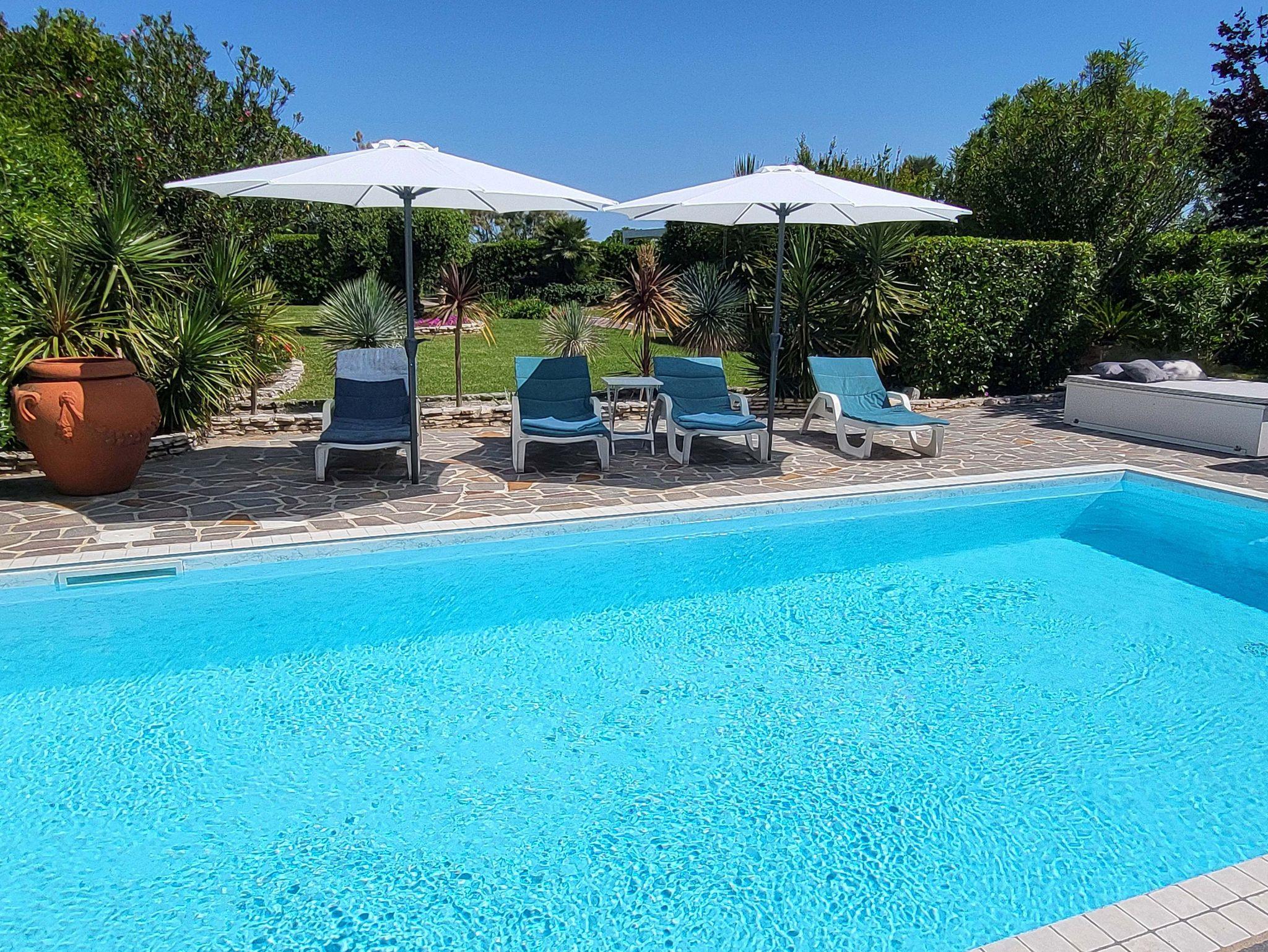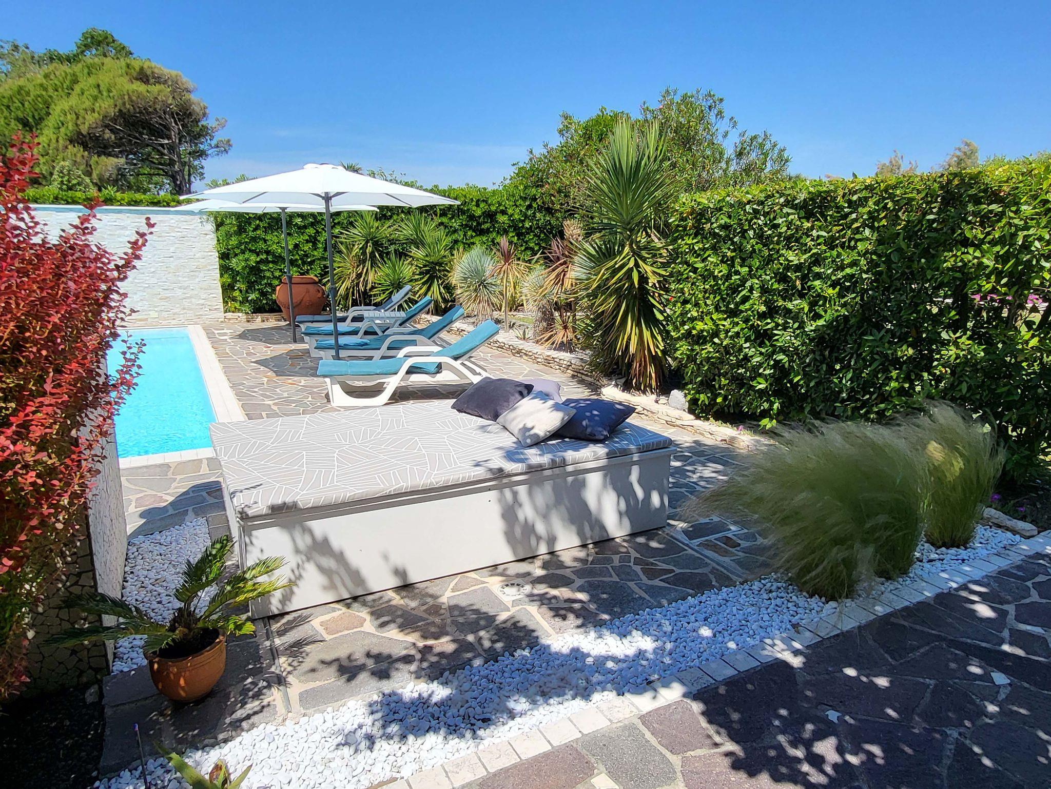 • Großer, gepflegter Garten mit sehr schönem Pool, Außendusche, Sonnenliegen, Sonnenschirmen sowie zahlreichen Sitz- und Liegemöglichkeiten mit sehr viel Privatsphäre