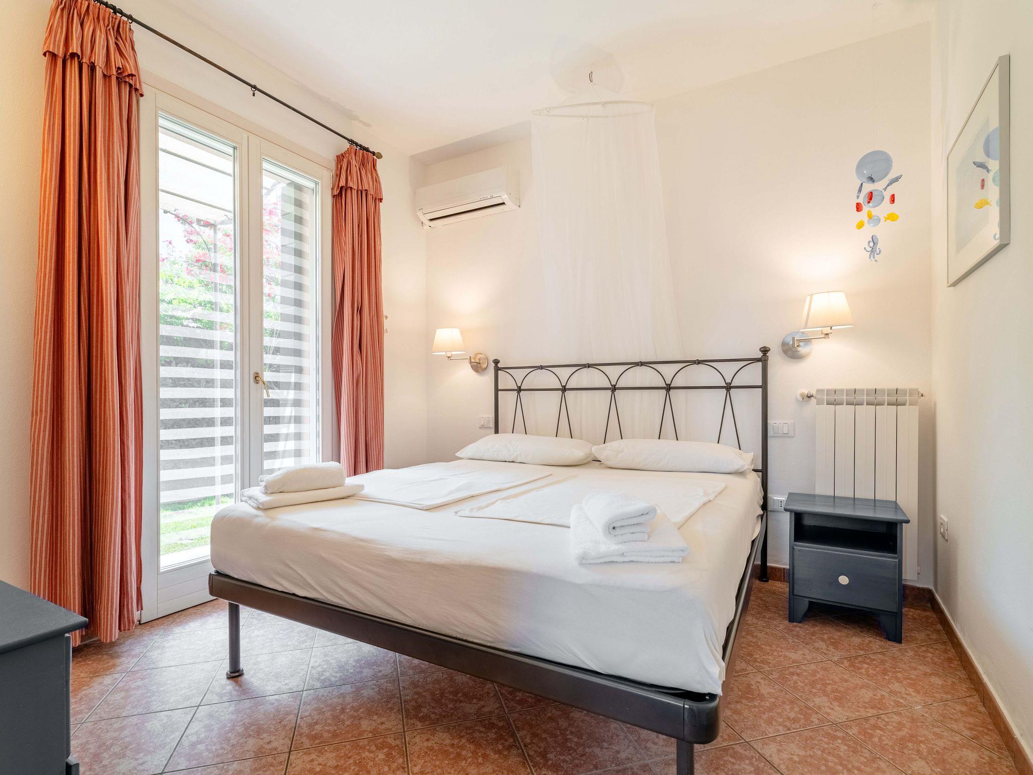 • Ein Schlafzimmer mit Doppelbett, großem Schrank, Kommode, Klimaanlage sowie Terrassentür mit direktem Zugang zum Garten