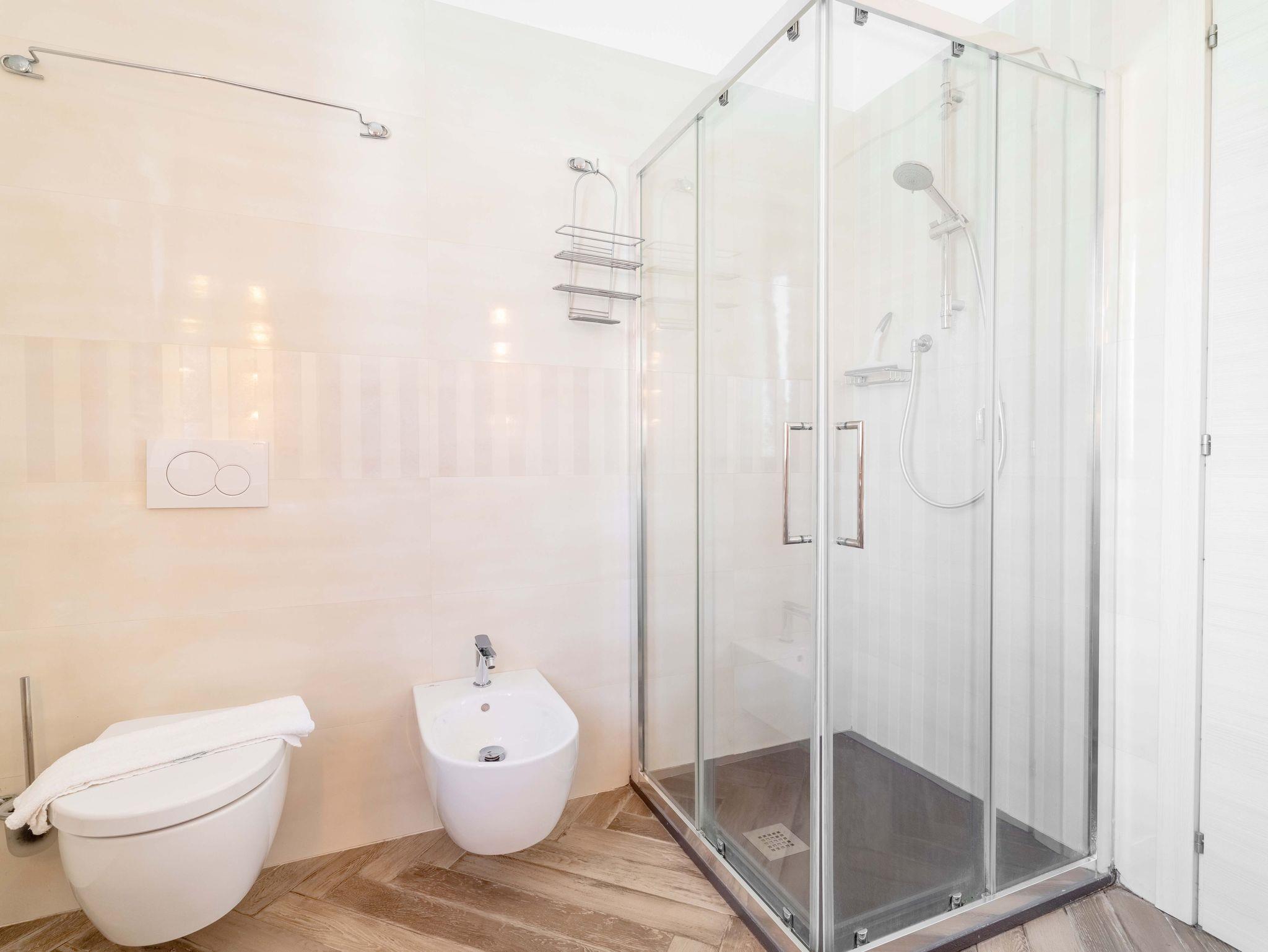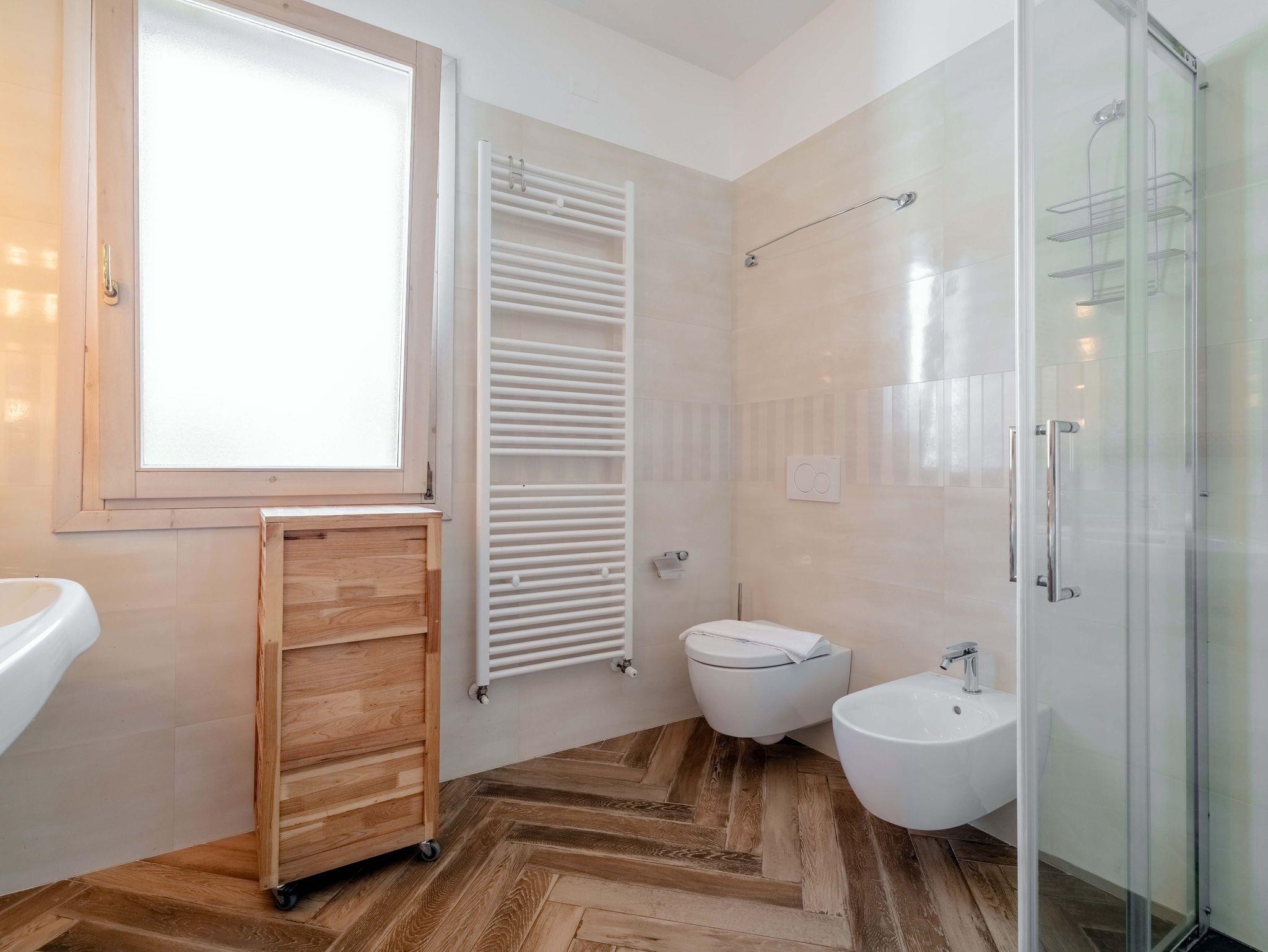 • Modernes Badezimmer mit großem Fenster, Dusche, Doppelwaschbecken, Bidet, WC, Föhn und Waschmaschine.