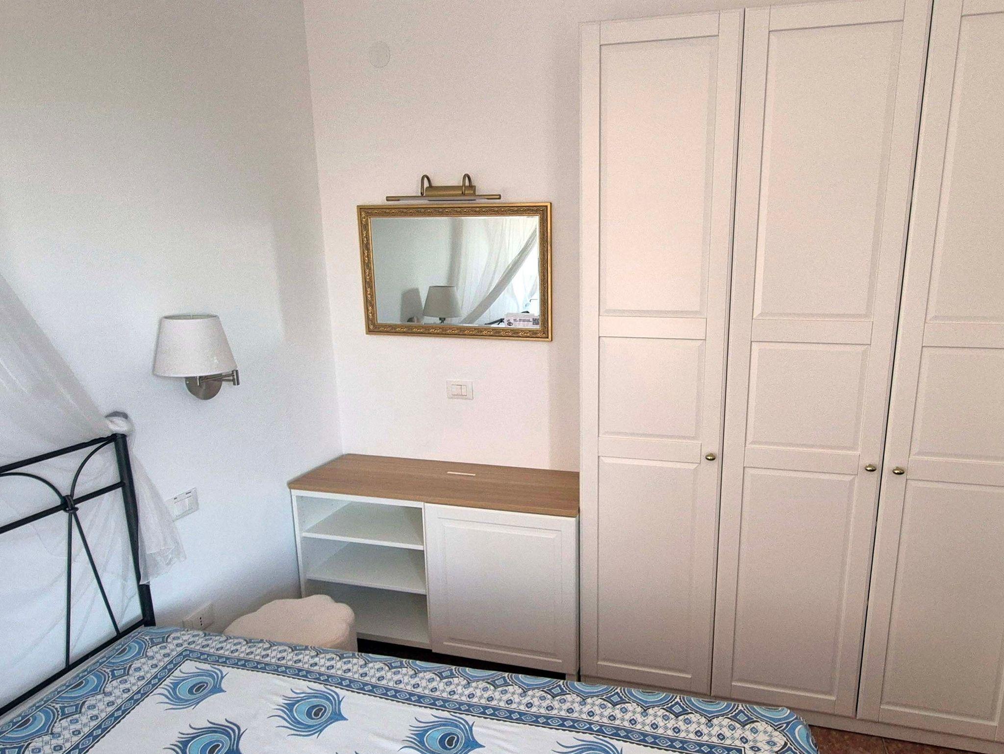 • Schlafzimmer mit Doppelbett, großem Schrank, Kommode, Bücherregal, Sat-TV und Klimaanlage sowie Tür zur Dachterrasse mit traumhaftem Meerblick