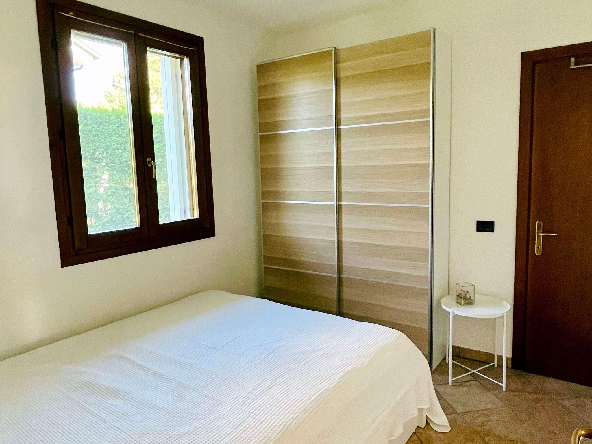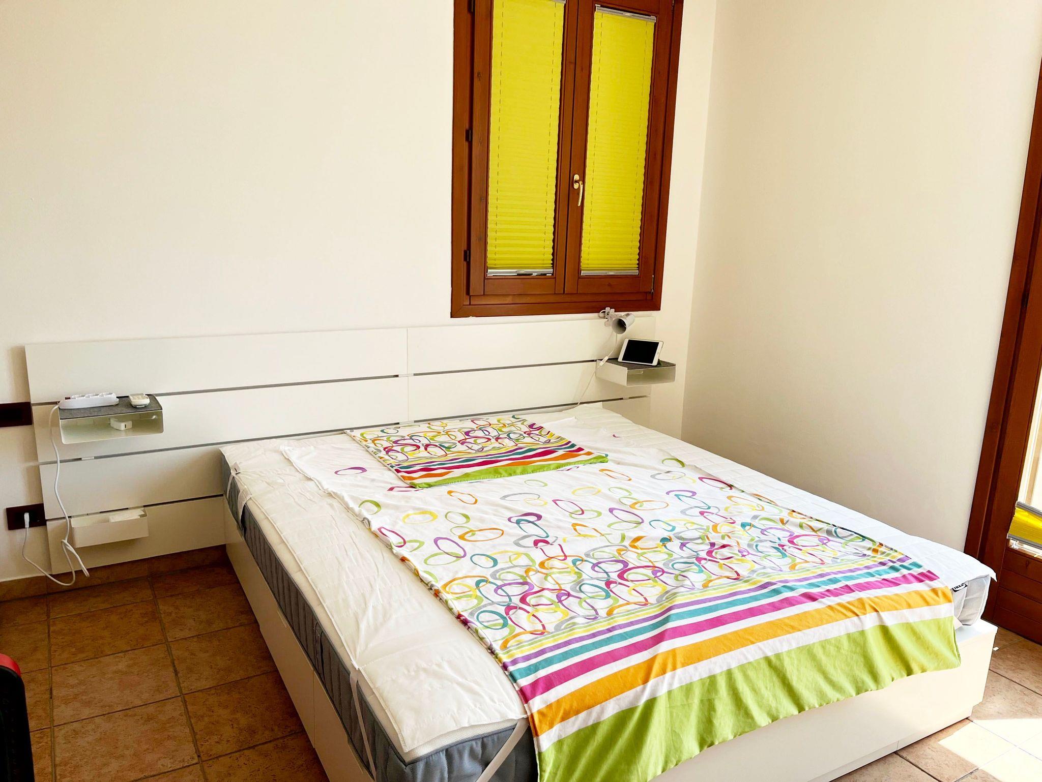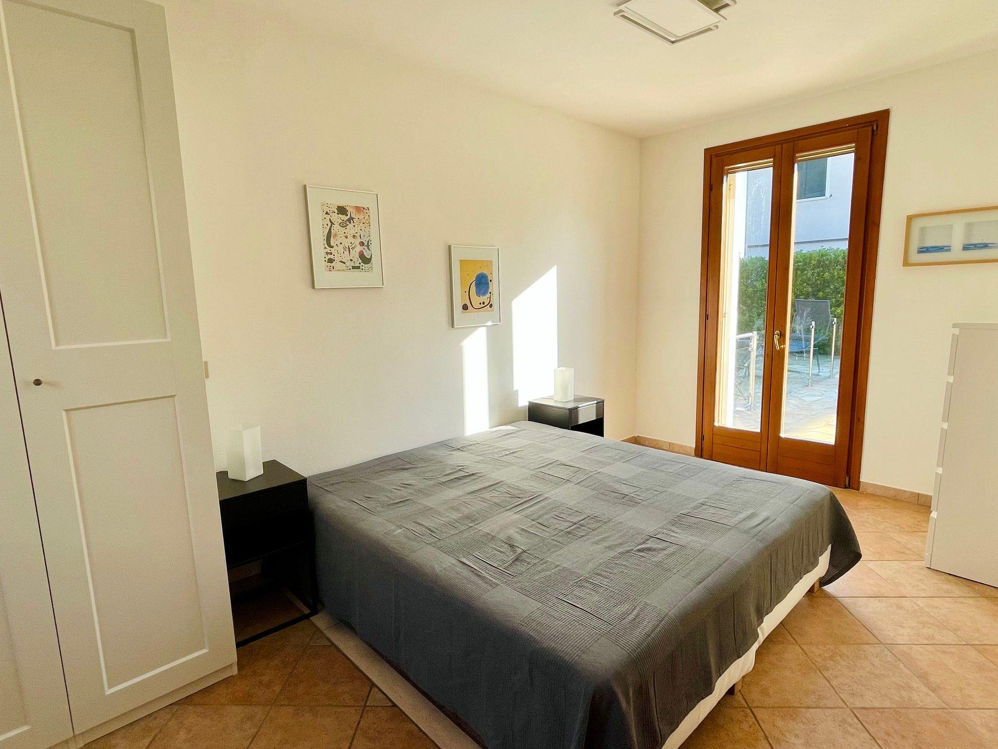 Ein Schlafzimmer mit Klimaanlage und 180 x 200 cm-Doppelbett, Schiebetüren-Schrank mit eigenem Bad (en suite) mit Dusche, Bidet und Wc, Zugang zum großen Süd-Balkon