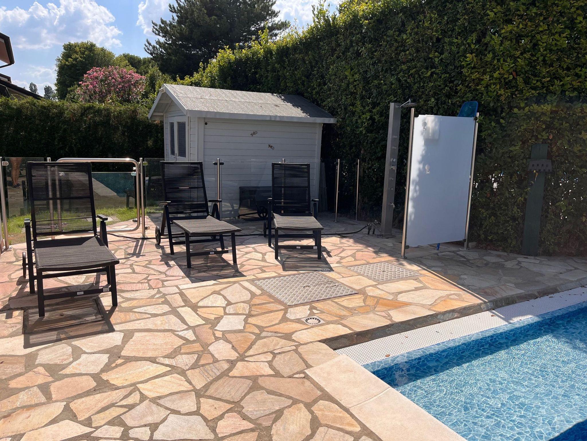 ca. 9 x 4m großer Pool, Warmwasserdusche im Freien und kindersicheres Poolsystem aus Verbundsicherheitsglas mit Edelstahlstützen und kindersicheren ZugangstürenGroßer, eingezäunter und praktisch uneinsehbarer Garten mit Spielplatz.