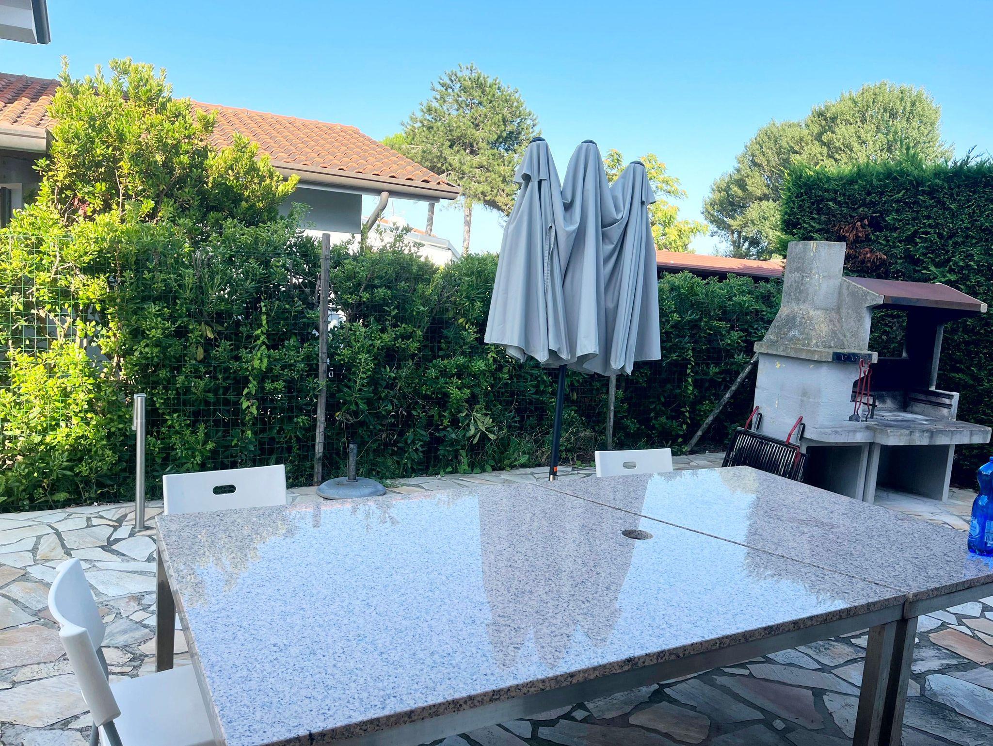 Hinter dem Haus, begehbare Terrasse mit 2 großen Sonnenschirmen, Granit-Terrassentisch für 10-12 Personen, ausreichend Gartenmöbel und Liegestühle, gemauerter Außengrill.
