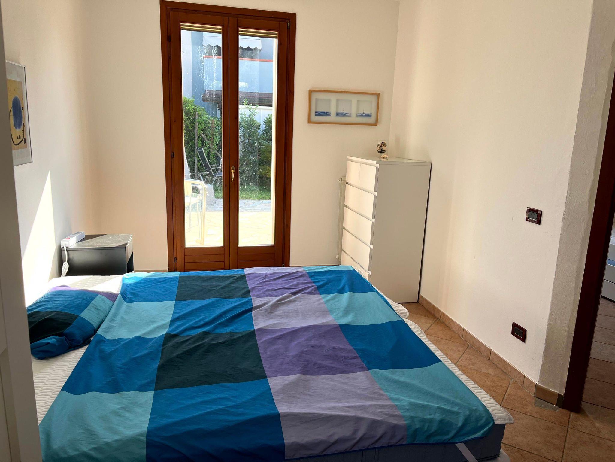 Ein Schlafzimmer mit Klimaanlage, zwei 90 x 200 cm-Betten (á max. 80 kg), zusätzlicher Zugang zur Terrasse