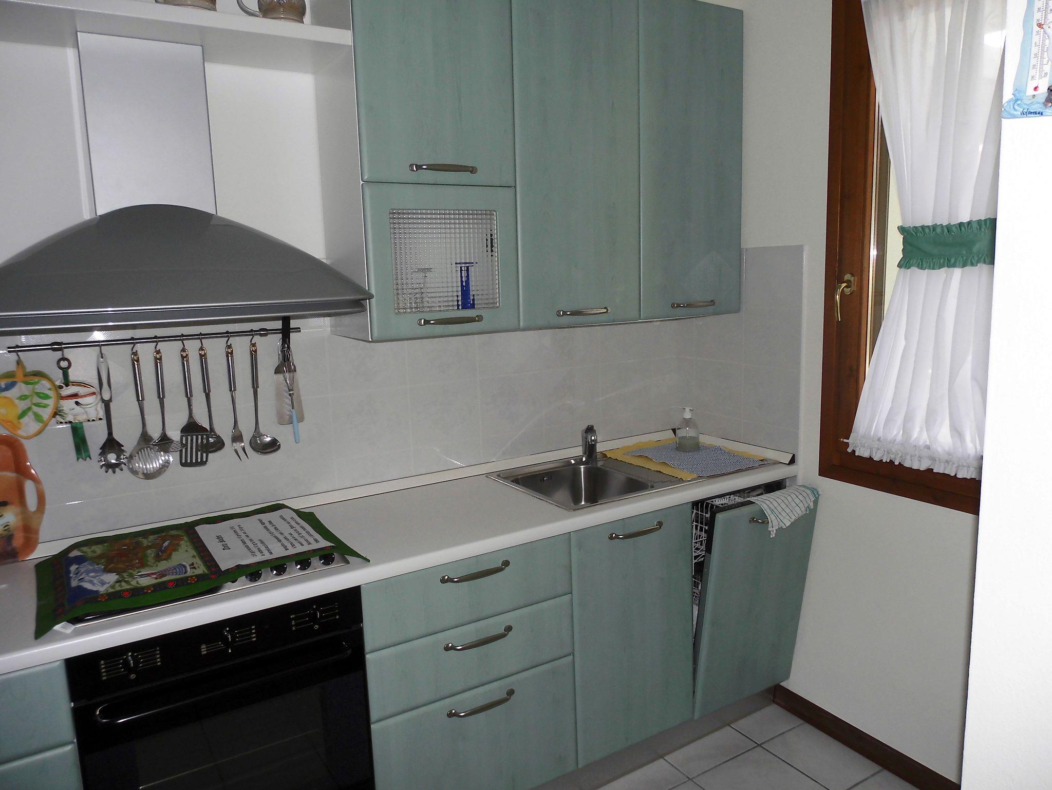 • Schöne Küche mit Kaffeemaschine, Spülmaschine, Kühlschrank mit kleinem Gefrierfach, Gasherd und Backofen