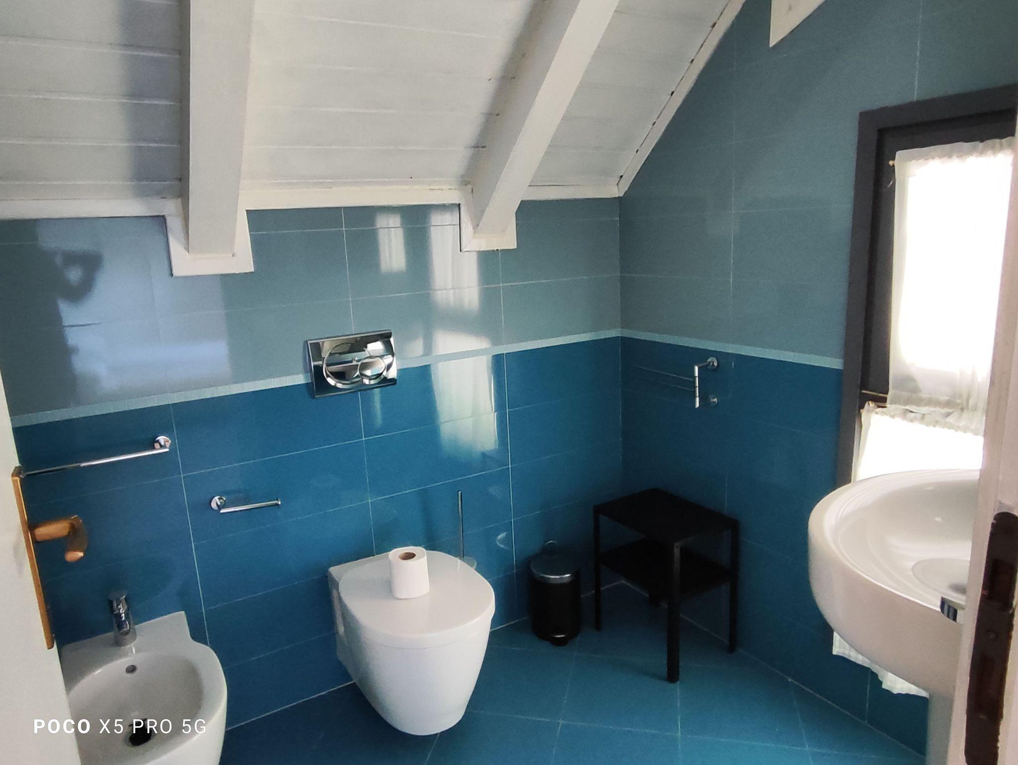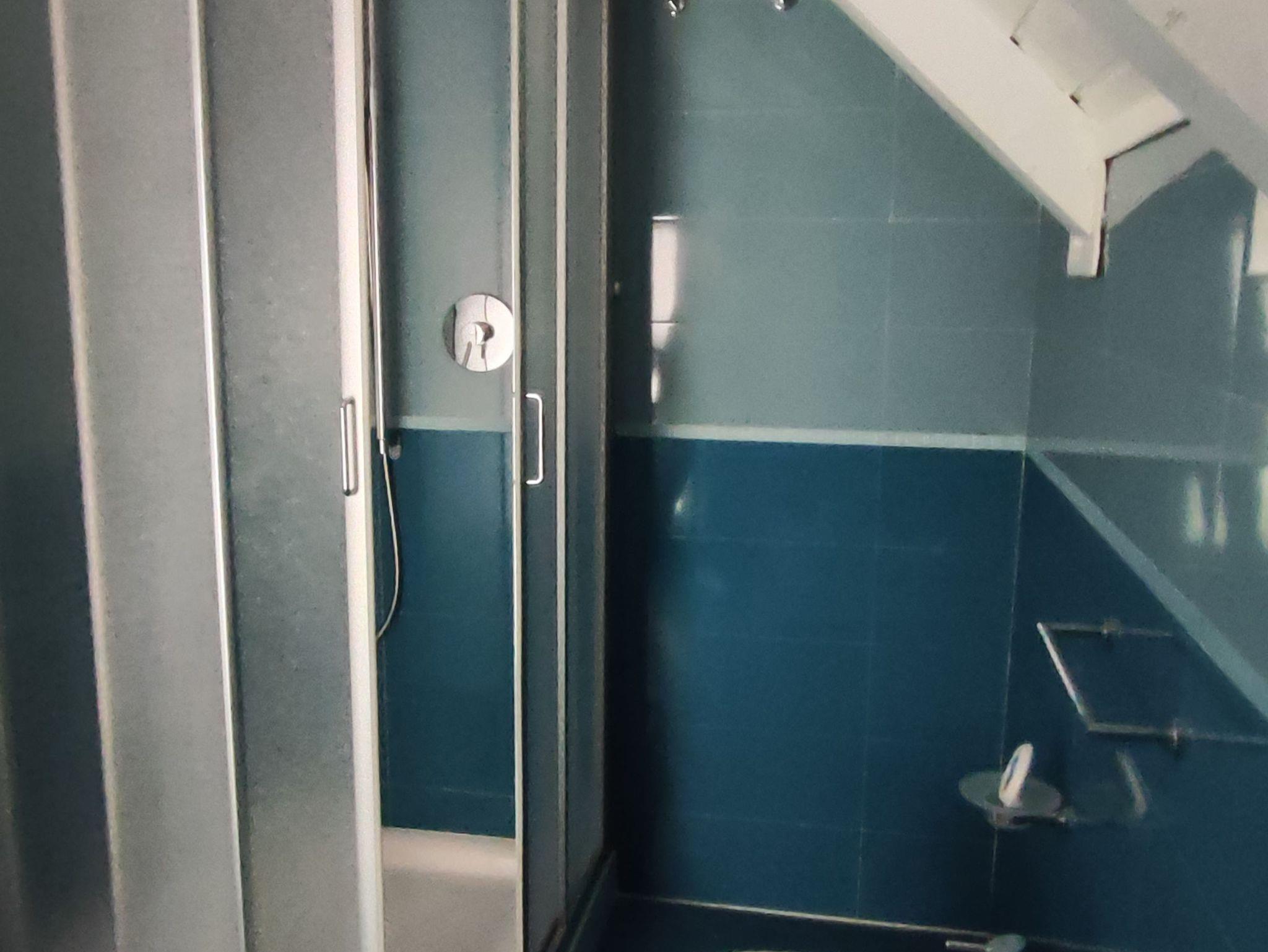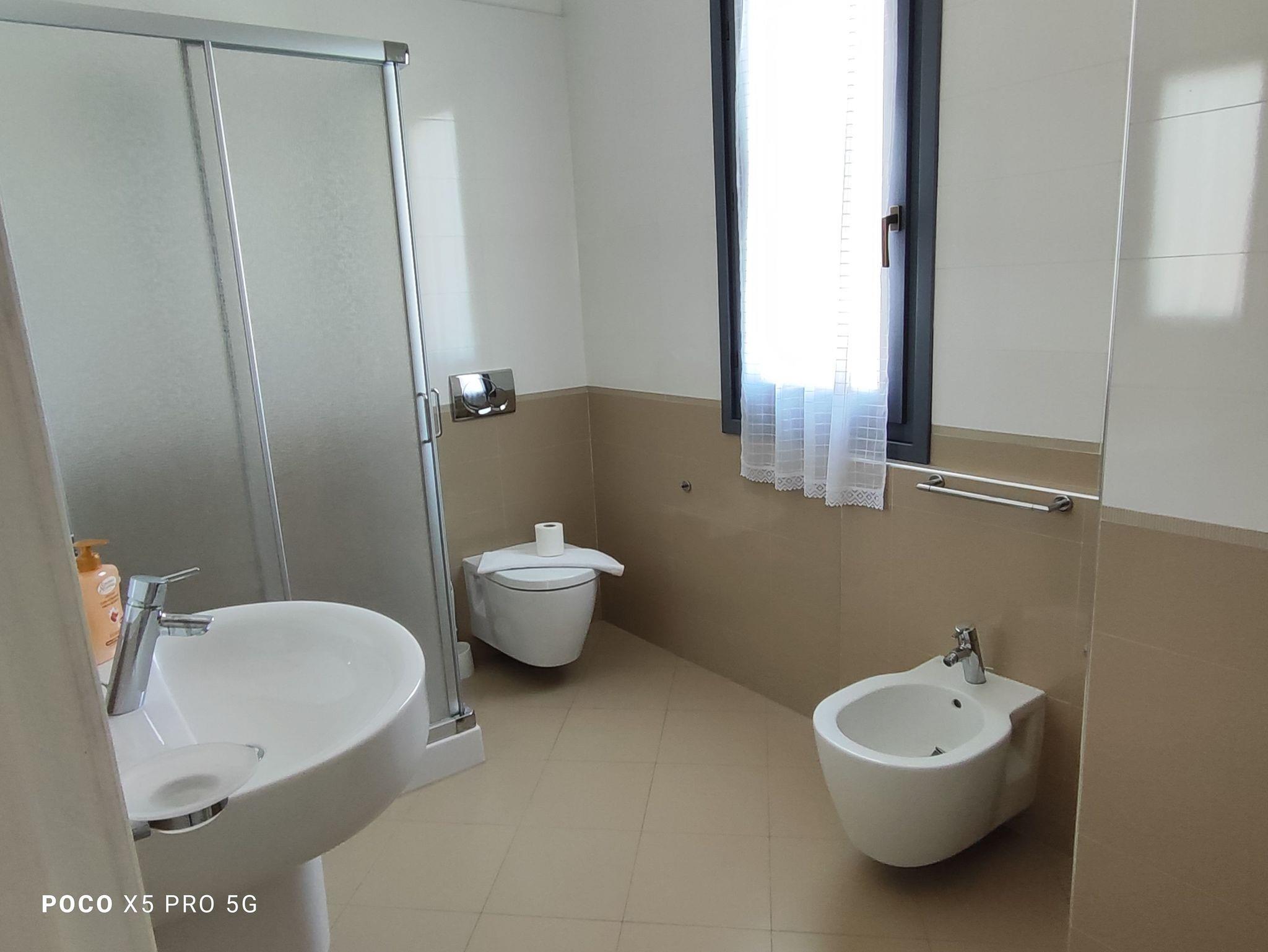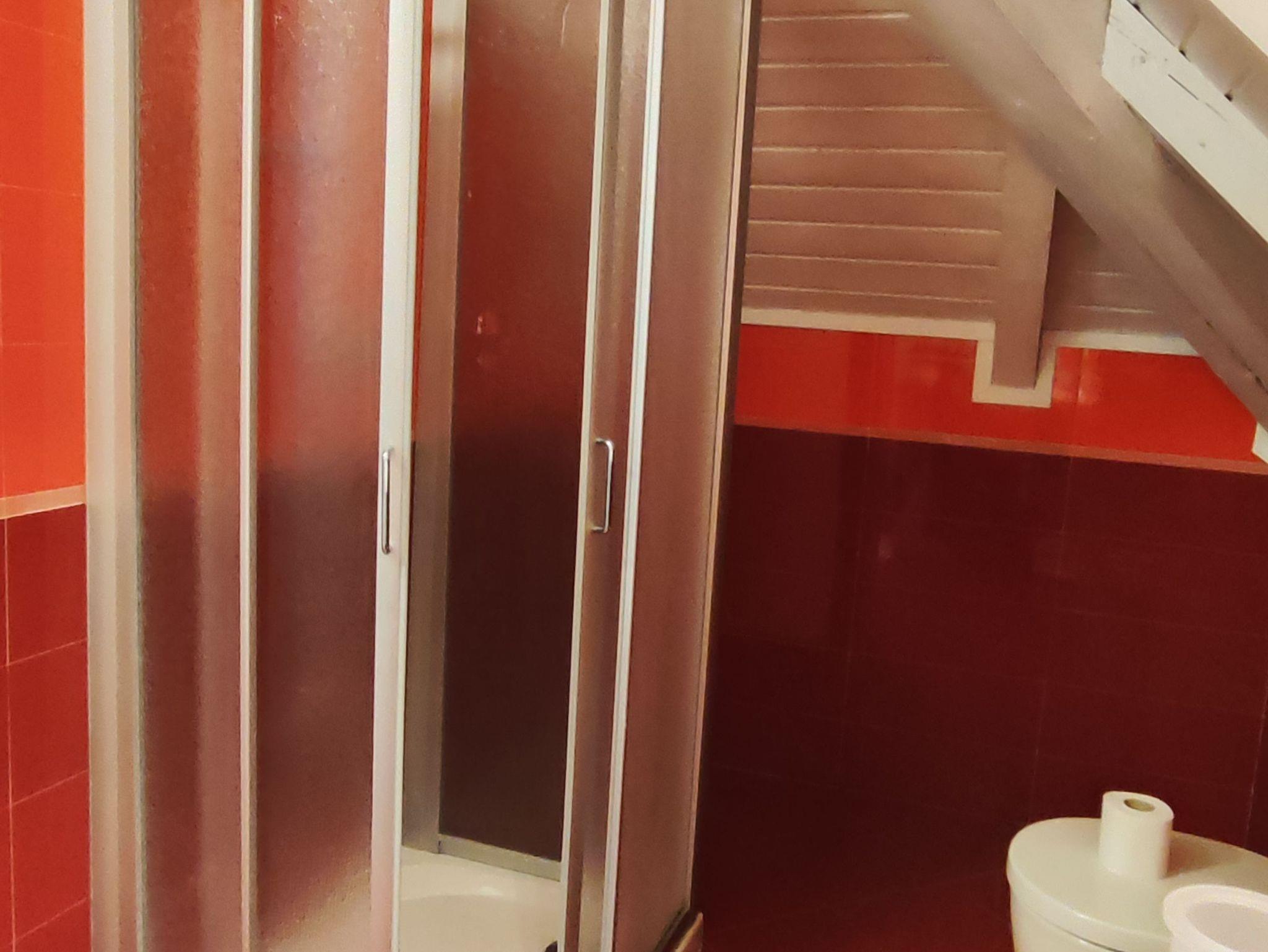 Una camera con letto matrimoniale e un bagno con doccia e bidet.