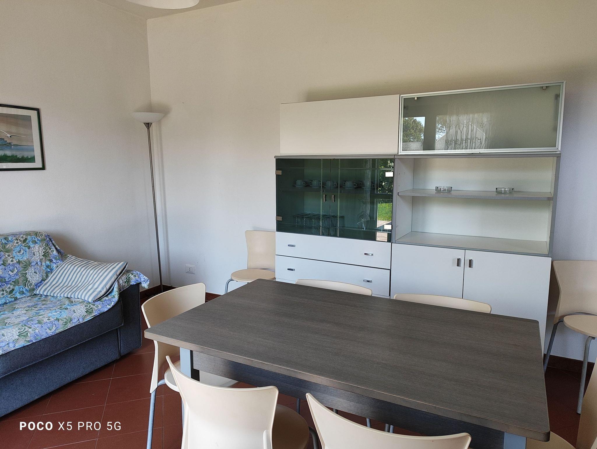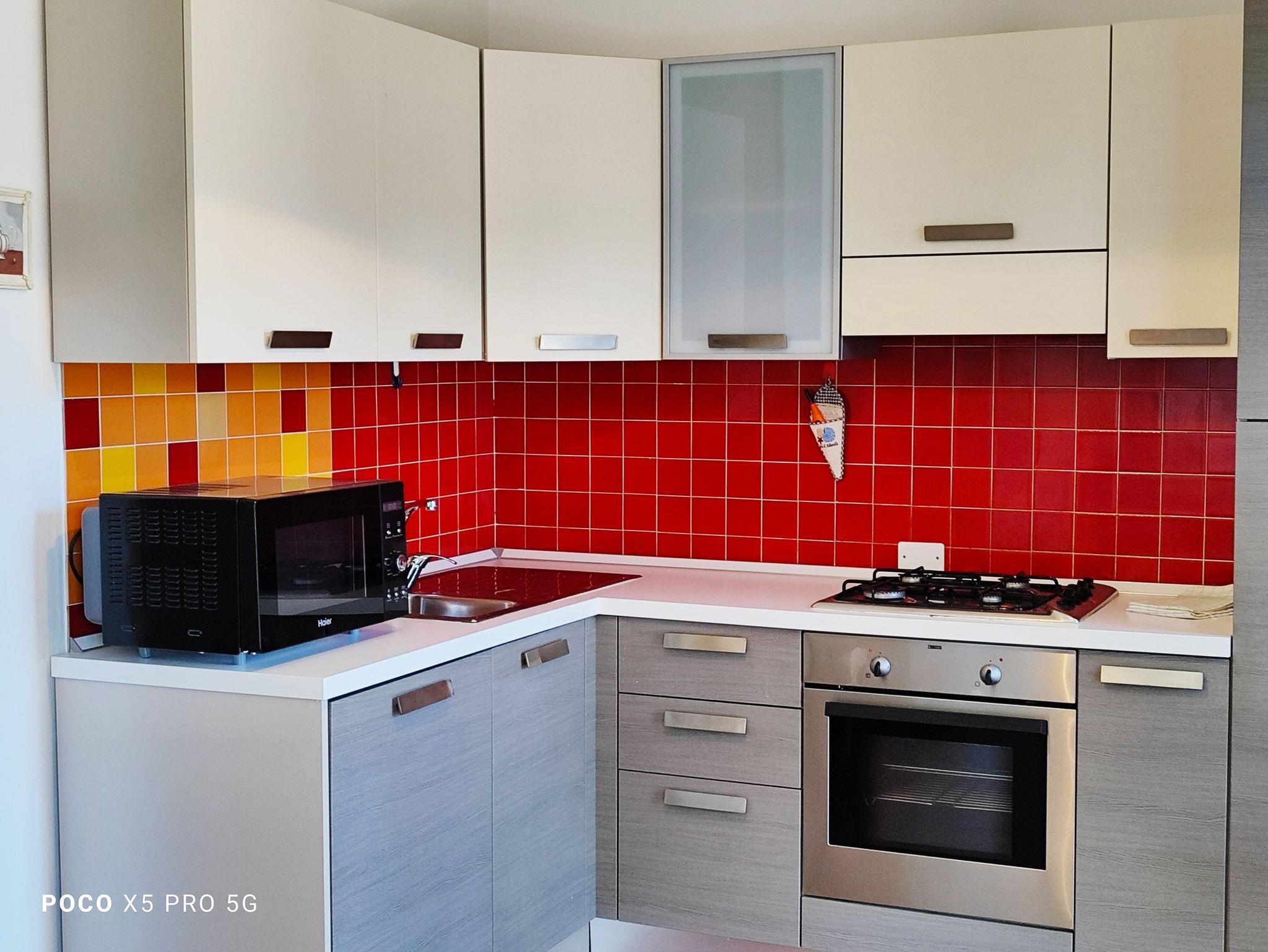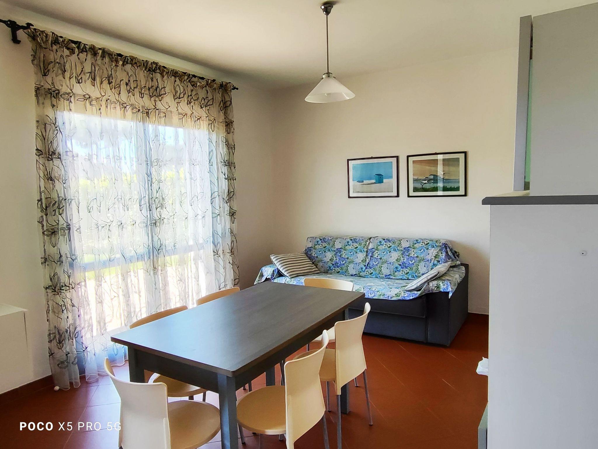 Luminosa zona giorno con divano letto, TV e angolo cottura ben attrezzato.