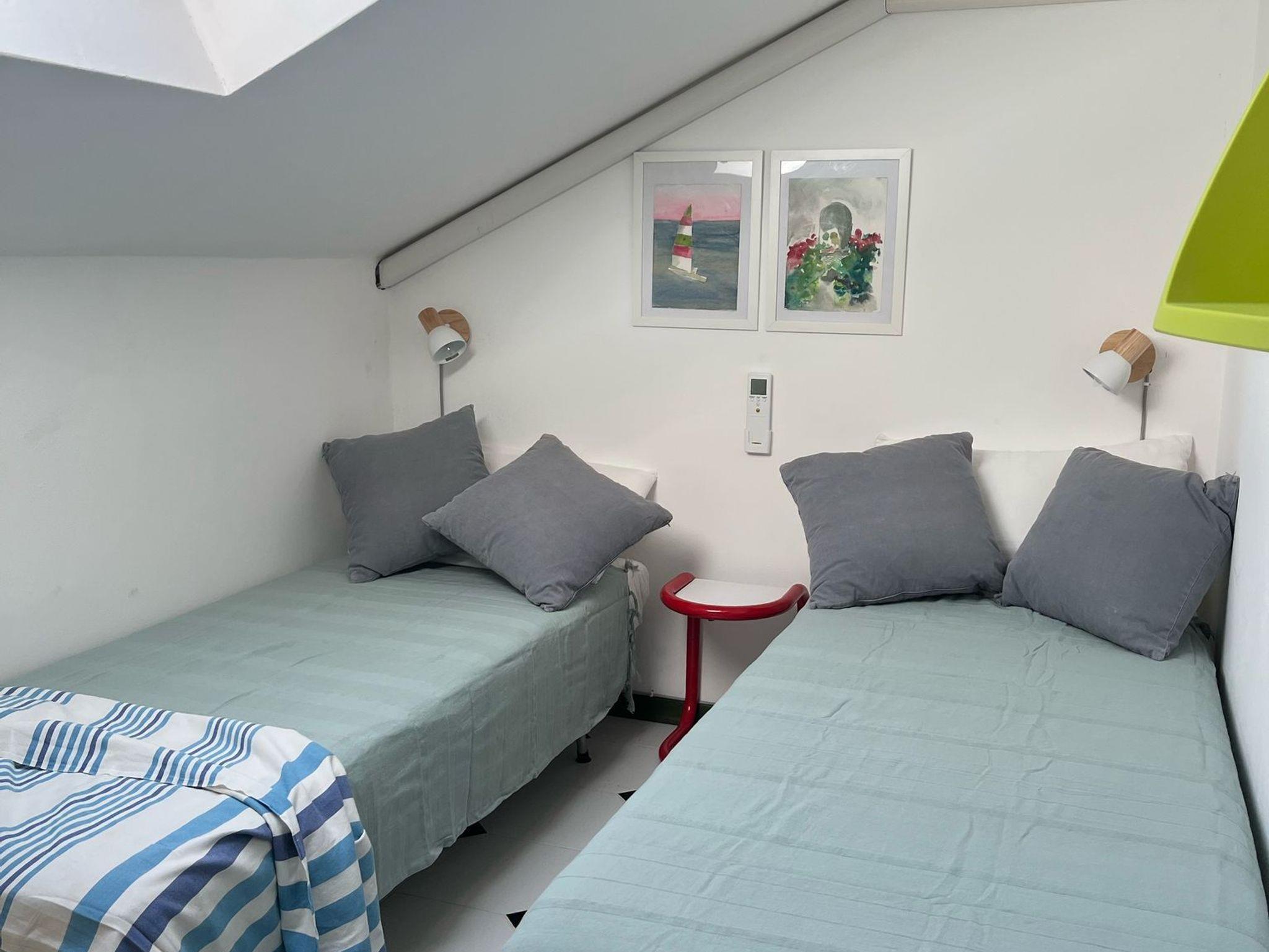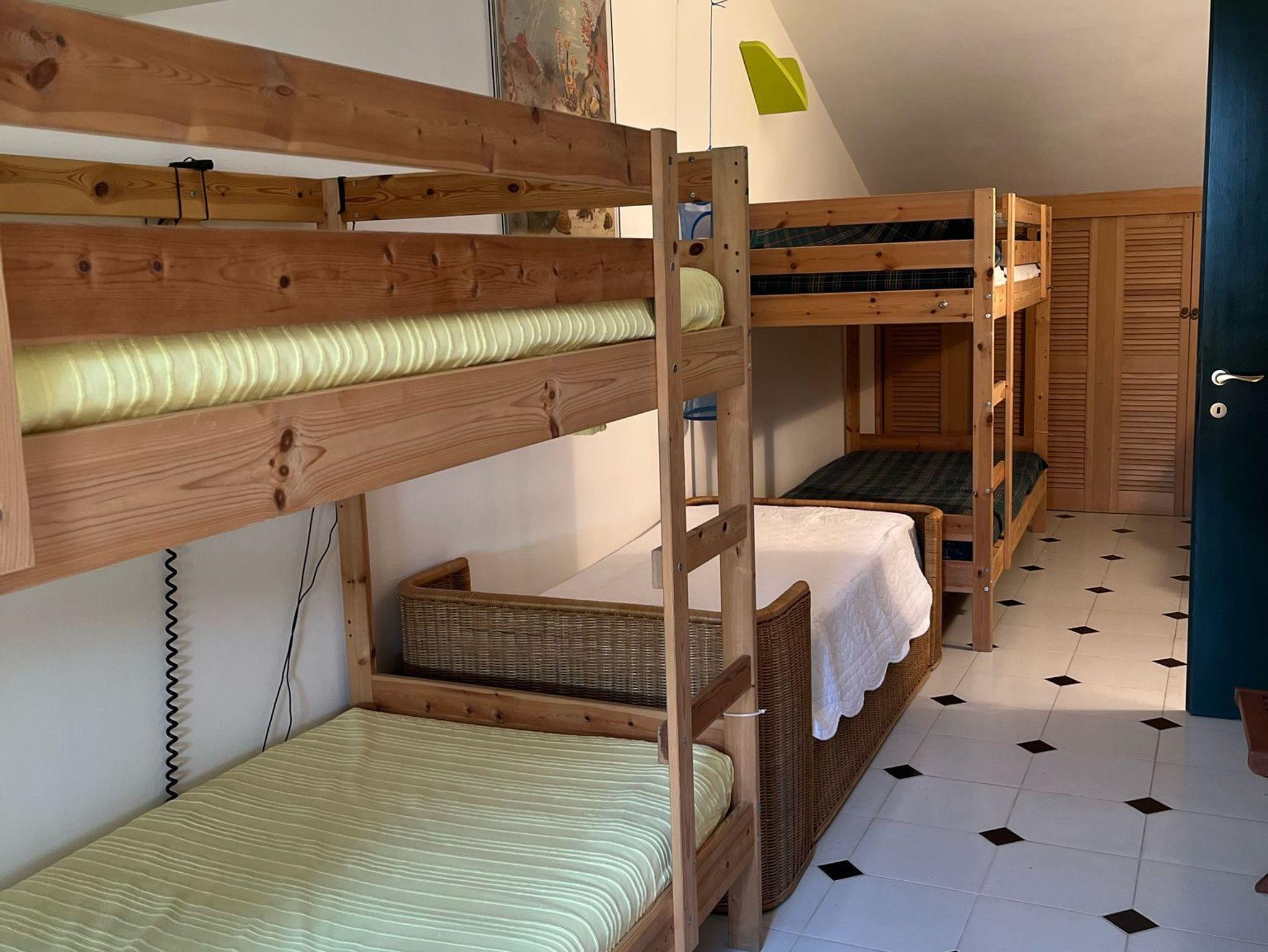 - Ein Schlafzimmer mit zwei Etagenbetten und einem zusätzlichen Einzelbett