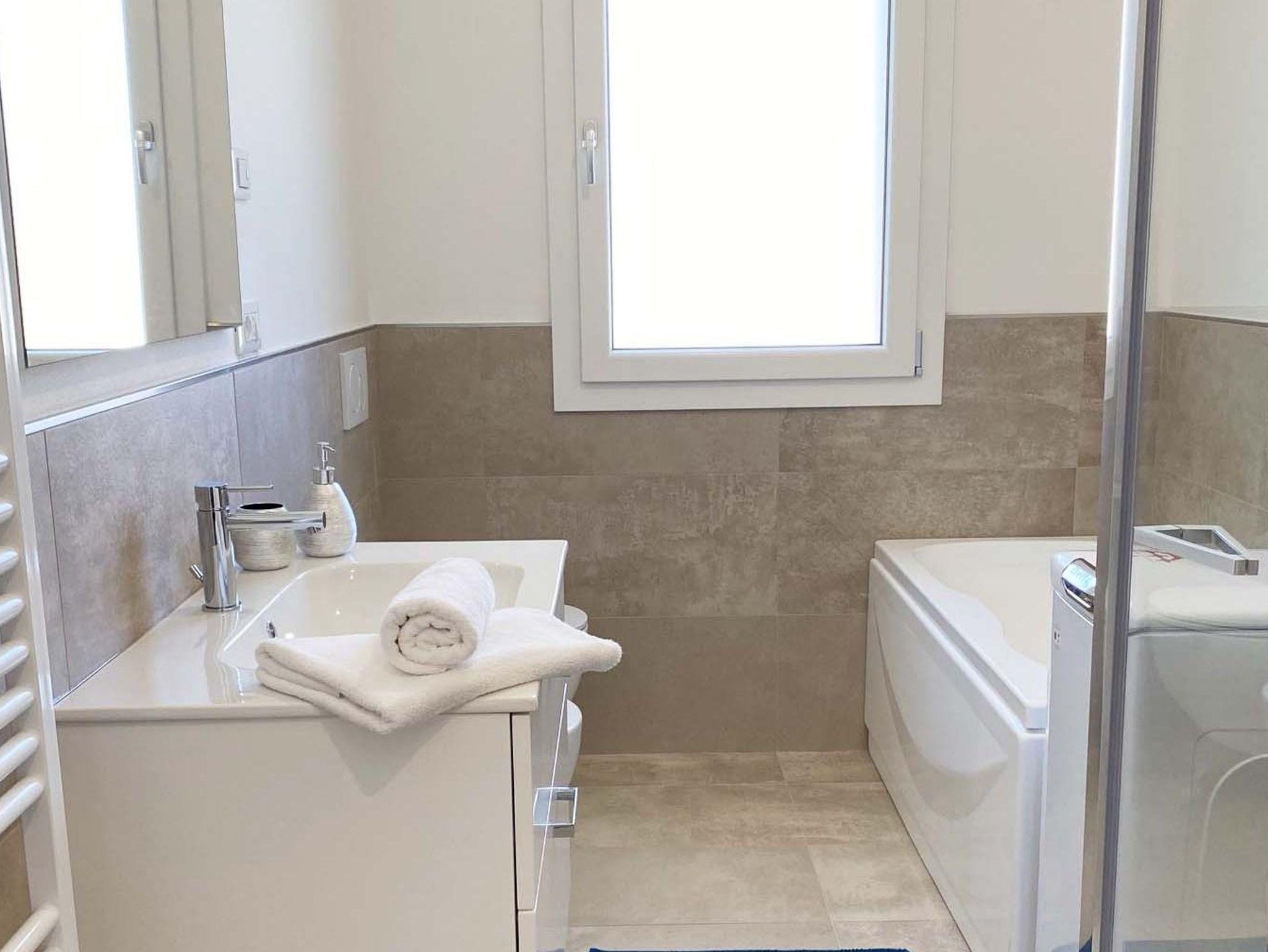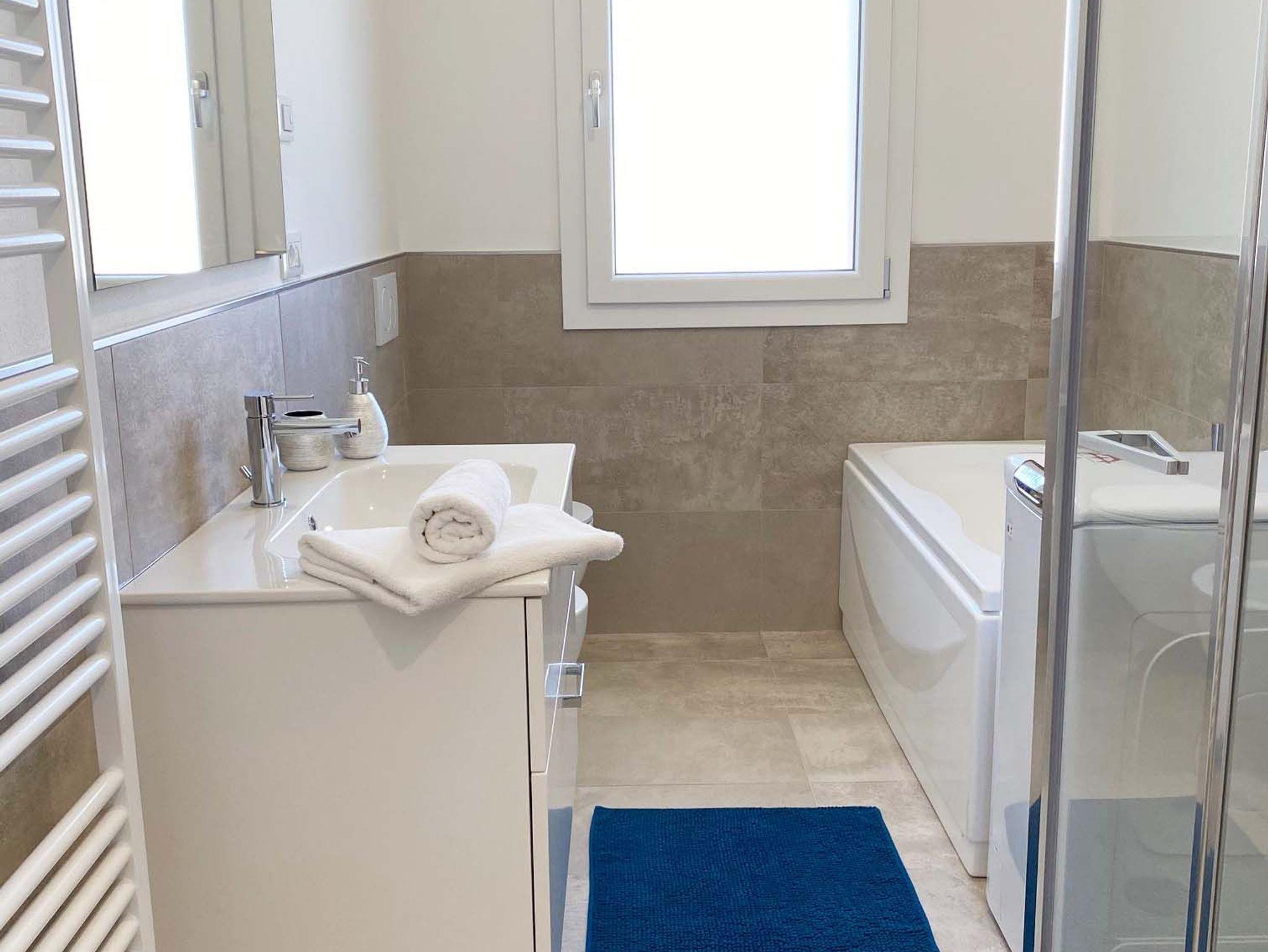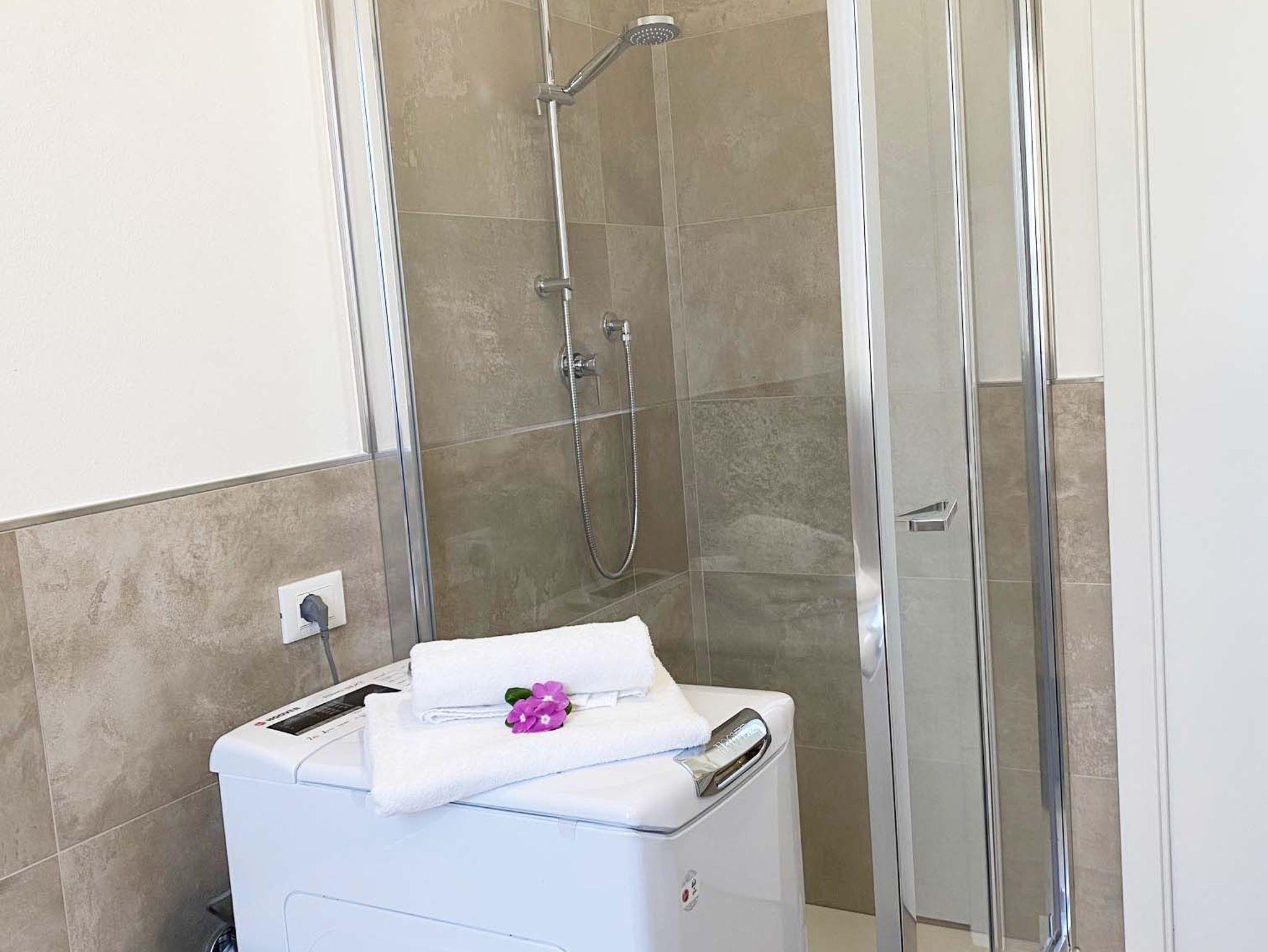 • Ein Badezimmer mit Dusche, Badewanne, WC, Bidet und Waschmaschine