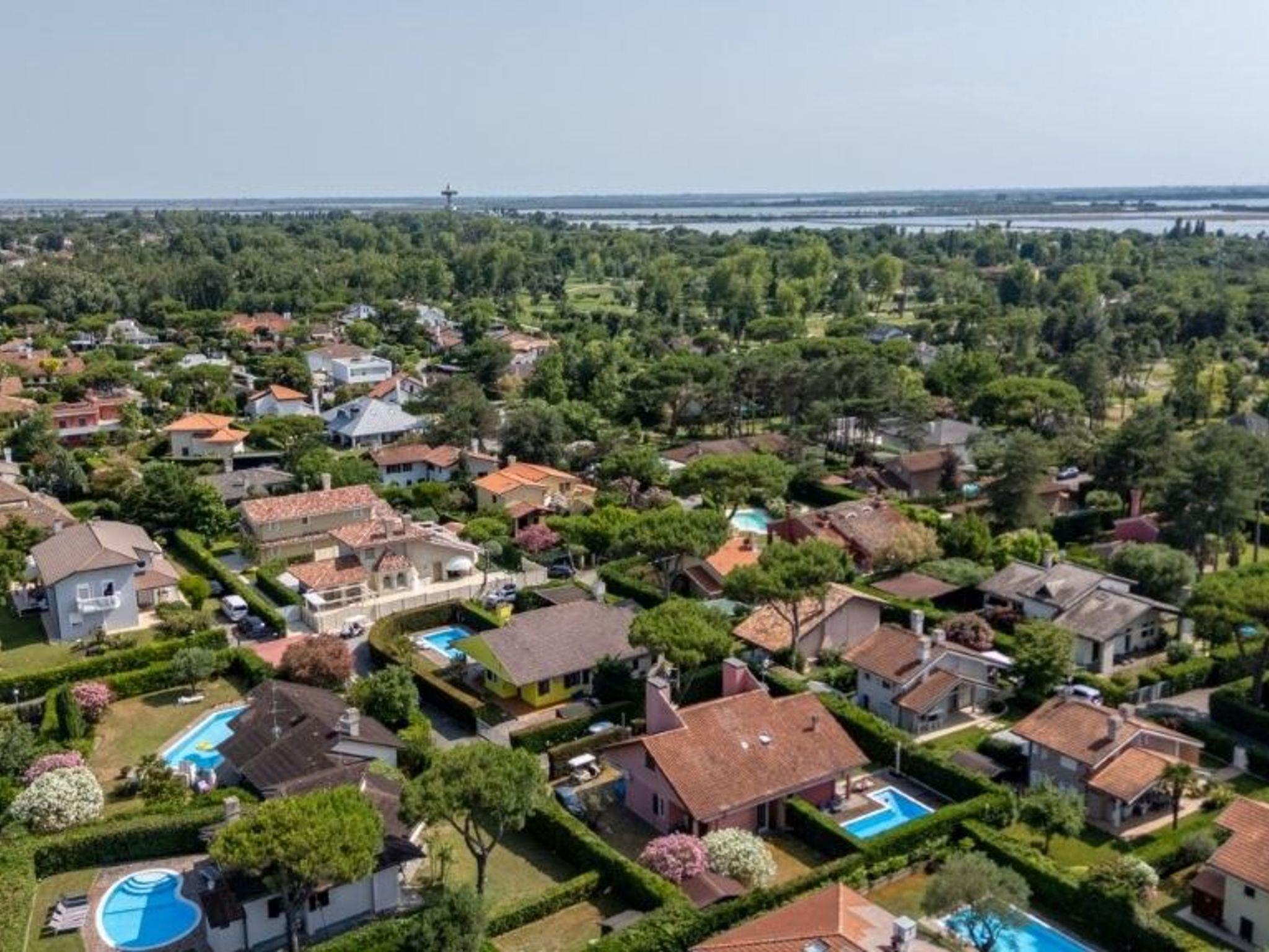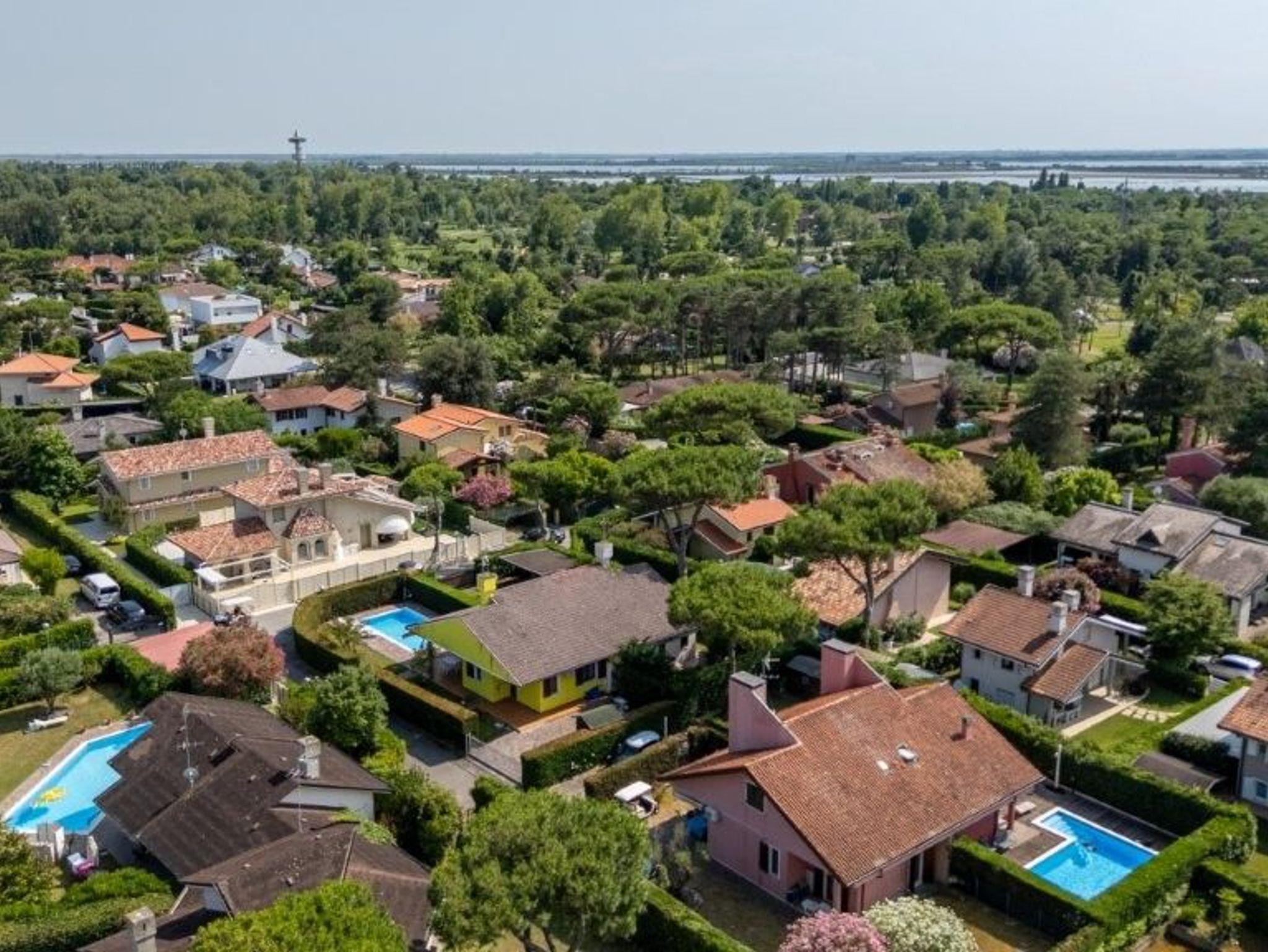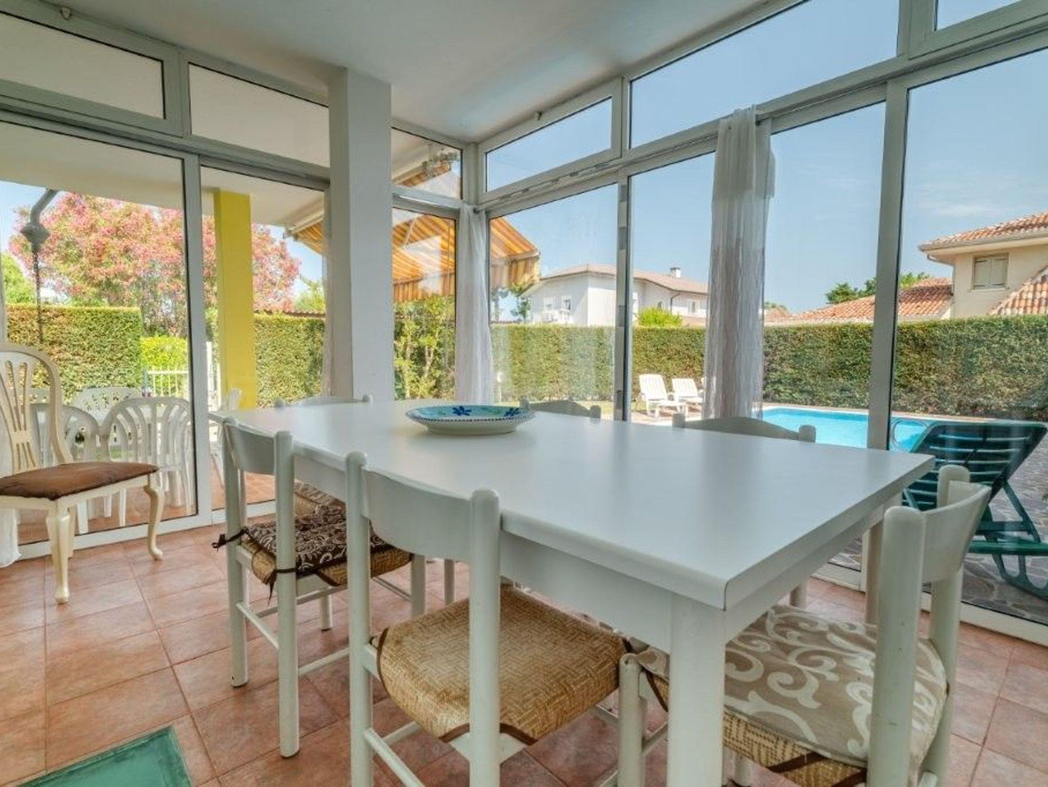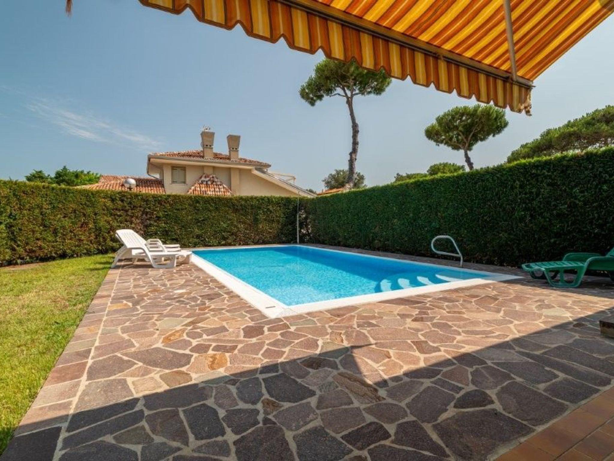 Ein gepflegter, geschlossener Garten mit großer Terrasse, Pool mit Treppe, Gartenmöbel, Gartenliegen, Gartendusche, Außengrill