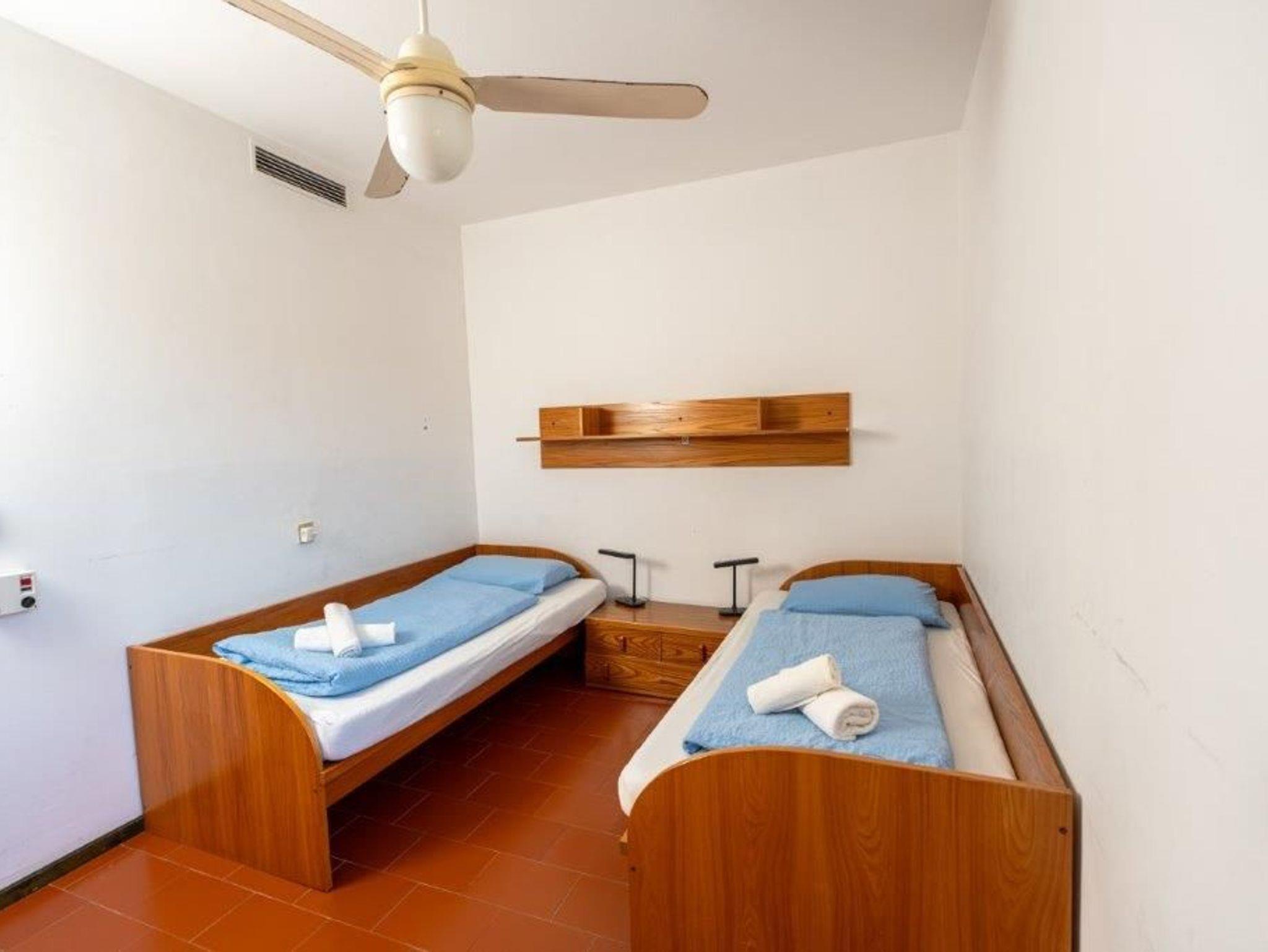 • Ein Schlafzimmer mit zwei Einzelbetten und Ventilator