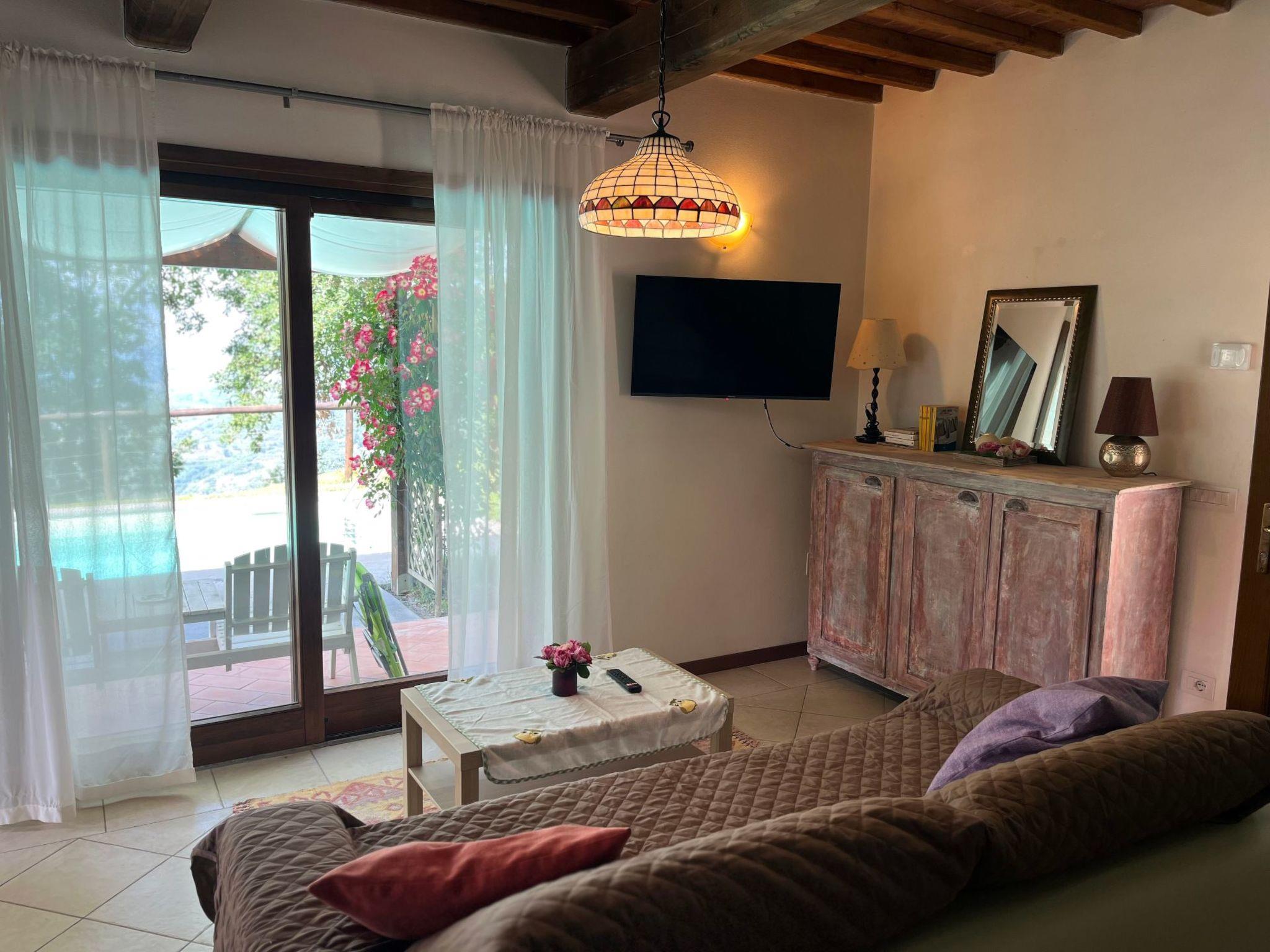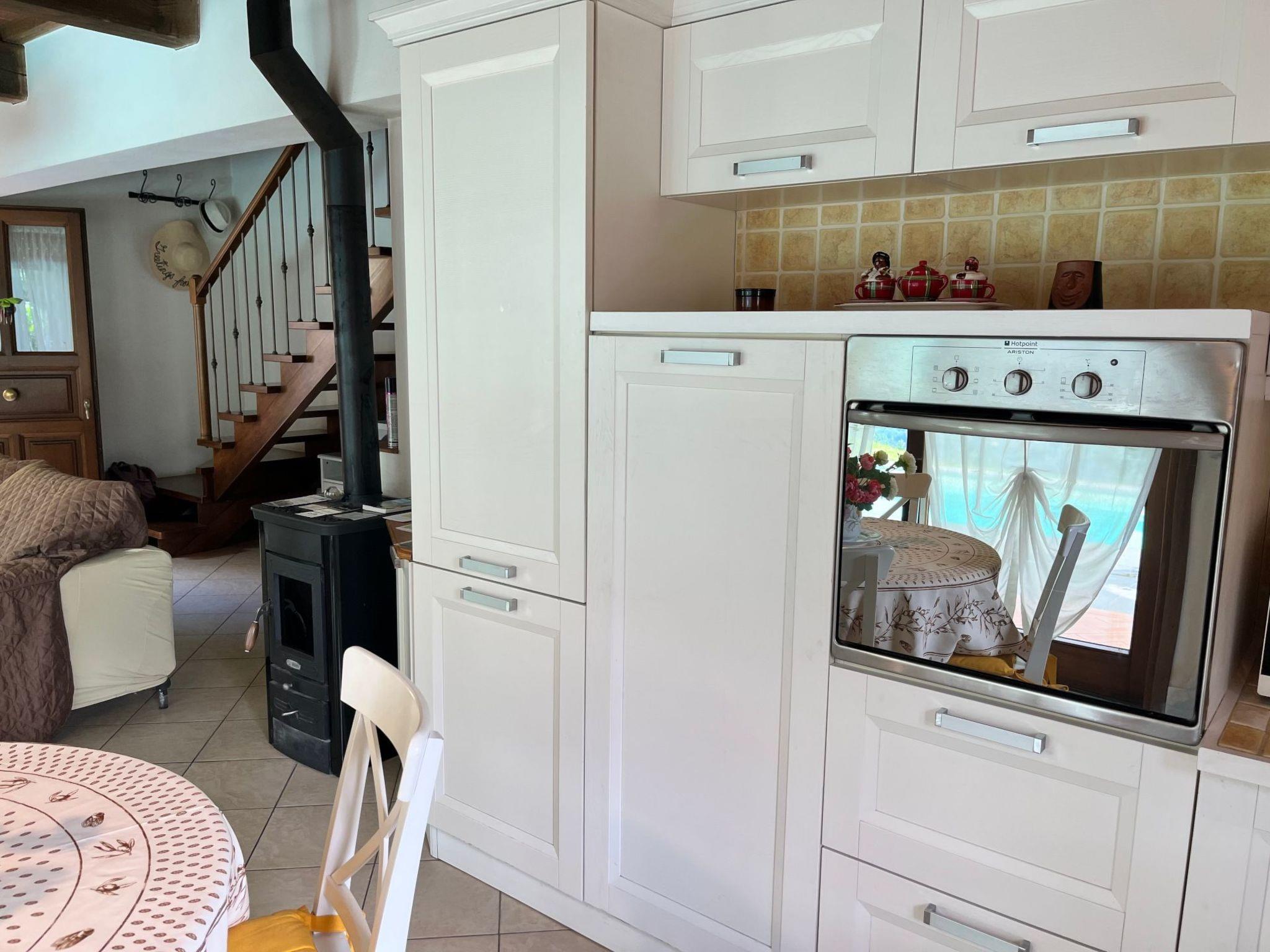 On two levels, large living room with sofa and TV as well as kitchen area with dining table. Bathroom with toilet, bidet and washbasin plus washing machine. On the first floor 2 bedrooms, one double and one twin, bathroom with shower, toilet, bidet and washbasin. Modern in taste but with the charm of Tuscan houses. The house has heating. From the living room, through a large, bright window, there is access to the veranda facing the pool.
