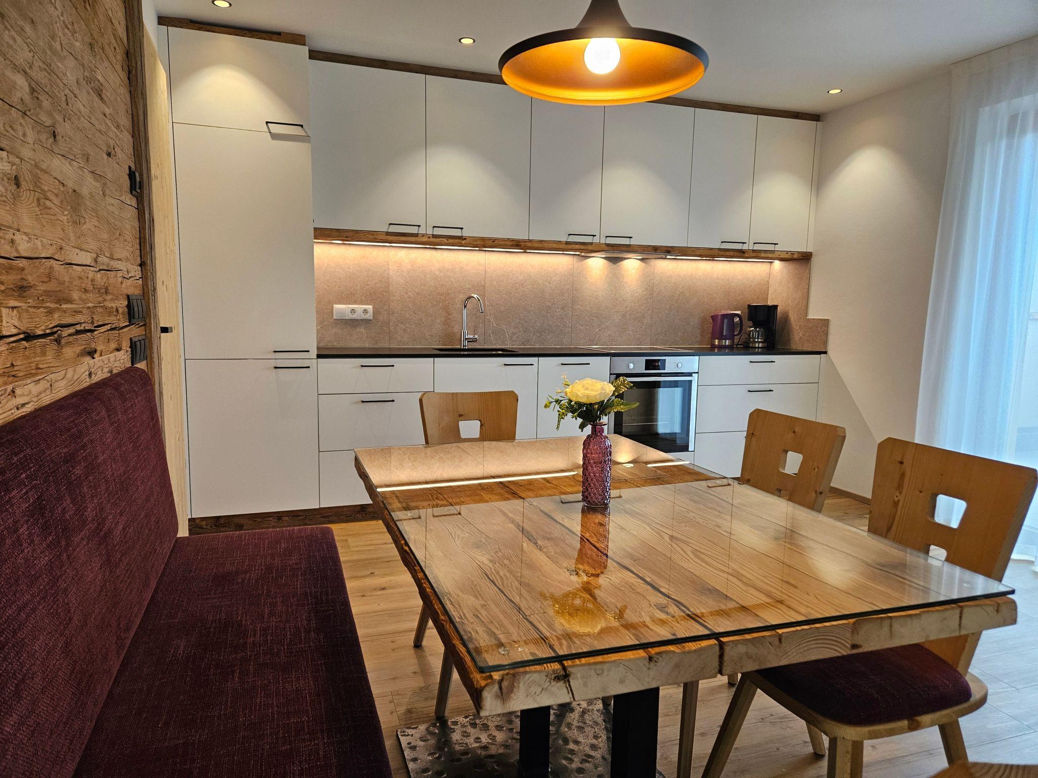Our new chalet flats are made of natural Tyrolean wood and offer an exceptionally cosy ambience for 2 to 4 people. Each flat is equipped with a bedroom with a double bed, a pull-out double sofa bed, a kitchen with modern appliances such as ceramic hobs, oven, coffee machine, kettle and toast with grill function. All flats also have a TV, WiFi, a bathroom with shower/WC/bidet, hairdryer and a balcony. Heating and electricity are included for your comfort.