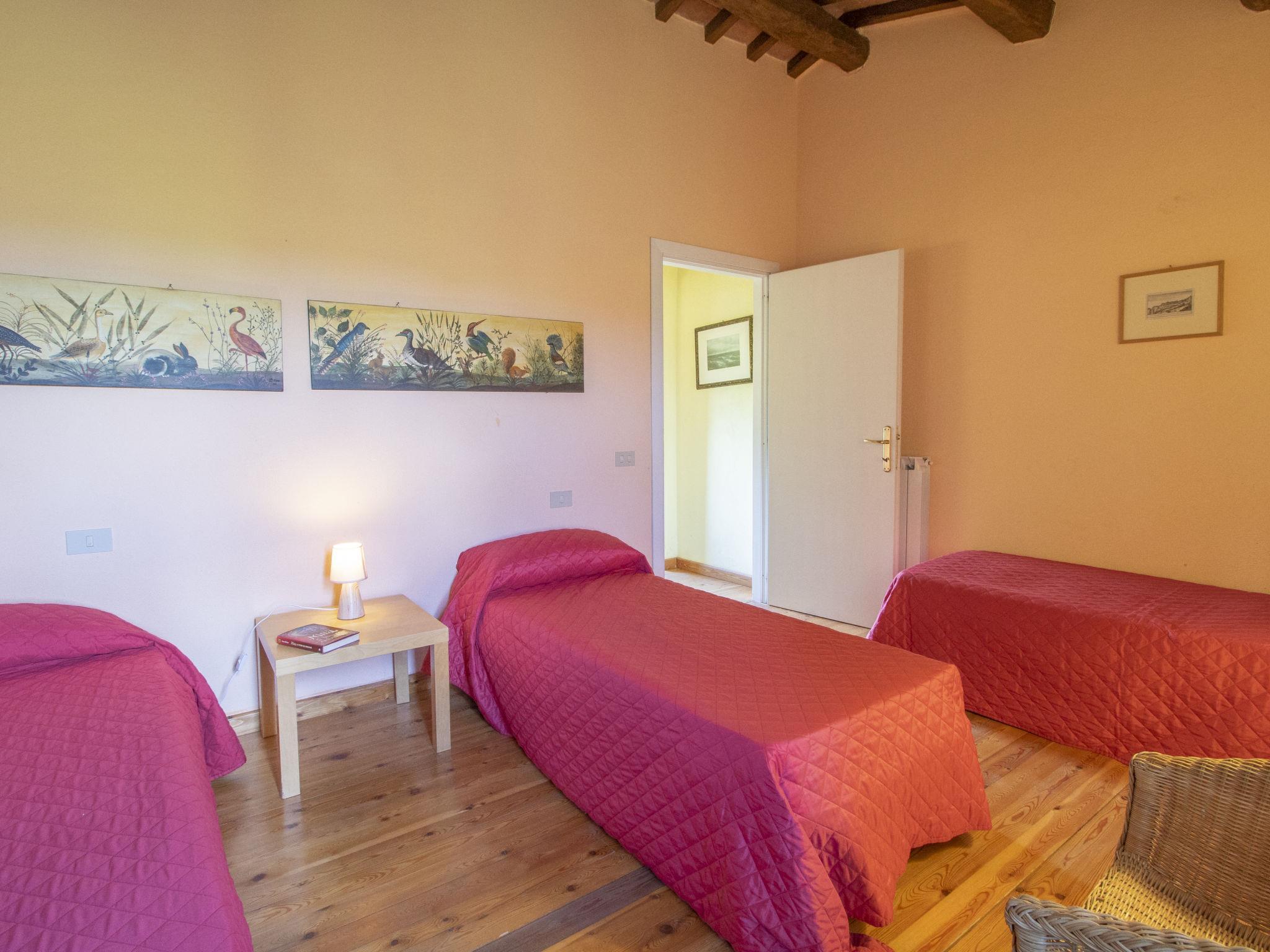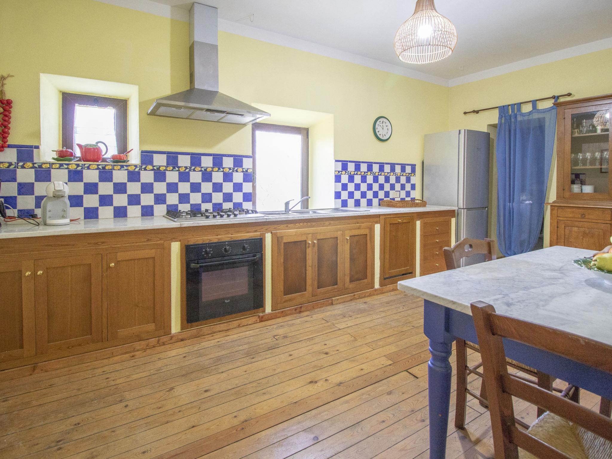 "Casale Vitello", 9-room house 350 m2 on 3 levels. Renovated, rustic and tasteful furnishings: living room with open-hearth fireplace, hi-fi system and DVD. Exit to the garden. Living room with TV and flat screen. Dining room with open-hearth fireplace. Exit to the garden. Kitchen (oven, dishwasher, 5 gas rings, toaster, kettle, freezer, electric coffee machine) with dining table. Sep. WC. Gas heating. On the lower ground floor: 1 double bedroom with shower/bidet/WC. Exit to the garden. 1 room with 2 beds and shower/bidet/WC. Upper floor: (open staircase), 1 room with 1 bed, 1 double bed and bath/bidet/WC. 1 room with 3 beds and shower/WC. 1 room with 3 beds. 1 room with 3 beds and shower/WC. Exit to the garden. Shower/WC. Gas heating. Wooden floors. Patio, patio. Terrace furniture, barbecue. Very beautiful view of the countryside. Facilities: washing machine, mosquito net, children's high chair, baby cot. Internet (WiFi, free). Please note: one double bedroom is outside the apartment. Non-smoking house. Maximum 2 pets/ dogs allowed. When booking at the price for 12 persons not available: the 2 bedrooms and 2 showers / WCs downstairs (unheated) connected externally to the house. In the winter period the house can be booked only for 12 people. When there are less than the maximum number of guests staying at the property, not all of the bedrooms will be available for use. IT056001B52NAUIZFK