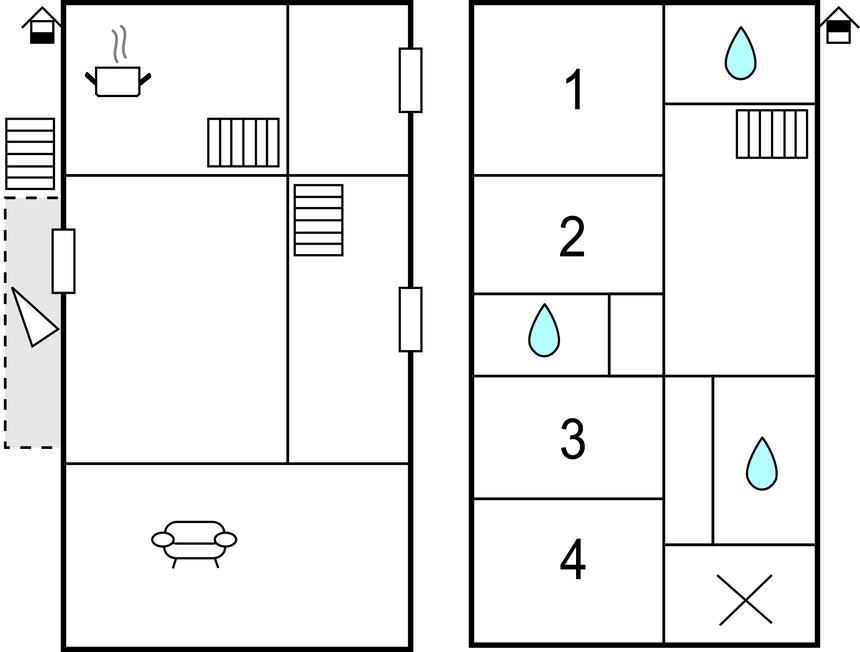 I stueetagen: opholdsstue med stor veranda med udsigt over gårdspladsen, rummelig stue med pejs, køkken og stor spisestue med pejs, hvorfra den eksklusive have (200 m²) er tilgængelig. Det udvendige område er indrettet med et bord, stole og en grill, ideel til udendørs spisning.