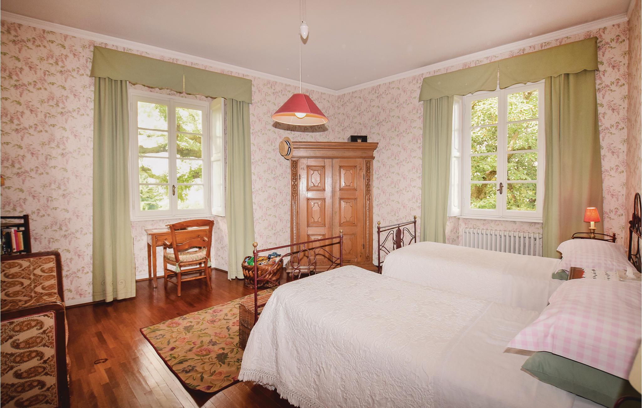 På første sal er der soveafdeling med stor lobby, en dobbeltsuite med eget badeværelse, to dobbeltværelser med fælles badeværelse og et fjerde soveværelse med to enkeltsenge og eget badeværelse.