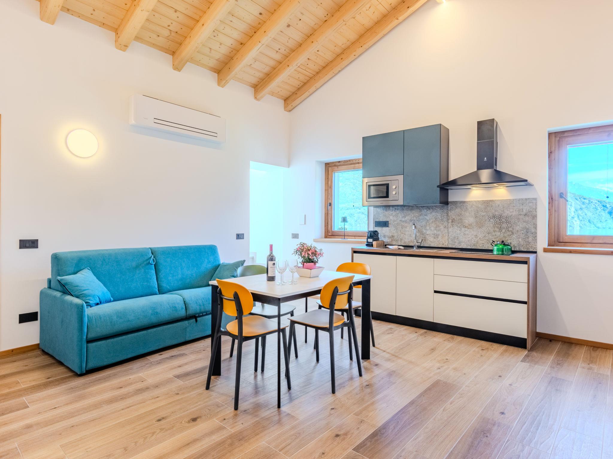 "Cigno", 3-room apartment 70 m2. Tasteful furnishings: open living/sleeping room with 1 double sofabed, dining table and TV. Exit to the terrace. 1 double bedroom. 1 room with 2 beds. Open kitchen (oven, dishwasher, 4 induction hot plates, toaster, kettle, microwave, electric coffee machine, Capsules for coffee machine (Nespresso) extra). Shower/bidet/WC. Air-conditioning, floor heating. Large terrace 20 m2. Terrace furniture. Marvellous view of the lake and the mountains. Facilities: children's high chair, baby cot for up to 2 year olds, hair dryer. Internet (WiFi, free). Parking (1 car). Please note: non-smokers only. Fire extinguisher. IT014075C2TVYZNZ9P