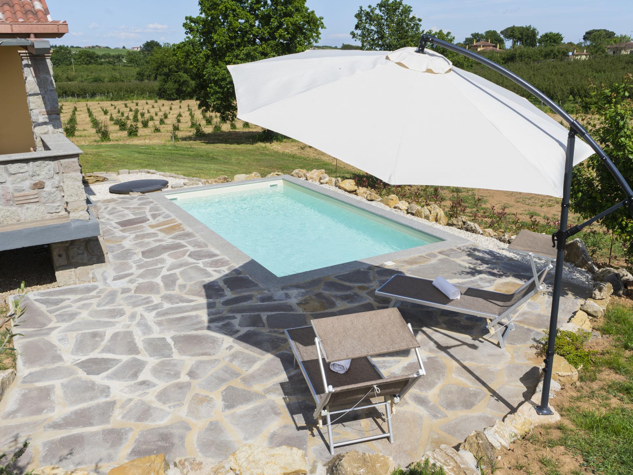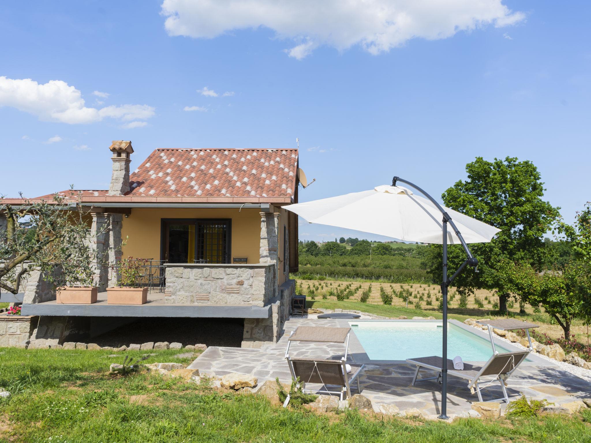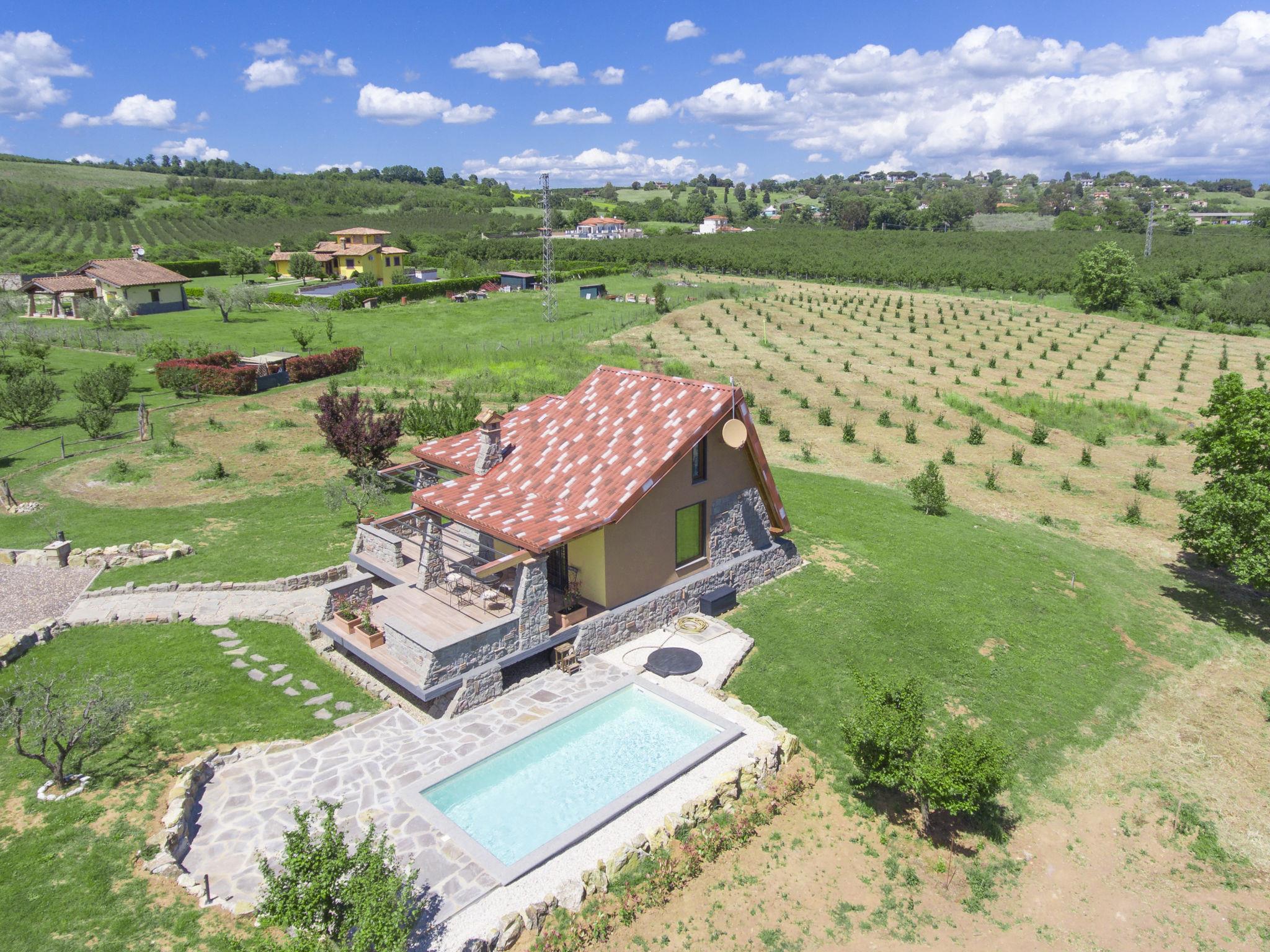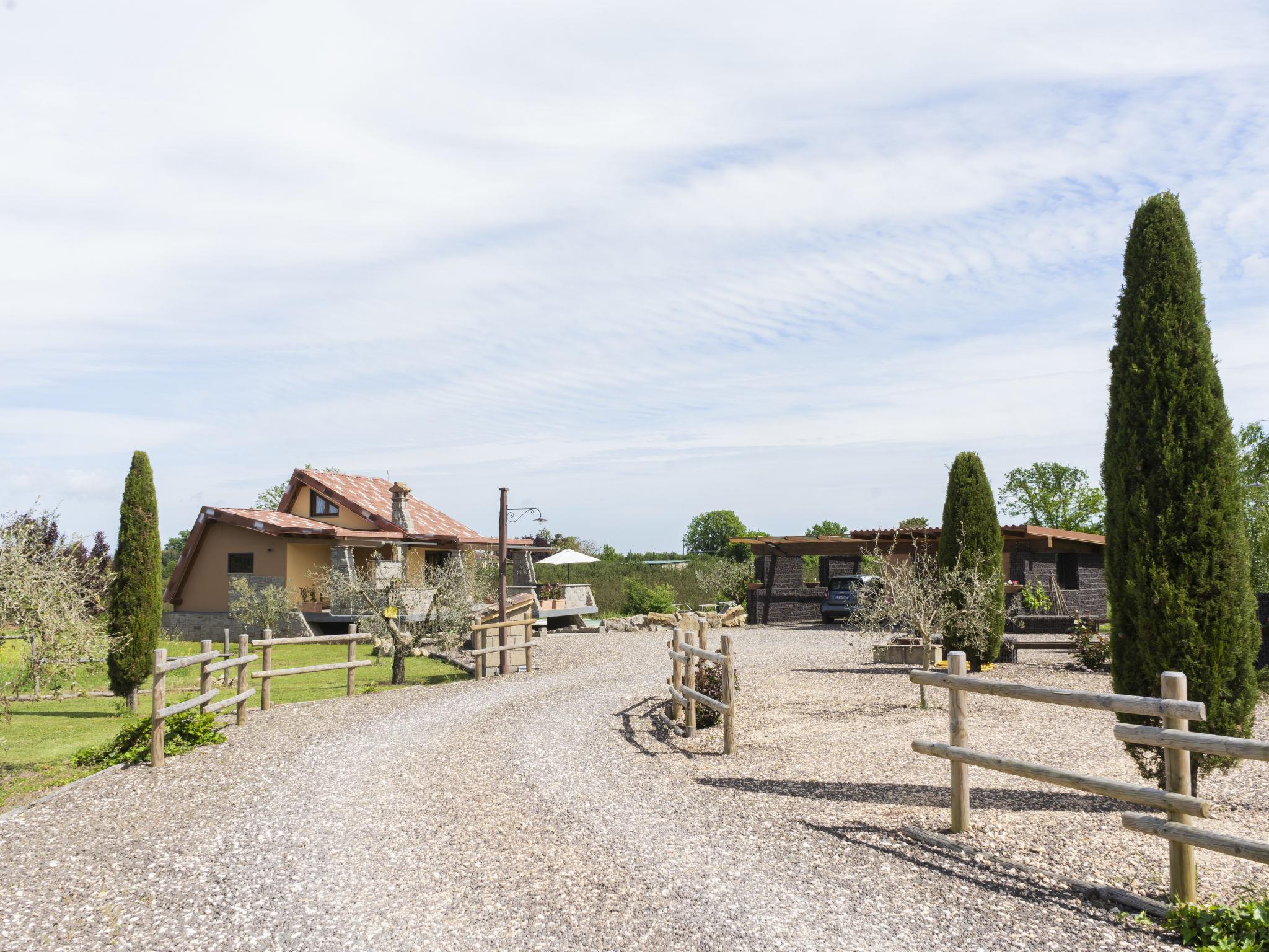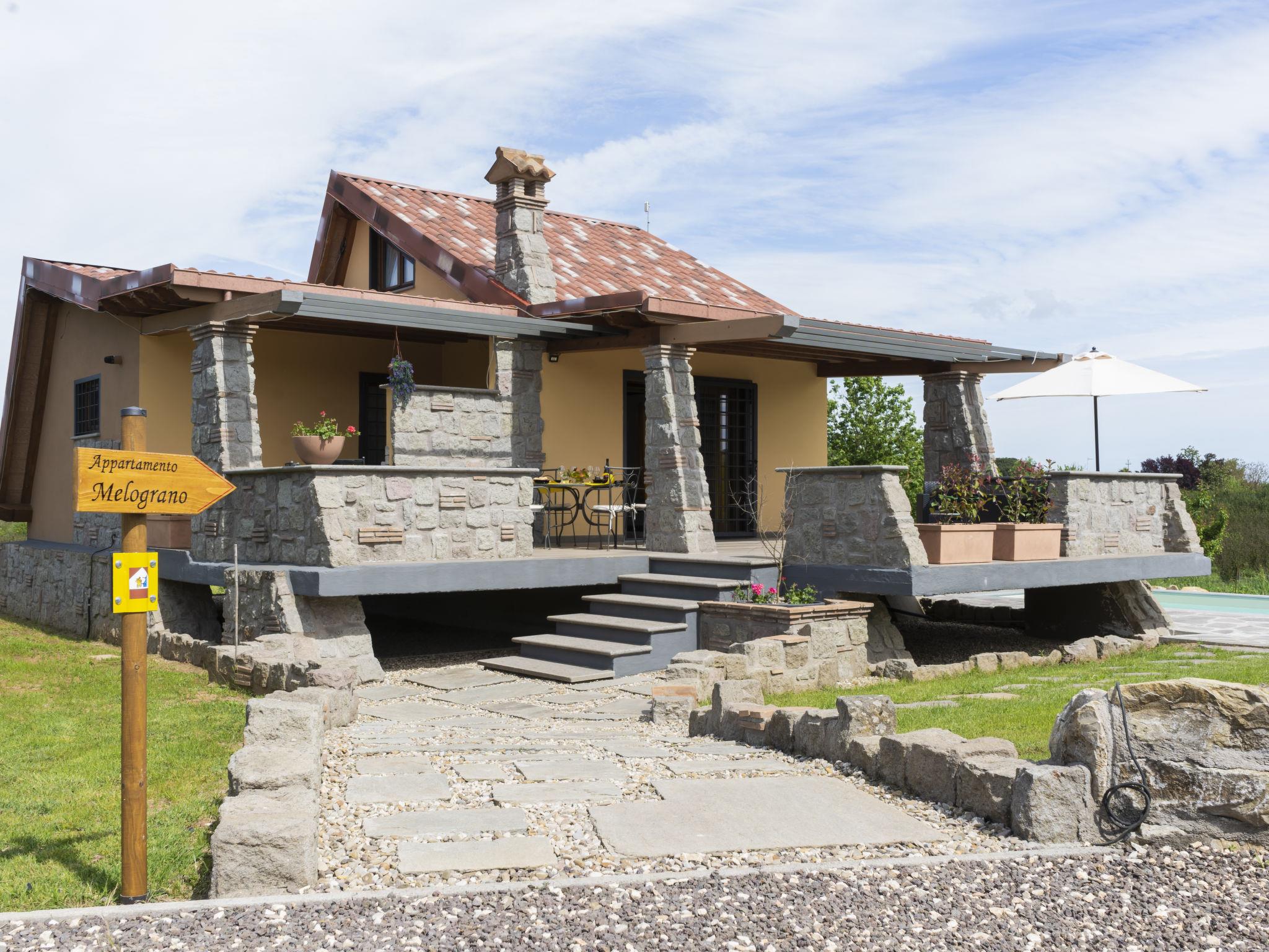 Modern, comfortable chalet "Melograno", detached. 2 houses in the resort. 3 km from the centre of Sutri, 50 km from the centre of Roma, 45 km from the sea, 12 km from the lake. For shared use: park 3 ha (fenced). Barbecue. Private: garden 500 m2, swimming pool (6 x 3 m, depth 130 cm, seasonal availability: 16.May. - 03.Oct.). Outdoor shower, garden furniture, pool maintenance by the owner/gardener. In the house: reception, relaxation room. Roofed, parking on the premises. E-charging station. Supermarket 2 km, bus stop 1.2 km, sandy beach "Santa Severa" 45 km, bathing lake "Lago Di Vico" 12 km. Golf course (18 hole) 7 km. Nearby attractions: Viterbo 30 km, Lado Di Bracciano 13 km. Local sale of farm products. Residence with electric gates.