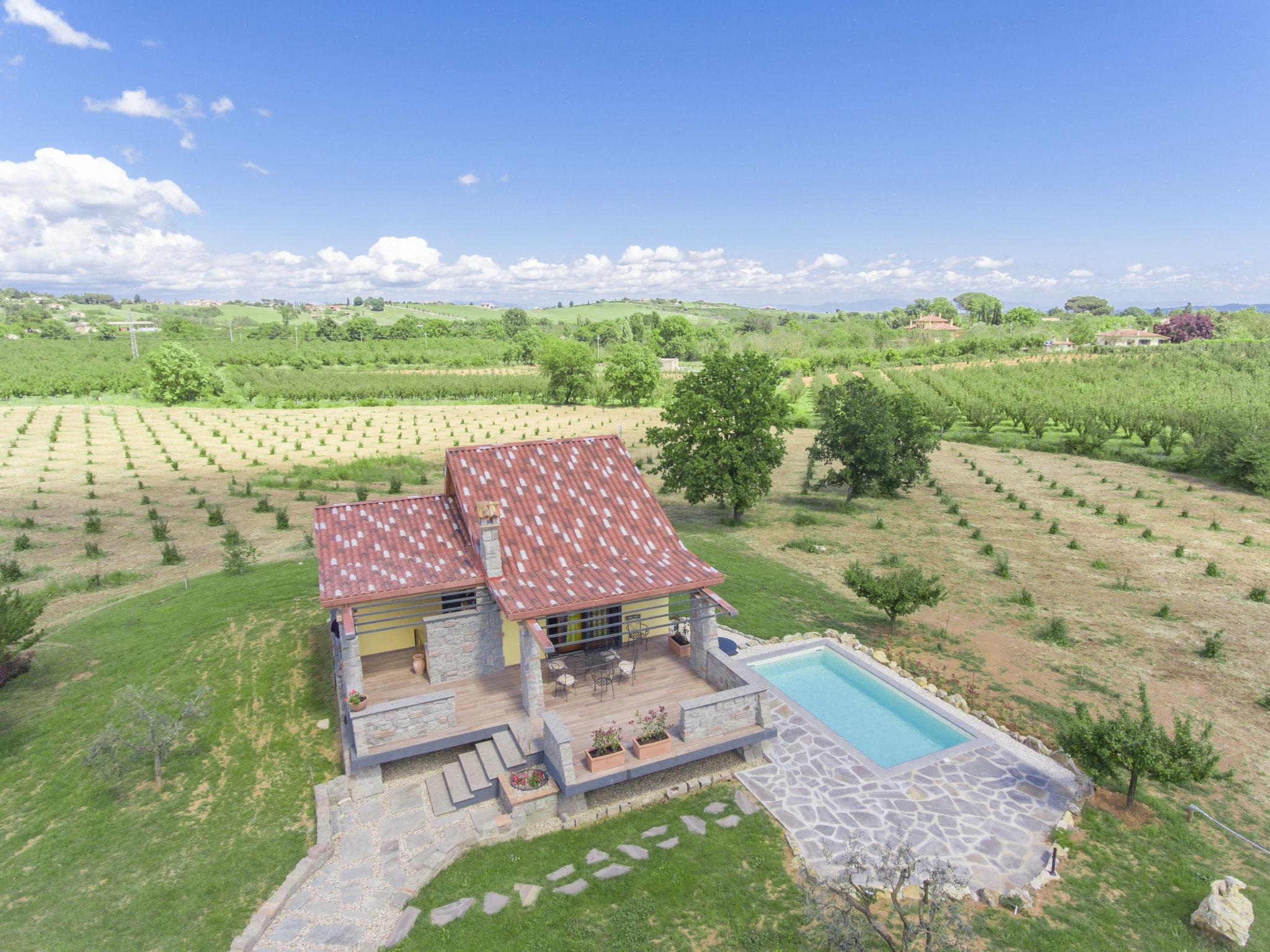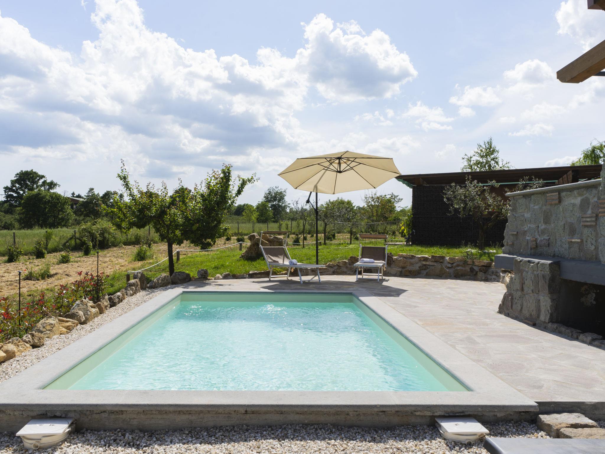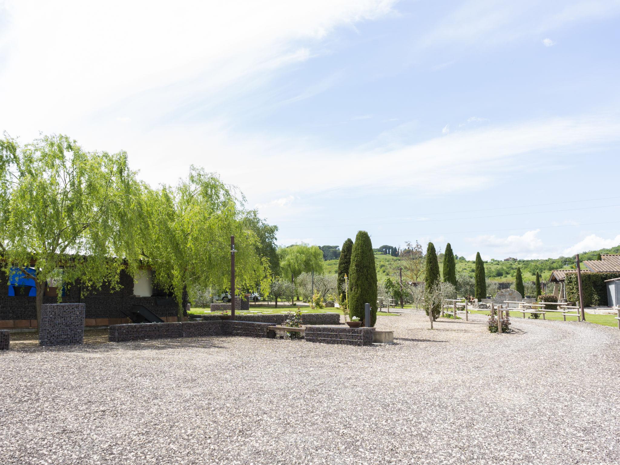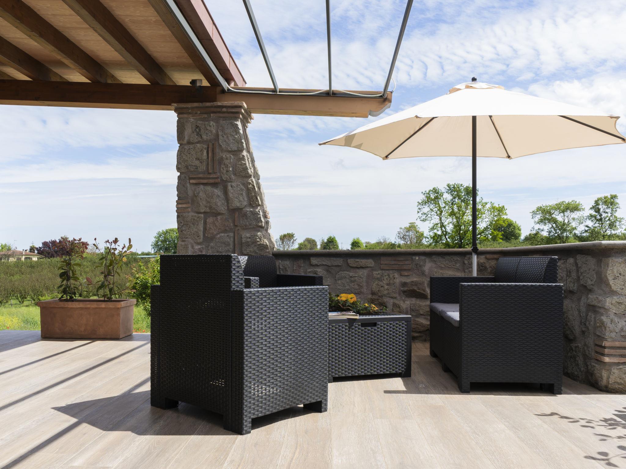 Modern, comfortable chalet "Melograno", detached. 2 houses in the resort. 3 km from the centre of Sutri, 50 km from the centre of Roma, 45 km from the sea, 12 km from the lake. For shared use: park 3 ha (fenced). Barbecue. Private: garden 500 m2, swimming pool (6 x 3 m, depth 130 cm, seasonal availability: 16.May. - 03.Oct.). Outdoor shower, garden furniture, pool maintenance by the owner/gardener. In the house: reception, relaxation room. Roofed, parking on the premises. E-charging station. Supermarket 2 km, bus stop 1.2 km, sandy beach "Santa Severa" 45 km, bathing lake "Lago Di Vico" 12 km. Golf course (18 hole) 7 km. Nearby attractions: Viterbo 30 km, Lado Di Bracciano 13 km. Local sale of farm products. Residence with electric gates.
