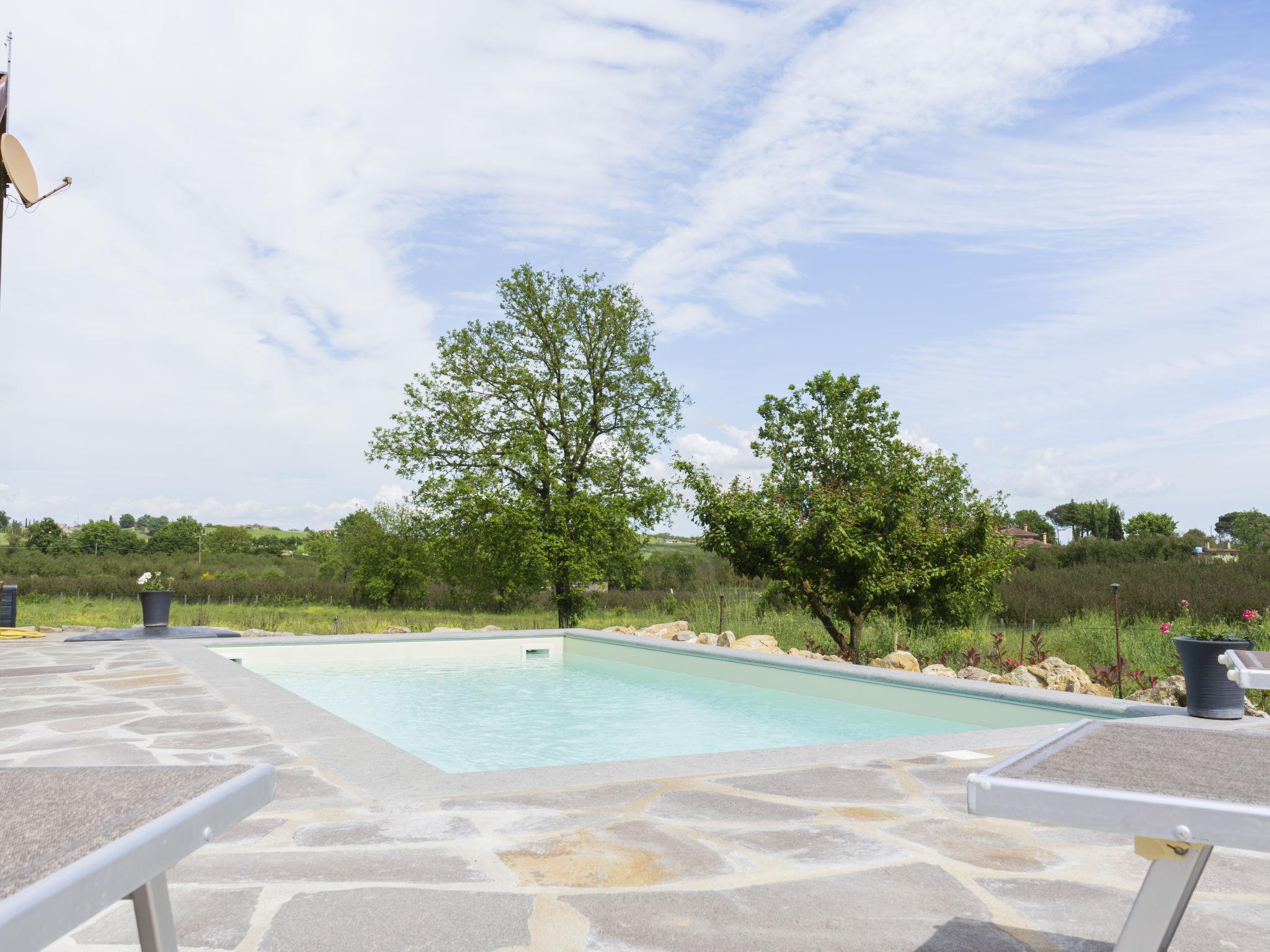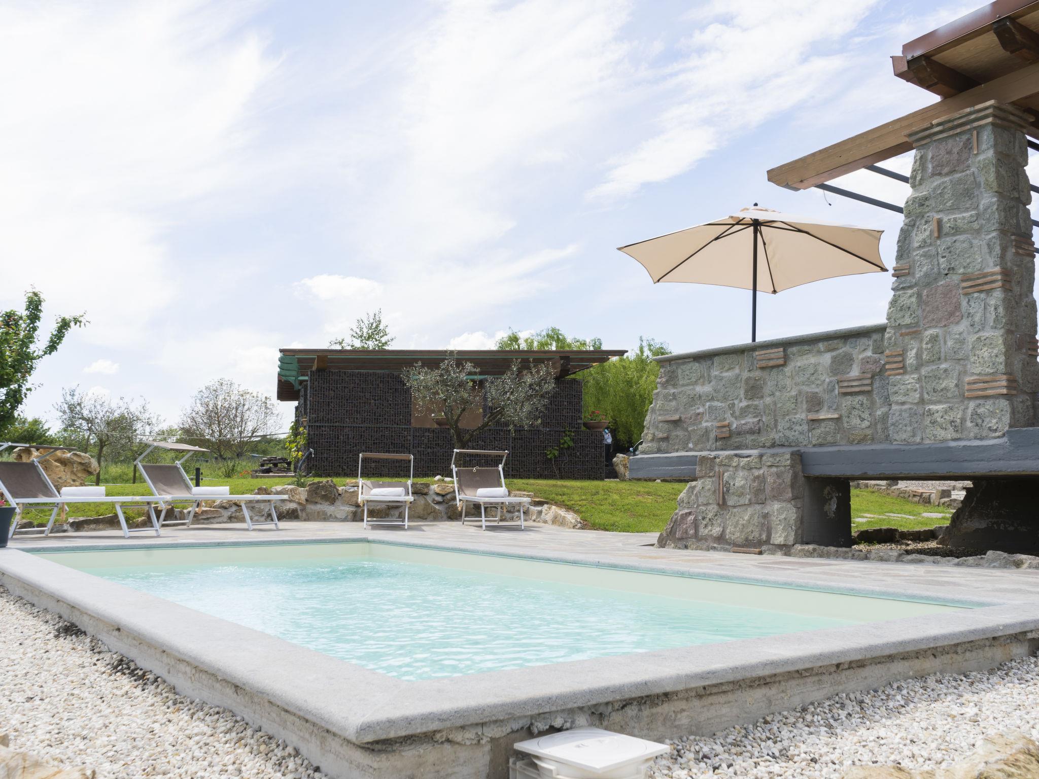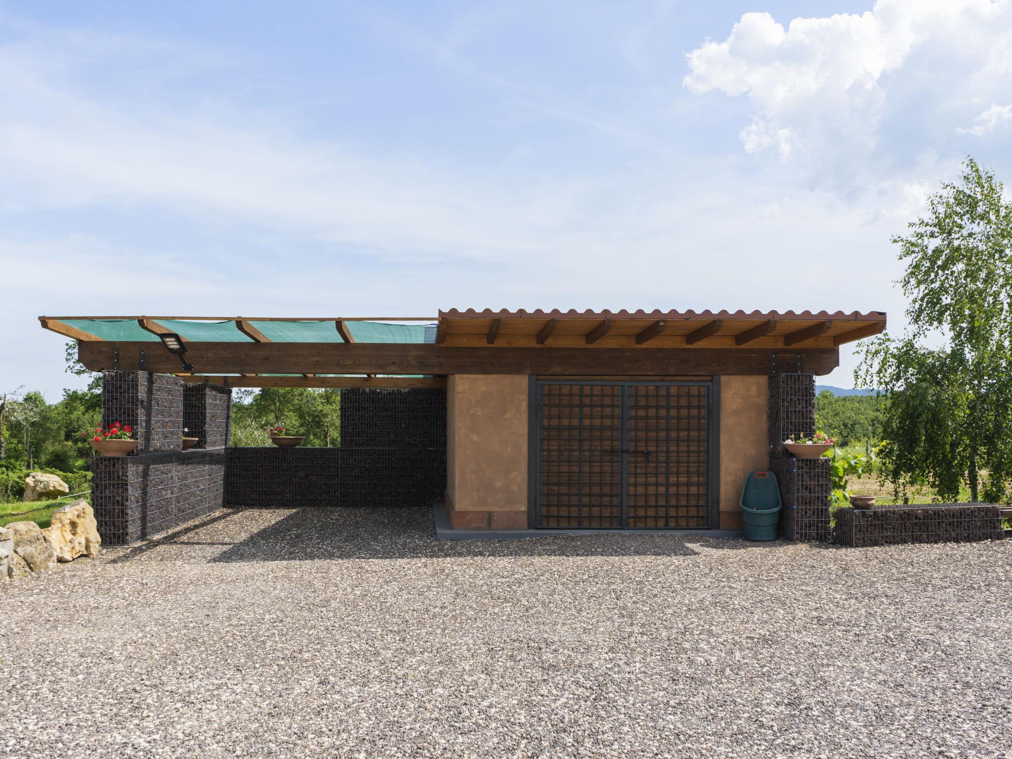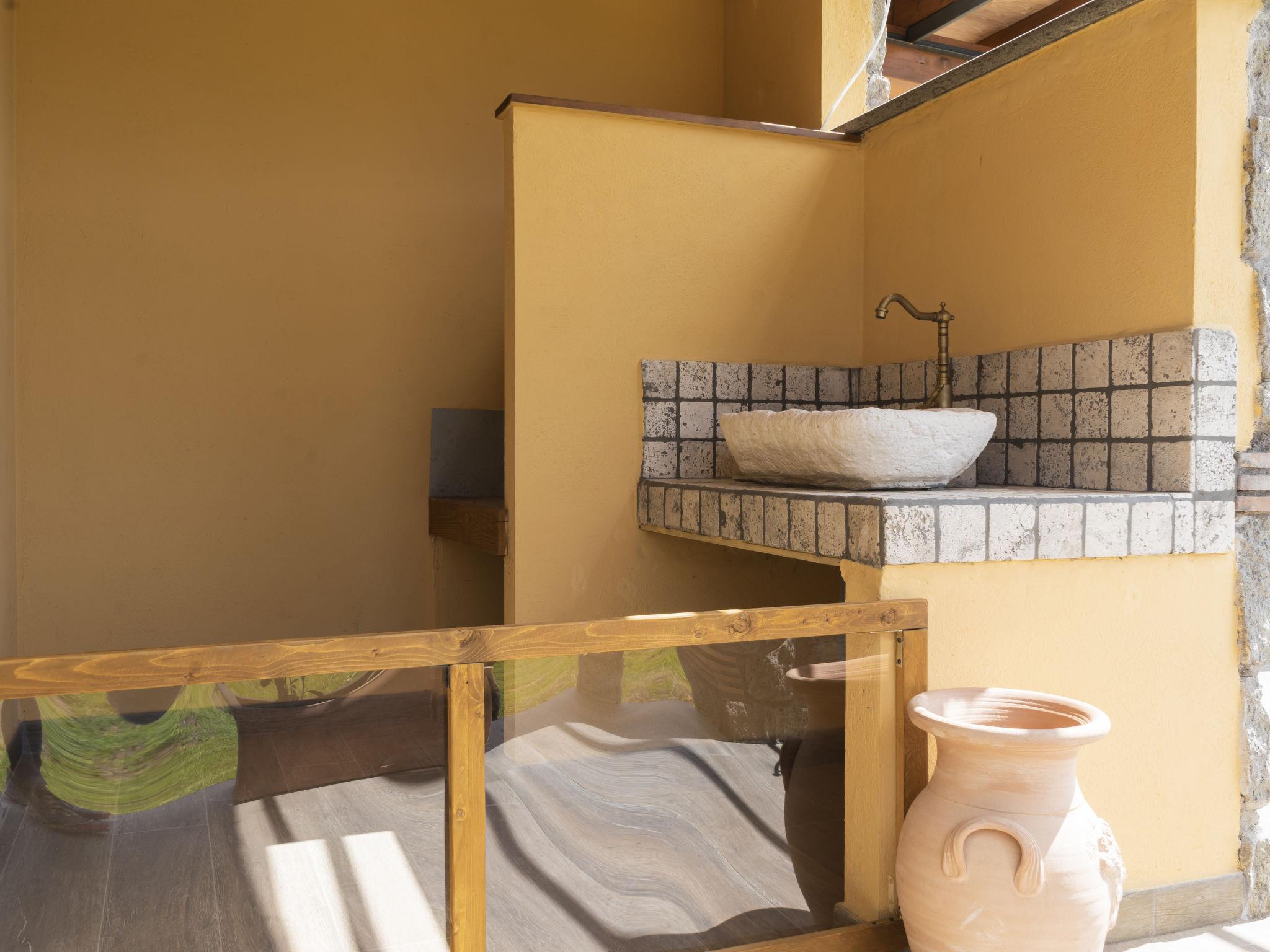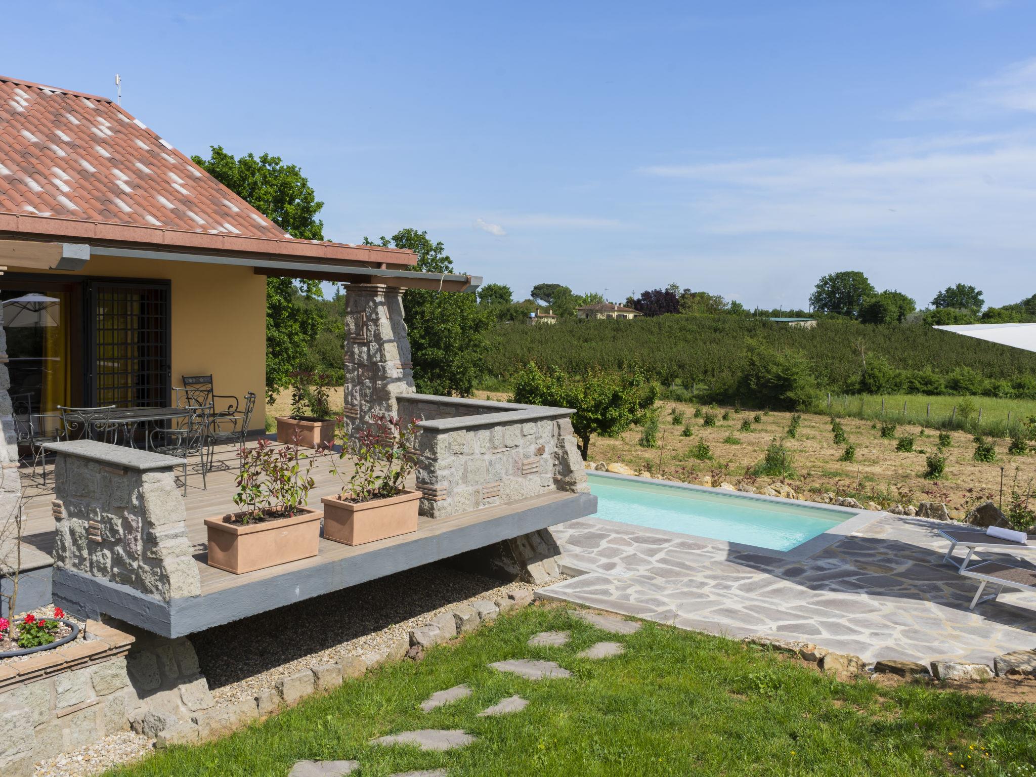 Modern, comfortable chalet "Melograno", detached. 2 houses in the resort. 3 km from the centre of Sutri, 50 km from the centre of Roma, 45 km from the sea, 12 km from the lake. For shared use: park 3 ha (fenced). Barbecue. Private: garden 500 m2, swimming pool (6 x 3 m, depth 130 cm, seasonal availability: 16.May. - 03.Oct.). Outdoor shower, garden furniture, pool maintenance by the owner/gardener. In the house: reception, relaxation room. Roofed, parking on the premises. E-charging station. Supermarket 2 km, bus stop 1.2 km, sandy beach "Santa Severa" 45 km, bathing lake "Lago Di Vico" 12 km. Golf course (18 hole) 7 km. Nearby attractions: Viterbo 30 km, Lado Di Bracciano 13 km. Local sale of farm products. Residence with electric gates.