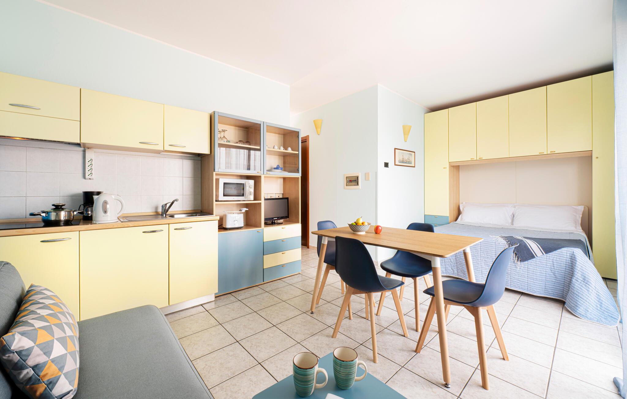 Opholdsstue/køkken - 2 Sovepladser. (Dobbeltseng(e)). 2 Sovepladser. (Sofa, madras eller lignende).